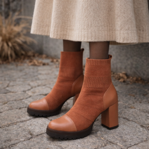 Cecconello Bota Salto Alto Couro E Knit Whisky