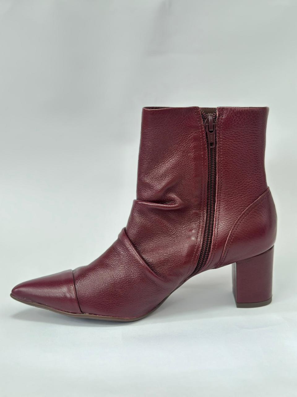 Sinta o poder em cada passo com a nossa Bota Cano Curto em Couro Slouchy Bordô. Este modelo une a tendência do efeito enrugado (slouchy) com a elegância clássica do bico fino, criando um visual moderno e refinado.