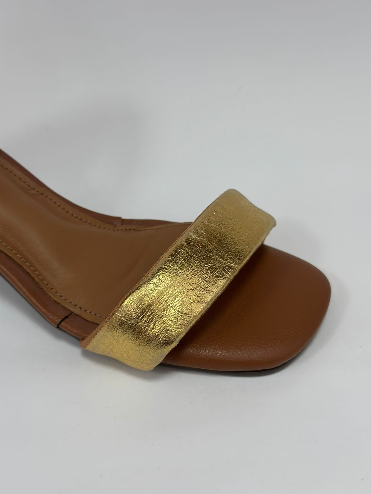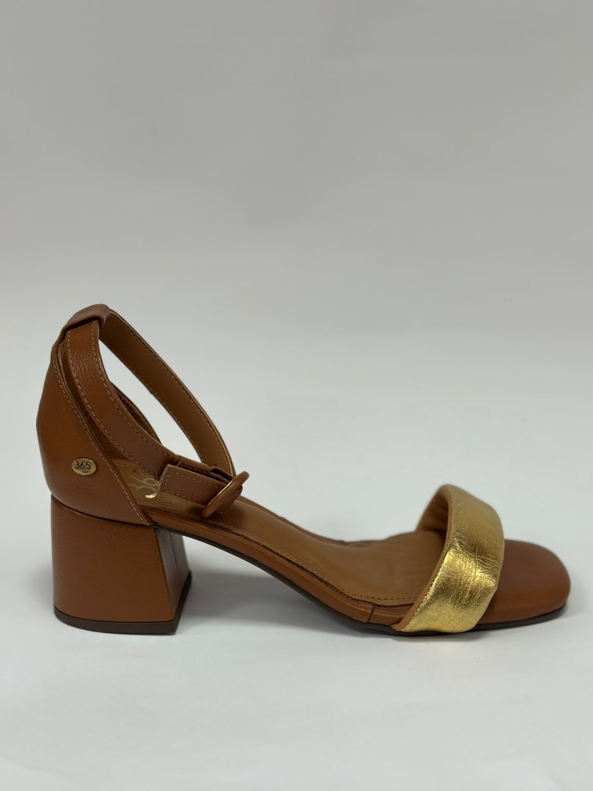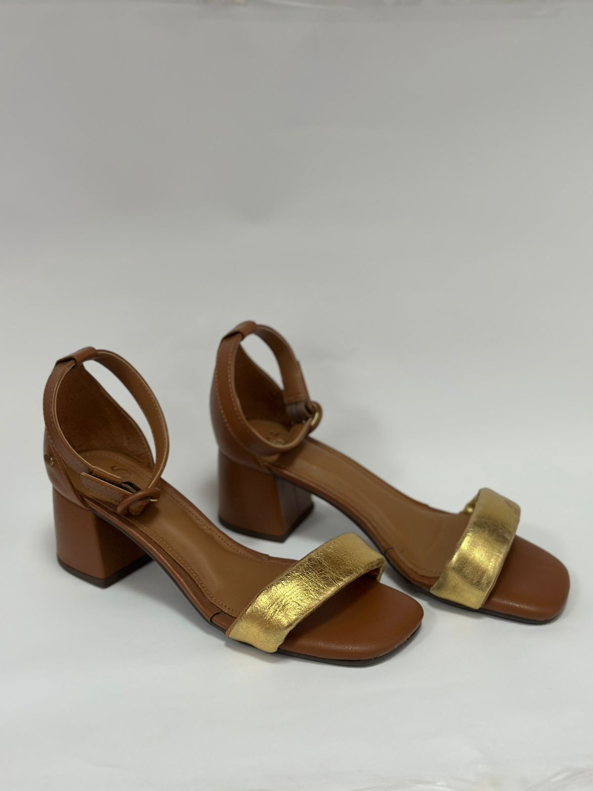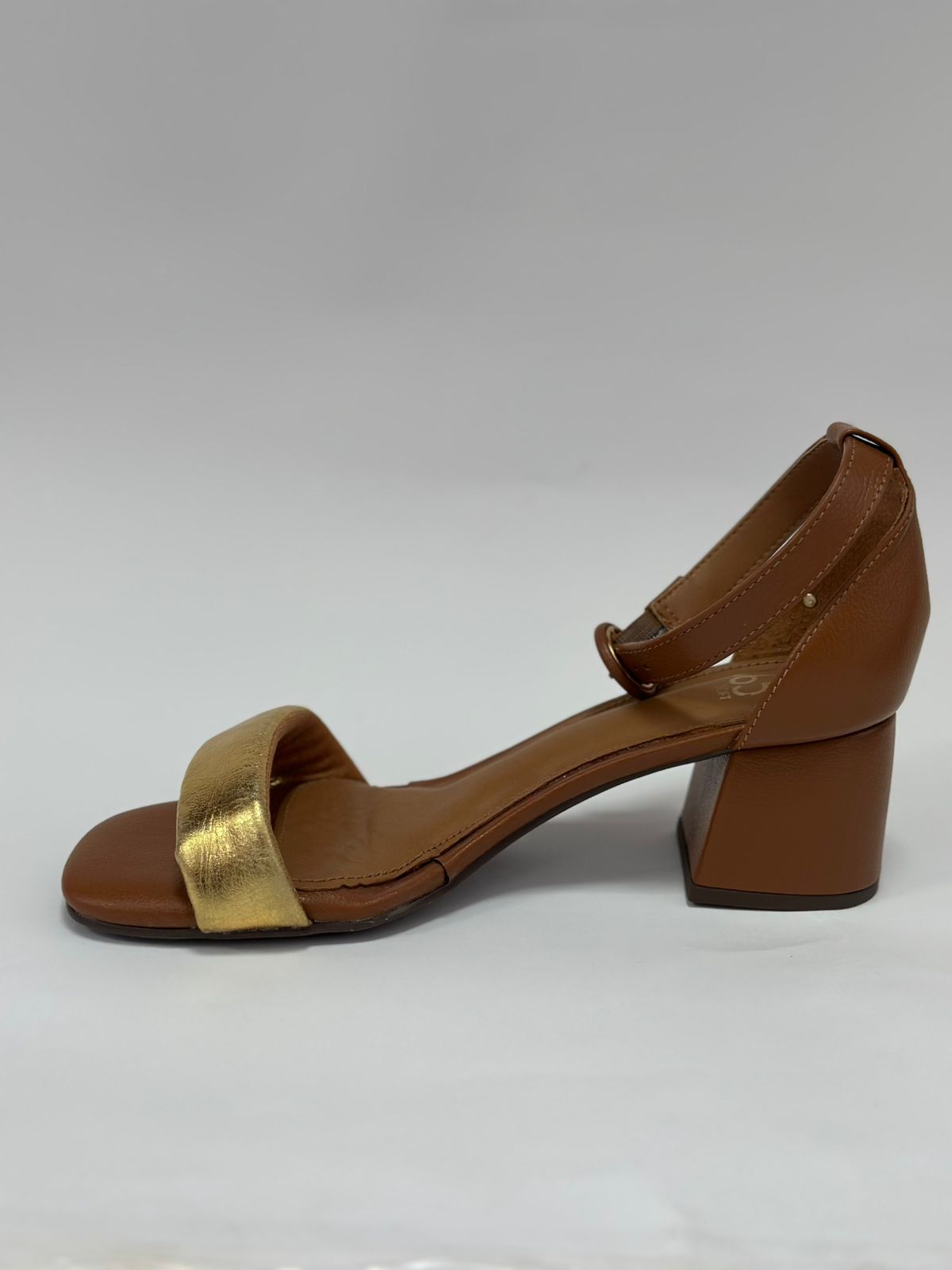 Elegante e atemporal, esta sandália em couro é a escolha ideal para quem busca sofisticação sem abrir mão do conforto. Confeccionada em couro legítimo, ela combina a suavidade do tom caramelo com a tira frontal em couro metalizado, trazendo um toque moderno e refinado ao visual. O salto bloco garante estabilidade e conforto ao caminhar, enquanto a tira no tornozelo proporciona ajuste seguro e firme aos pés.