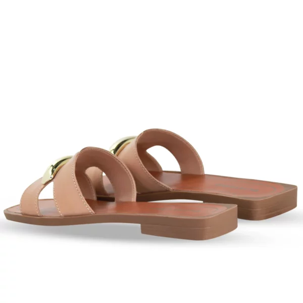 Sandália rasteira em couro atanado napoli brown sugar. De solado rasteiro bege. Gáspea com recortes nas laterais e enfeite de metal dourado.