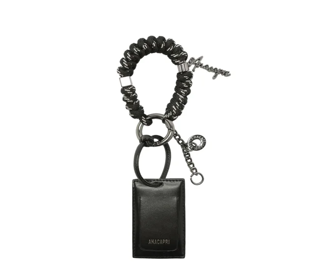 Bag charm chaveiro, com espelho, na cor preta. O modelo de material similar ao couro possui shape retangular, que contempla espelho – com tampa e assinatura Anacapri em relevo. Apresenta arremate metálico com alcinha em atacador e correntaria metálica, com passadores em pins metálicos de shapes e tamanhos diversos, exclusivos Anacapri. O acessório pode ser adicionado em bolsas e mochilas, ou usado separadamente, como chaveiro.