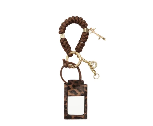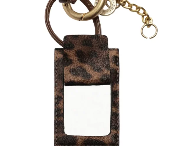 Bag charm chaveiro, com espelho, em estampa animal print. O modelo de material similar ao couro, com estampa animal print de oncinha, possui shape retangular, que contempla espelho – com tampa e assinatura Anacapri em relevo. Apresenta arremate metálico com alcinha em atacador e correntaria metálica, com passadores em pins metálicos de shapes e tamanhos diversos, exclusivos Anacapri. O acessório pode ser adicionado em bolsas e mochilas, ou usado separadamente, como chaveiro.