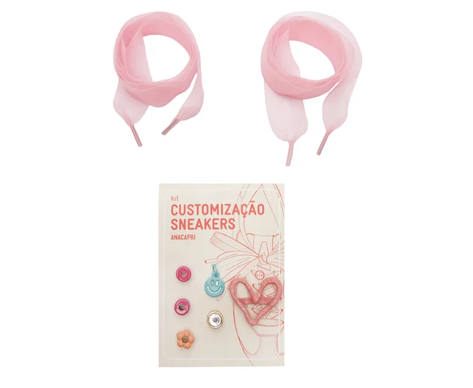 Kit personalizável Anacapri, na cor rosa. O kit foi idealizado para customizar o estilo do tênis. Contém um cadarço em tecido voil com transparência e um conjunto de seis pingentes metálicos em diversos tamanhos. O kit é vendido separadamente do tênis.