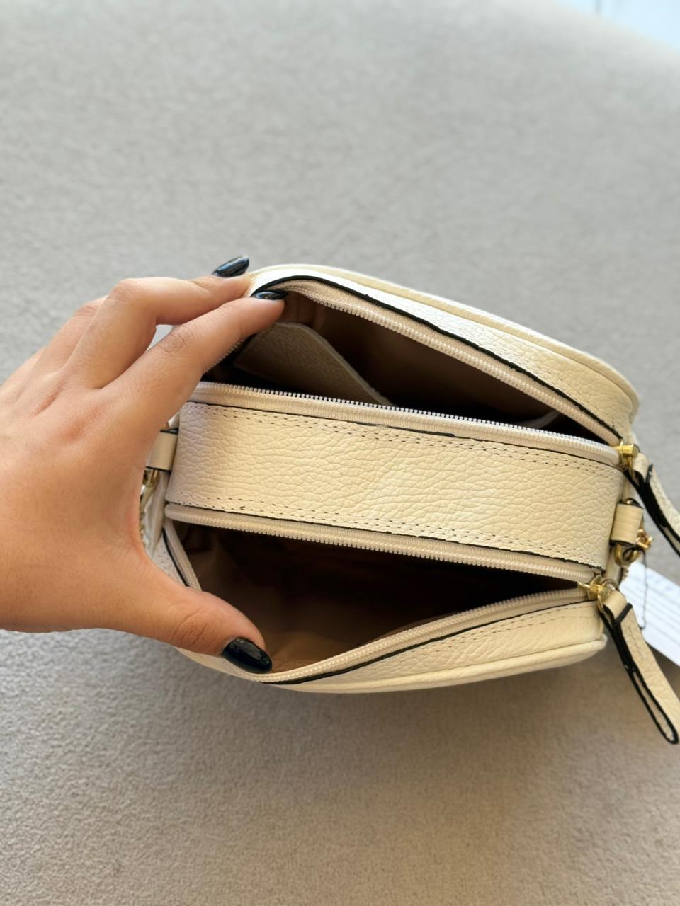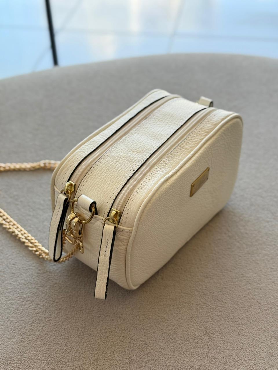 Aquarela Bolsa Cris confeccionada em couro legítimo, com textura marcante e toque macio que transmite sofisticação em cada detalhe. O design compacto e estruturado é perfeito para quem busca leveza e praticidade no dia a dia, enquanto a alça em corrente dourada adiciona um toque moderno e elegante à produção. Possui dois compartimentos com fechamento em zíper, garantindo organização e segurança para os itens essenciais. Uma peça versátil, delicada e atemporal, ideal para acompanhar desde produções casuais até looks mais refinados.