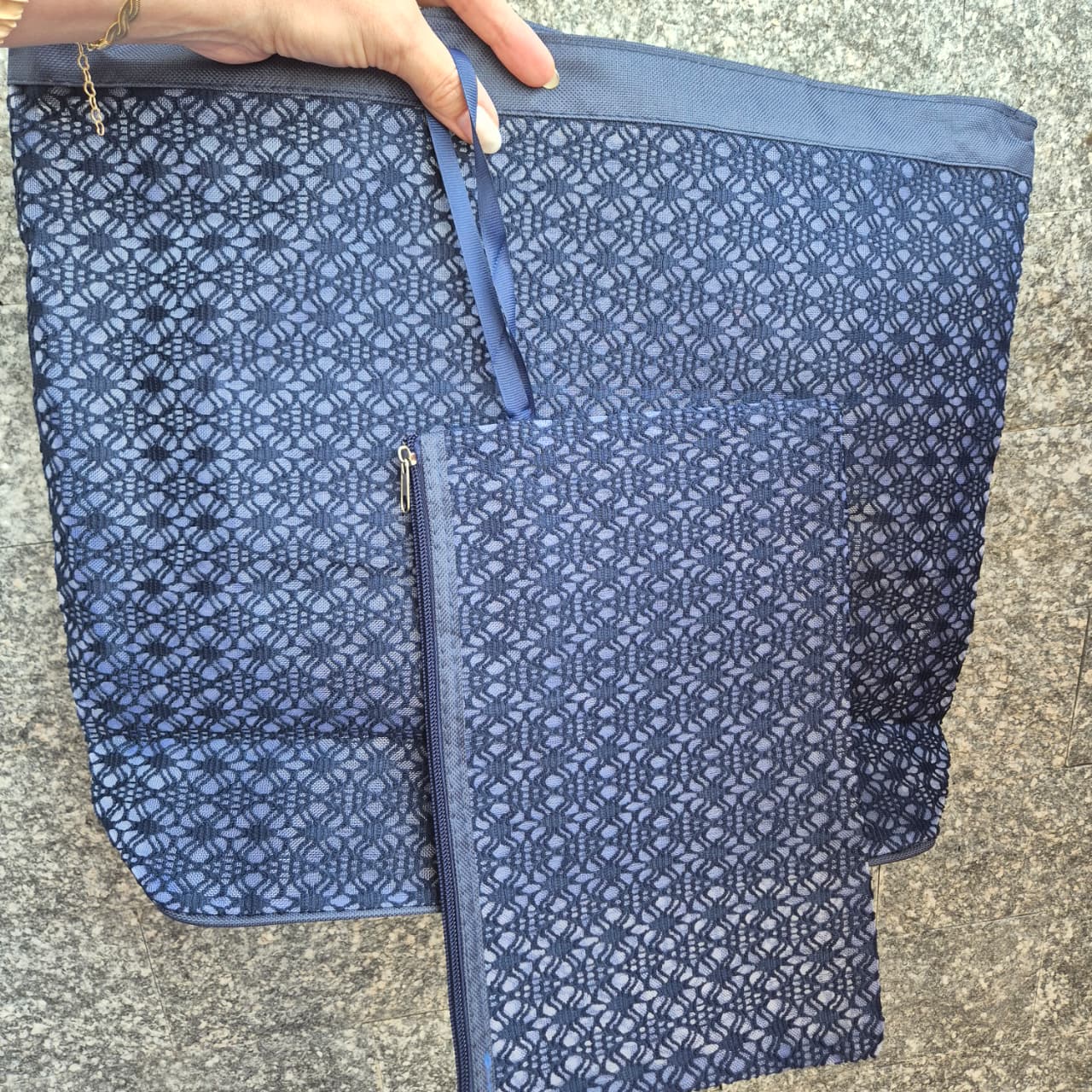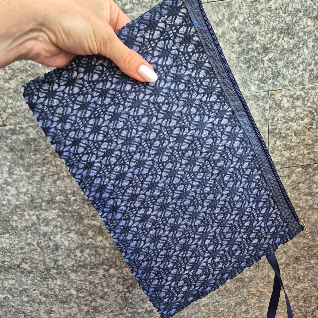 O Kit Bolsa + Necessaire traz a combinação perfeita entre leveza, espaço e um visual moderno com efeito rendado em tom azul profundo.