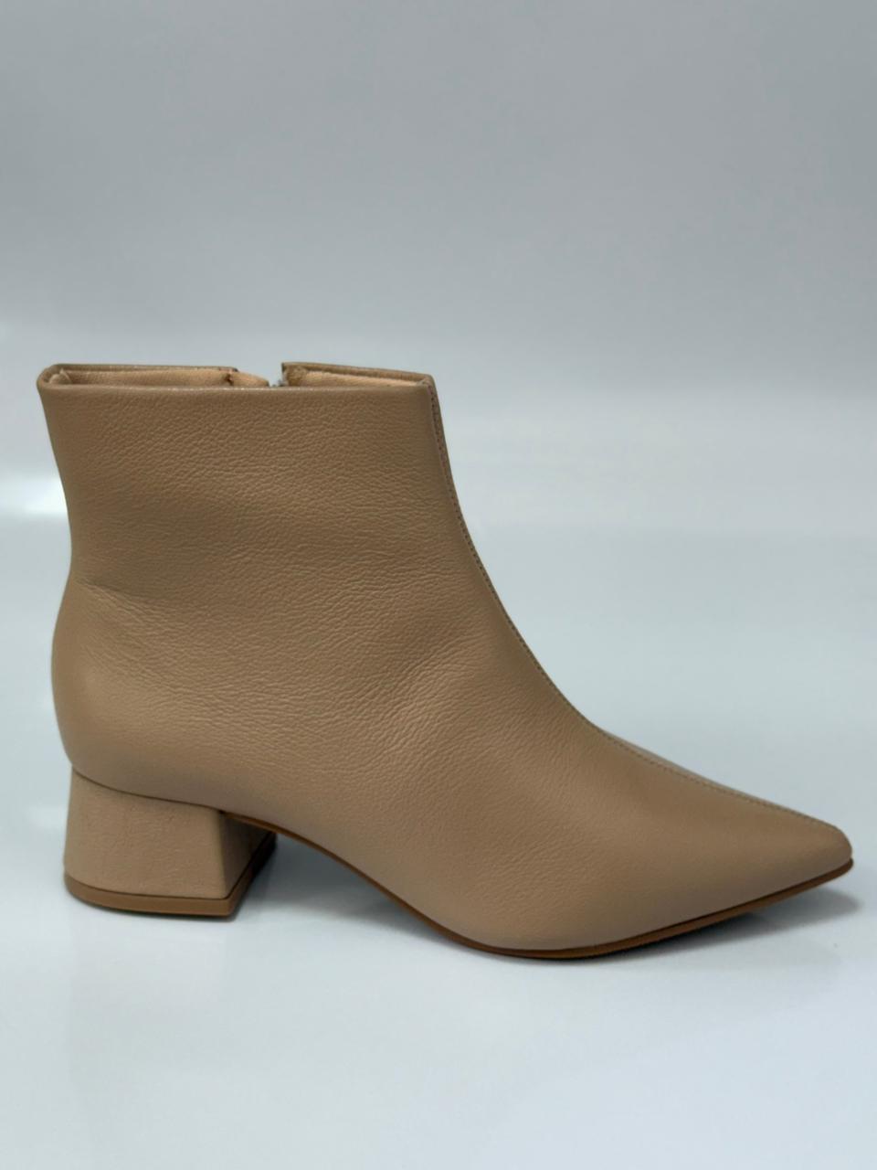 Este modelo é confeccionado em couro de alta qualidade, apresentando uma textura levemente granulada que confere resistência e um toque sofisticado. Com um design clean e minimalista na cor nude (bege), a bota possui bico fino e um salto bloco baixo revestido no mesmo material, criando uma unidade visual elegante. O fechamento por zíper lateral garante um calce rápido e prático, enquanto o acabamento interno acolchoado oferece o máximo de conforto para o uso contínuo.