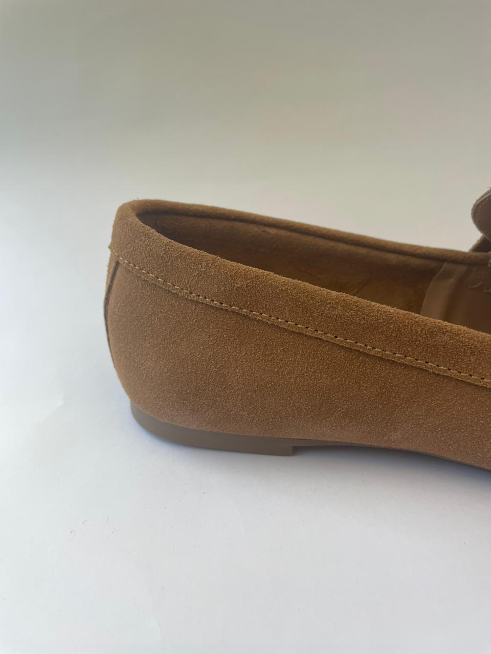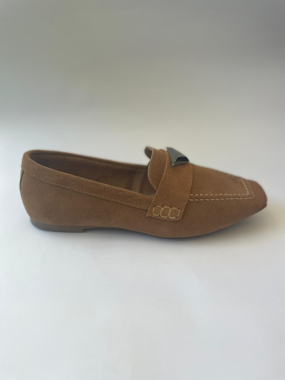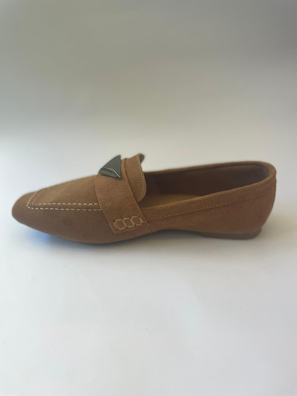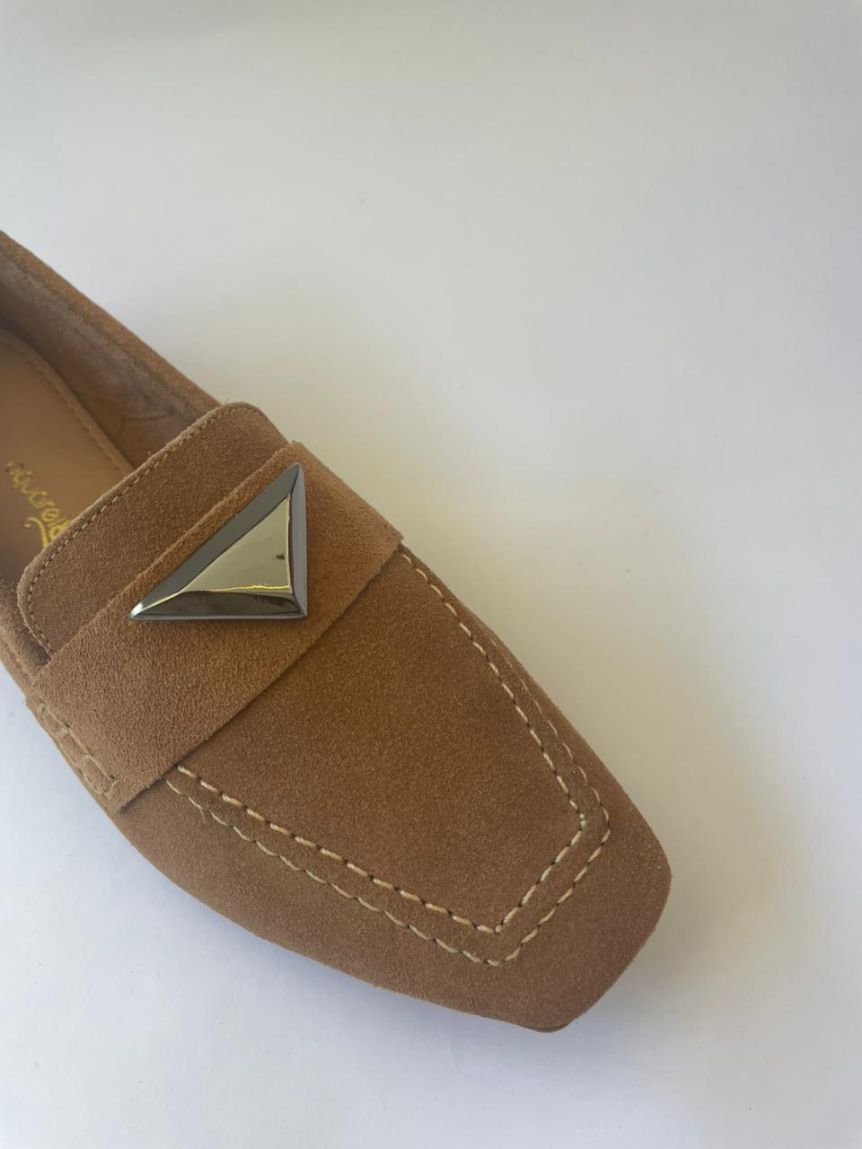 Mocassim ferrugem em camurça, com acabamento delicado e detalhe de metal piramidal que adiciona modernidade ao design clássico. O modelo conta com costura aparente em contraste, sola baixa confortável e um tom sofisticado que traz frescor e elegância às produções.