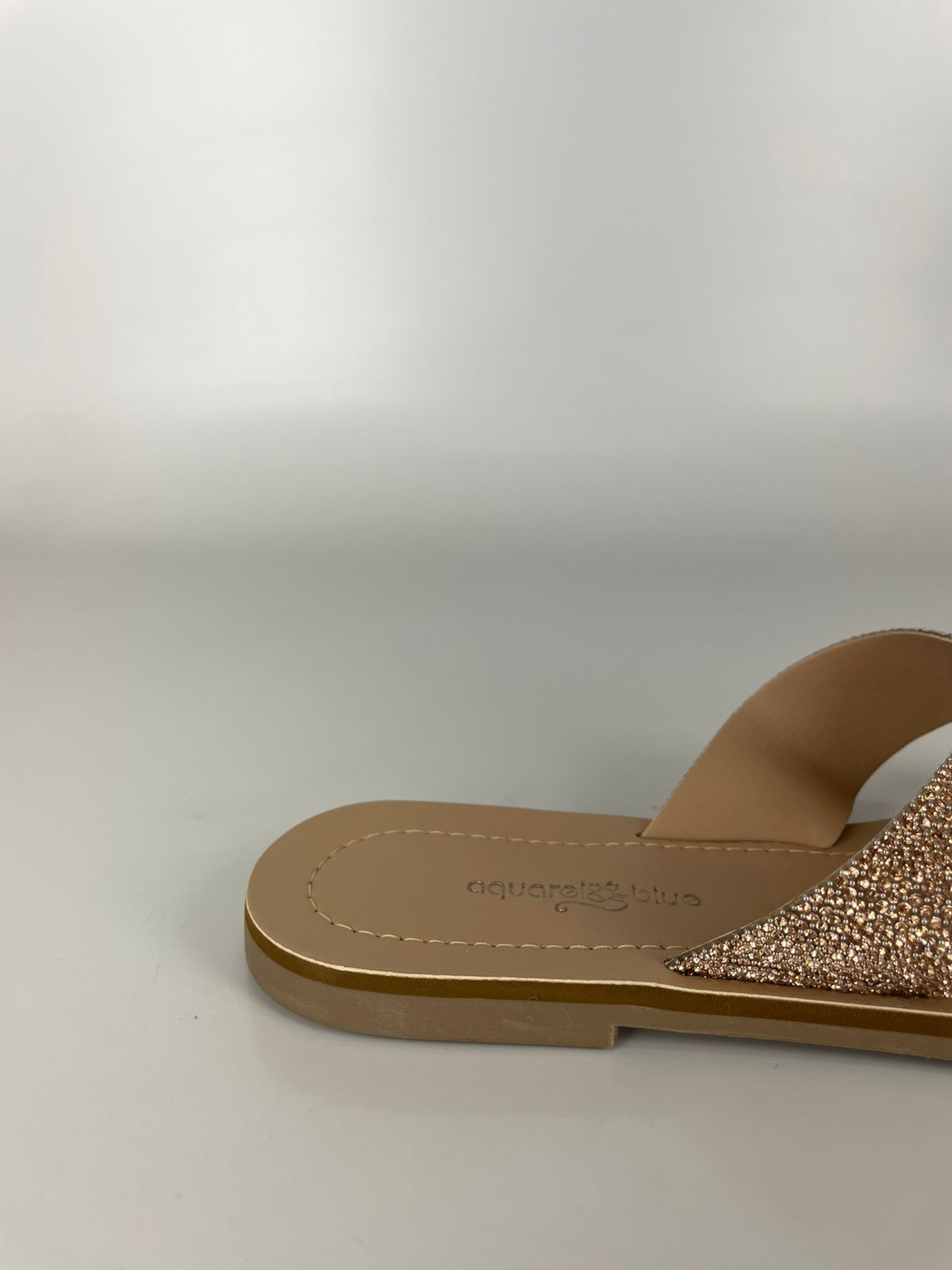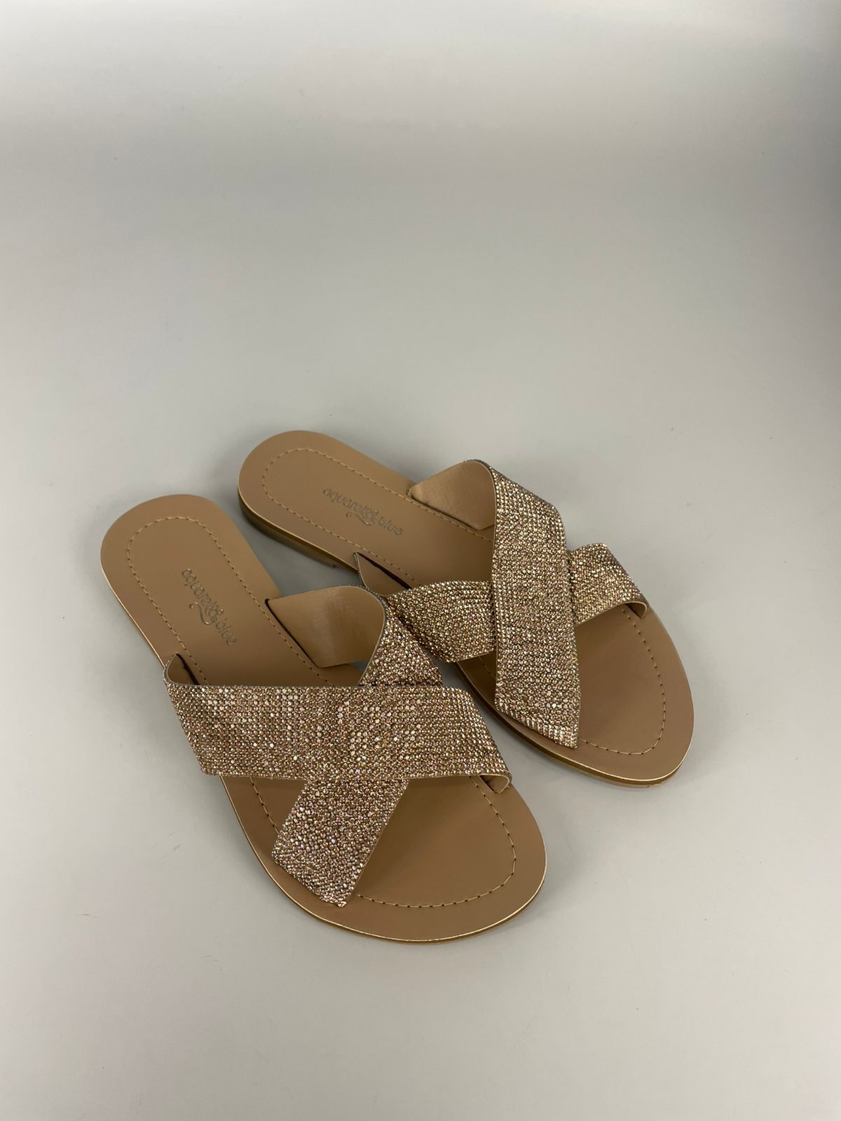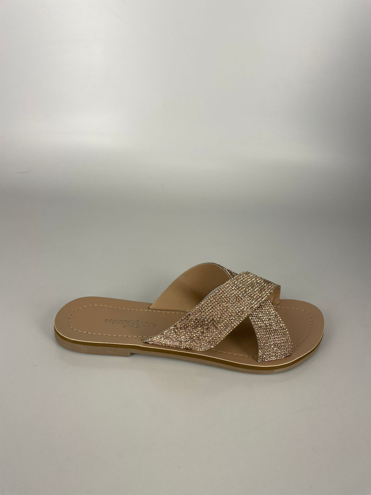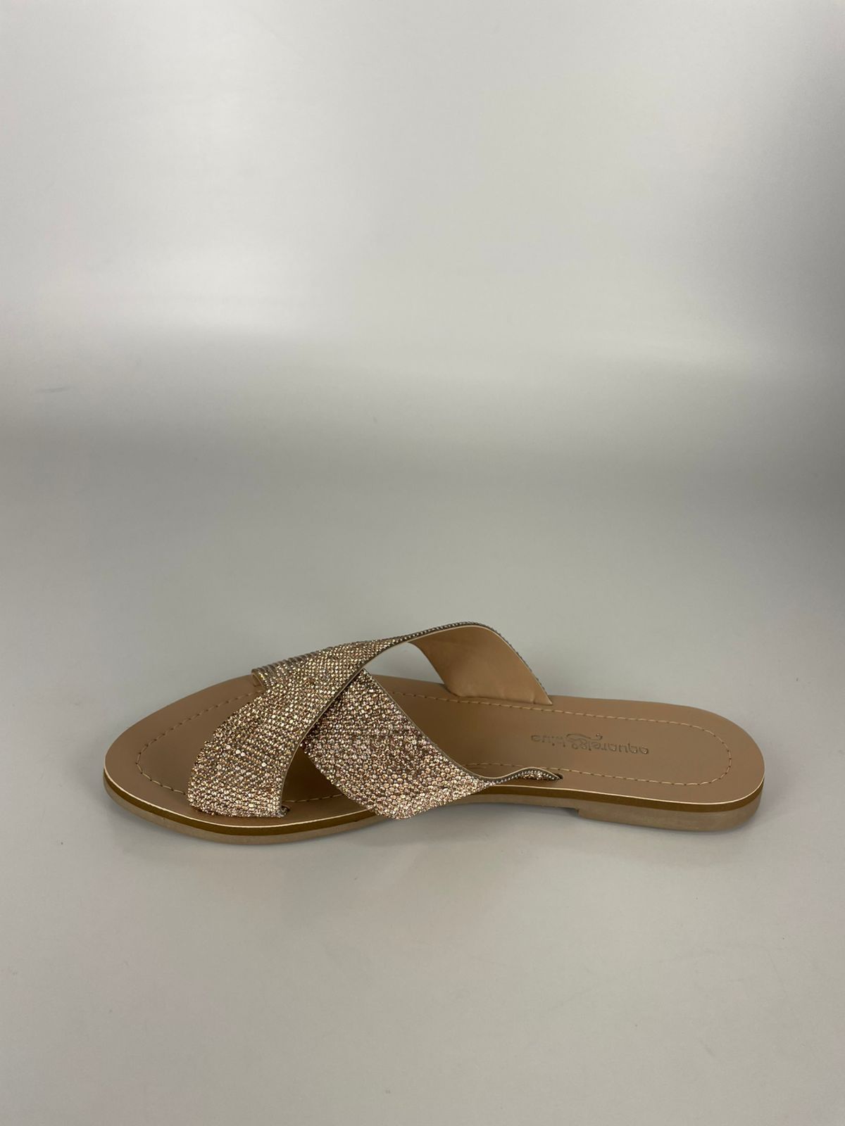 Com tiras largas cruzadas e aplicação de pedrarias reluzentes, a Rasteira Aquarela traz o toque certo de glamour para o dia a dia.