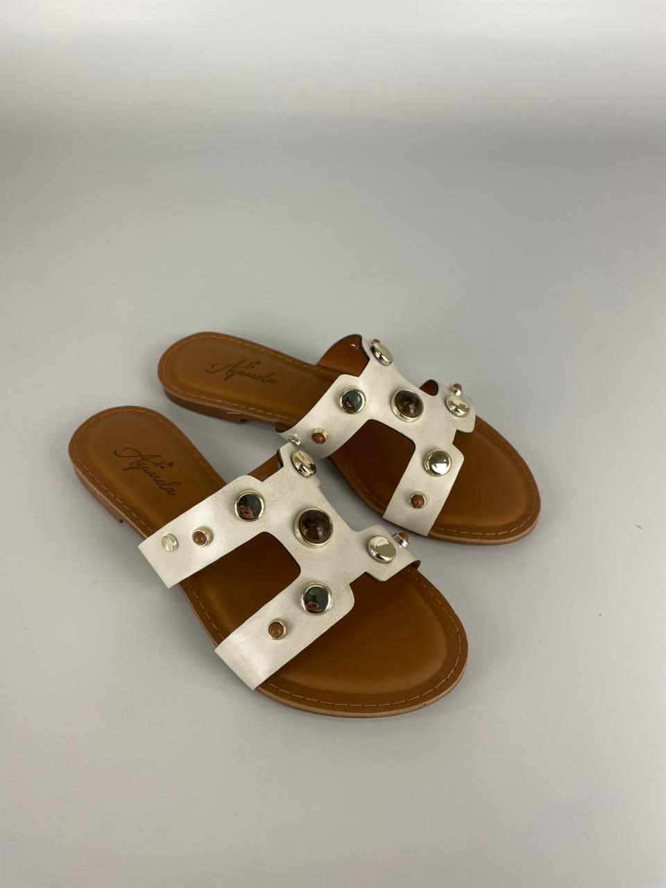 A rasteira Aquarela em tom off white combina o design moderno das tiras largas com aplicações metálicas e cristais delicados, criando um visual sofisticado e cheio de estilo.