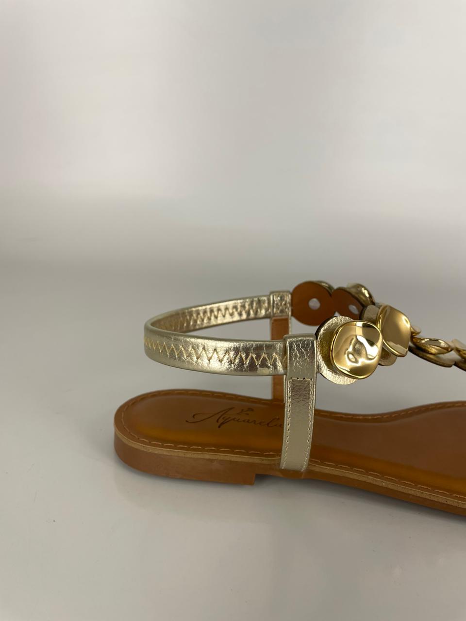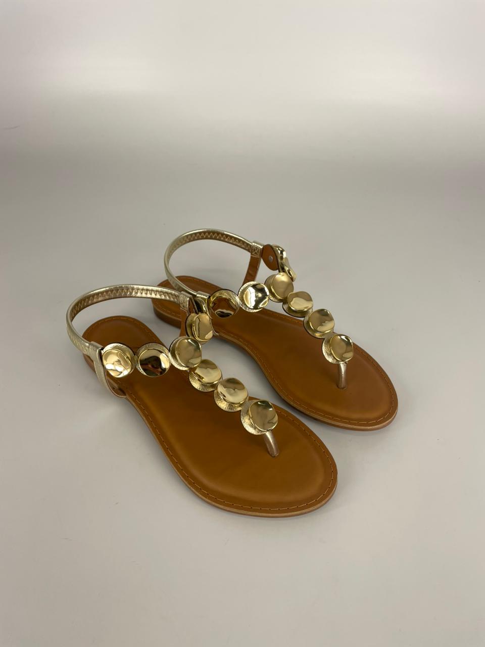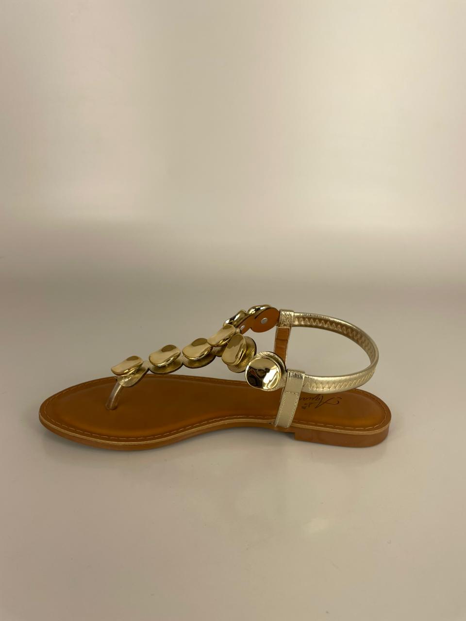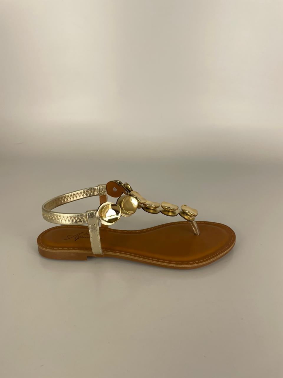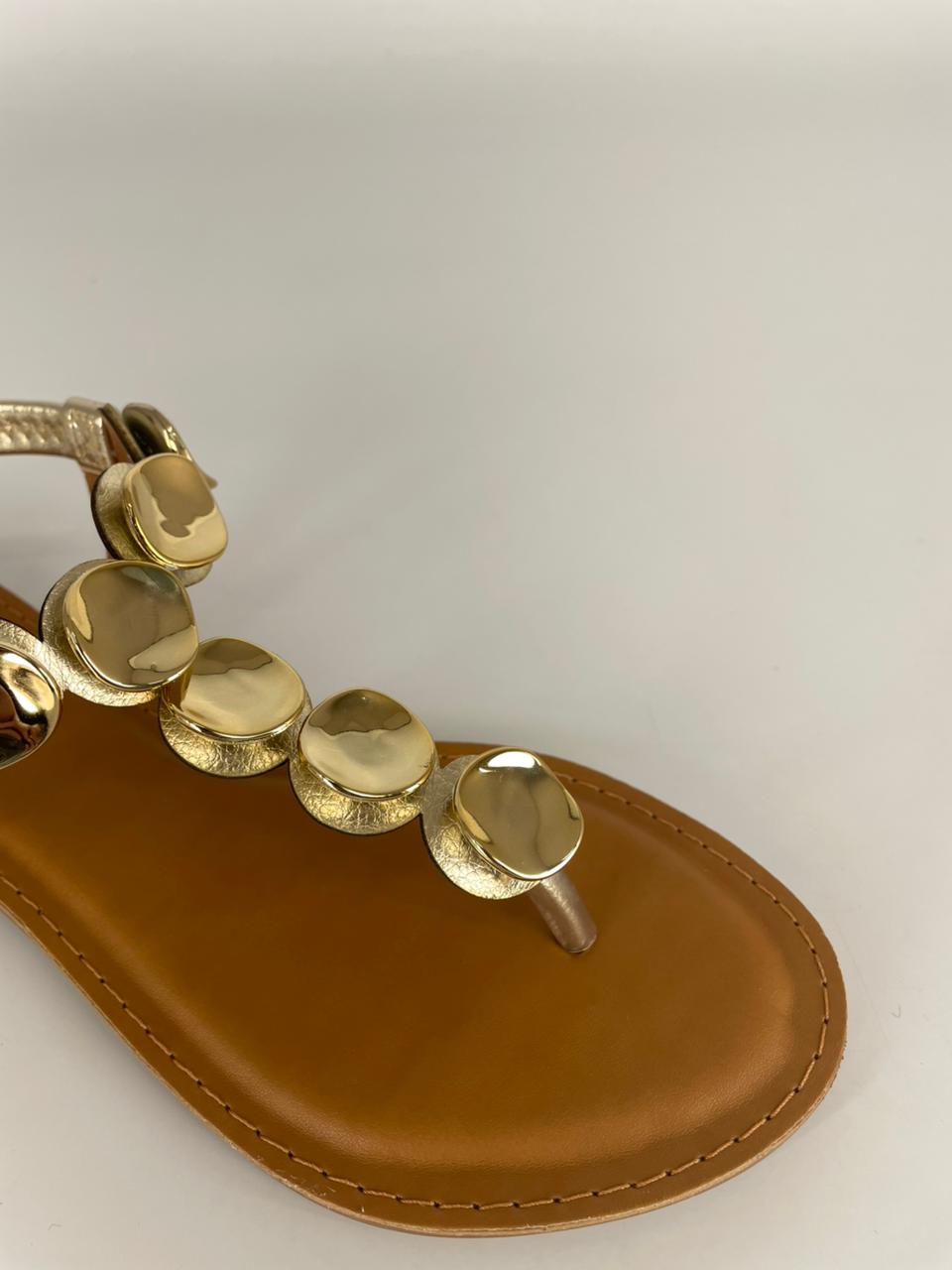 A rasteira Aquarela chega em tom dourado metalizado, com tiras delicadas e esferas espelhadas que refletem a luz de forma sutil e sofisticada.