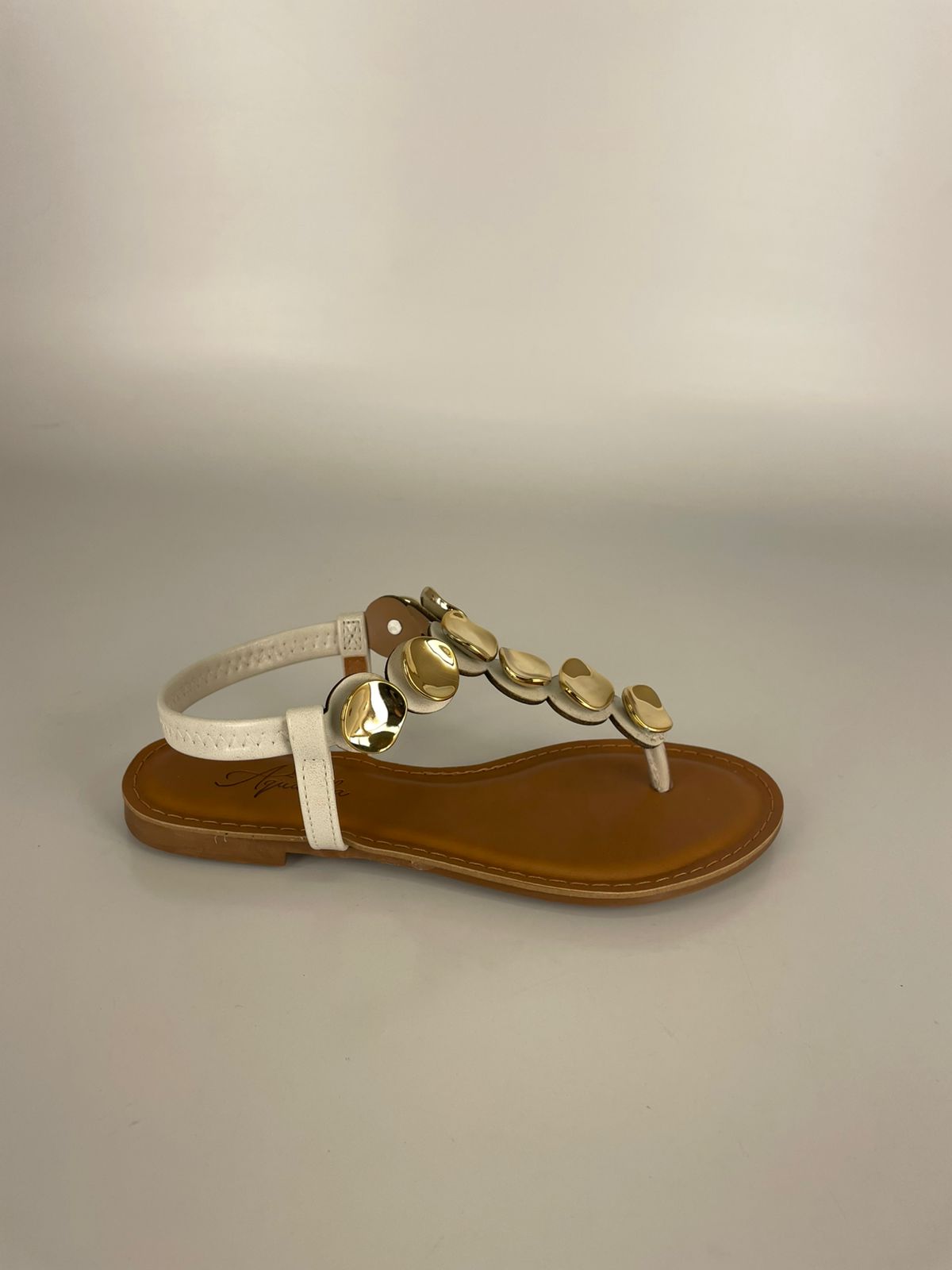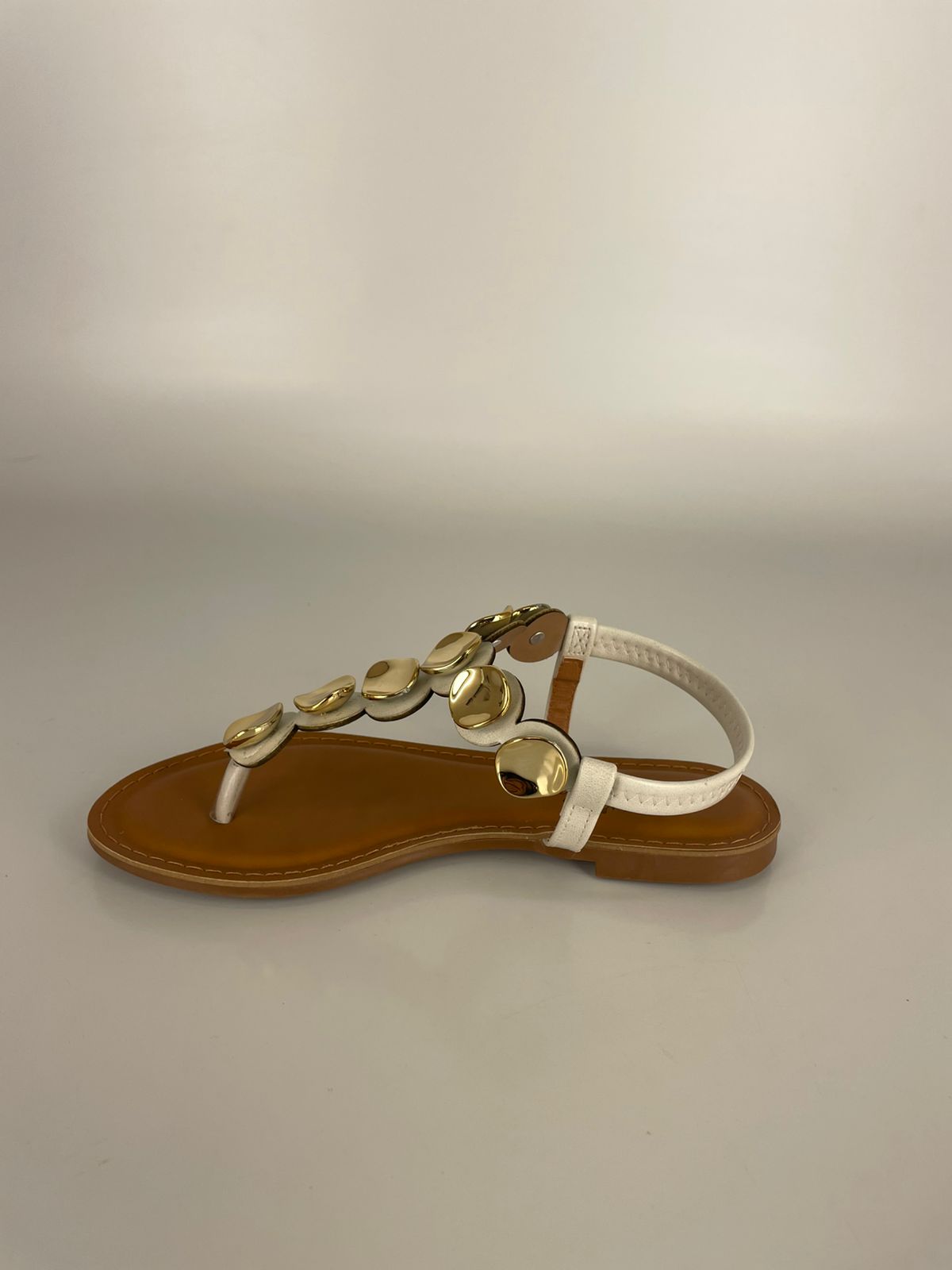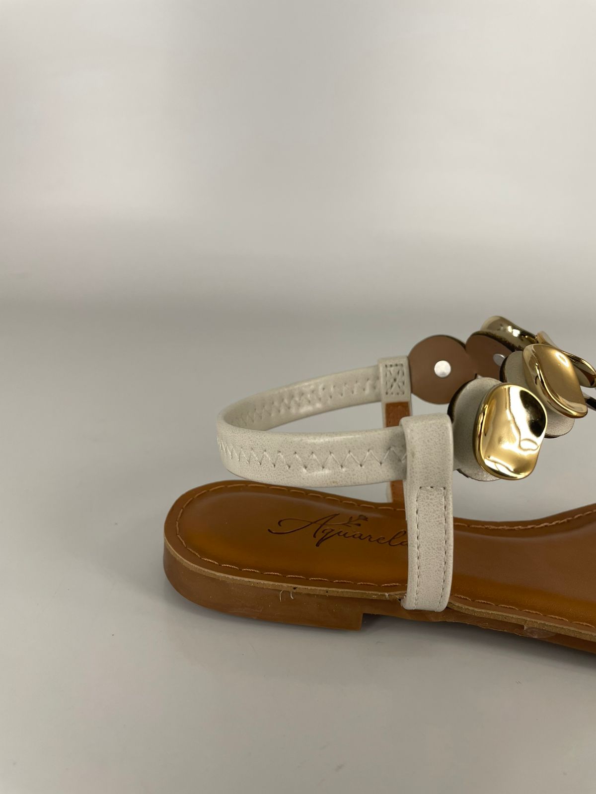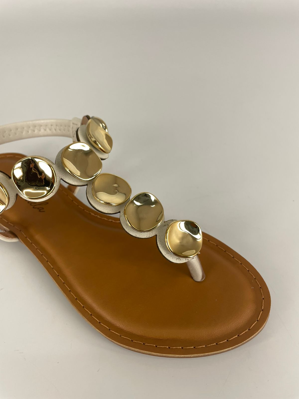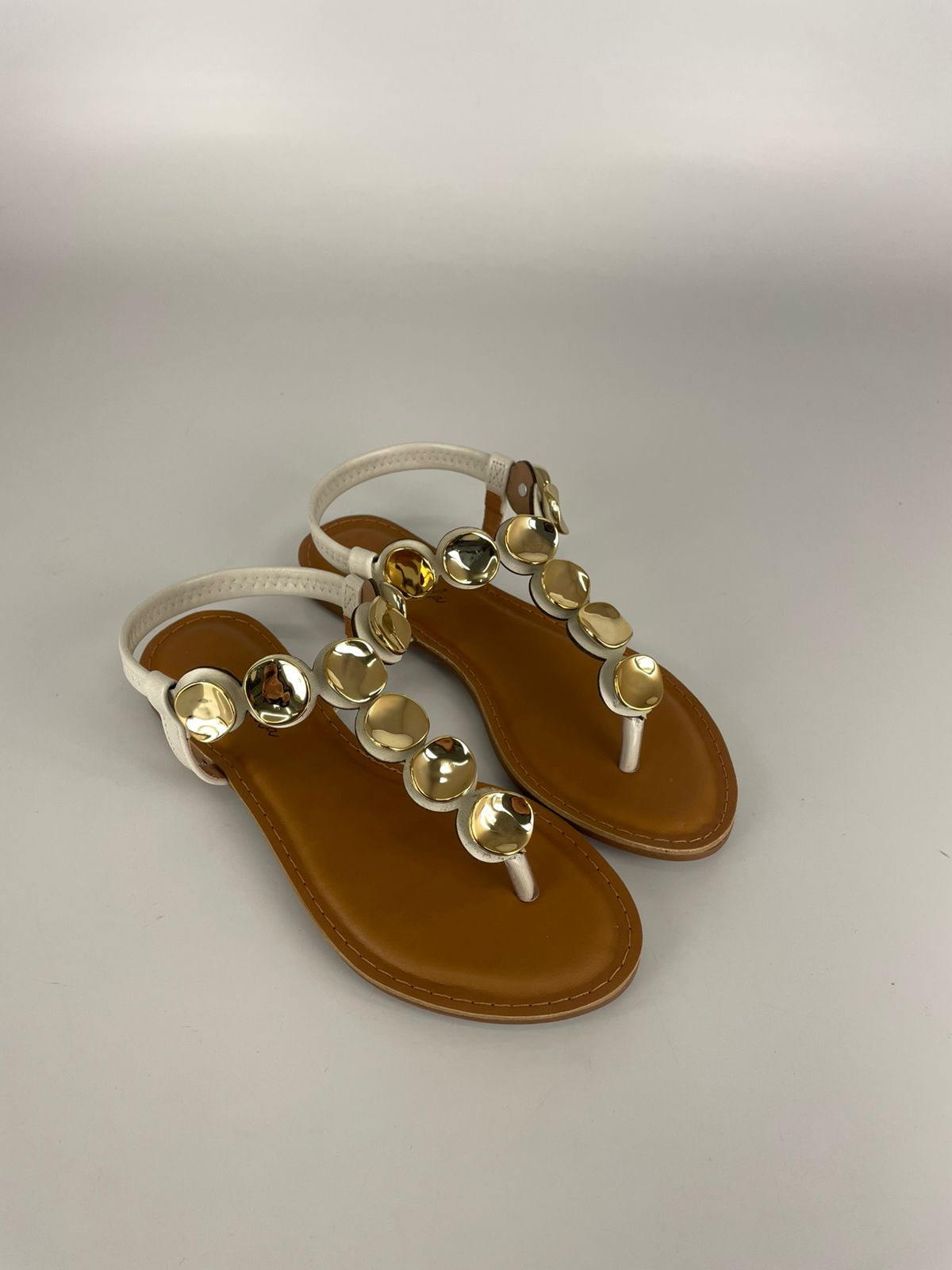 A rasteira Aquarela une o tom off white elegante às esferas metálicas douradas, criando uma harmonia perfeita entre o clássico e o moderno.