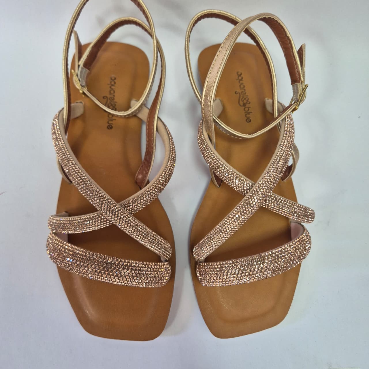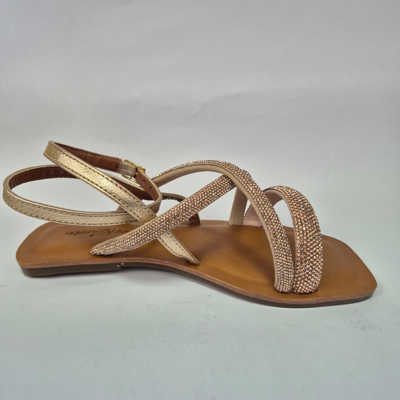 Sandália Aquarela Blue em couro nude rosé, com tiras finas cruzadas e aplicação de pedrarias delicadas que adicionam brilho e elegância ao visual. O design minimalista com bico quadrado garante leveza e conforto, enquanto o fechamento ajustável proporciona encaixe perfeito.