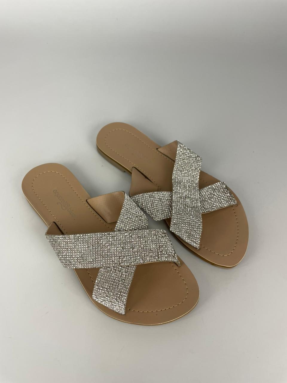 Seu design sofisticado e atemporal combina o conforto da palmilha macia com o brilho delicado das pedrinhas, criando uma peça que transita com leveza entre o casual e o elegante.