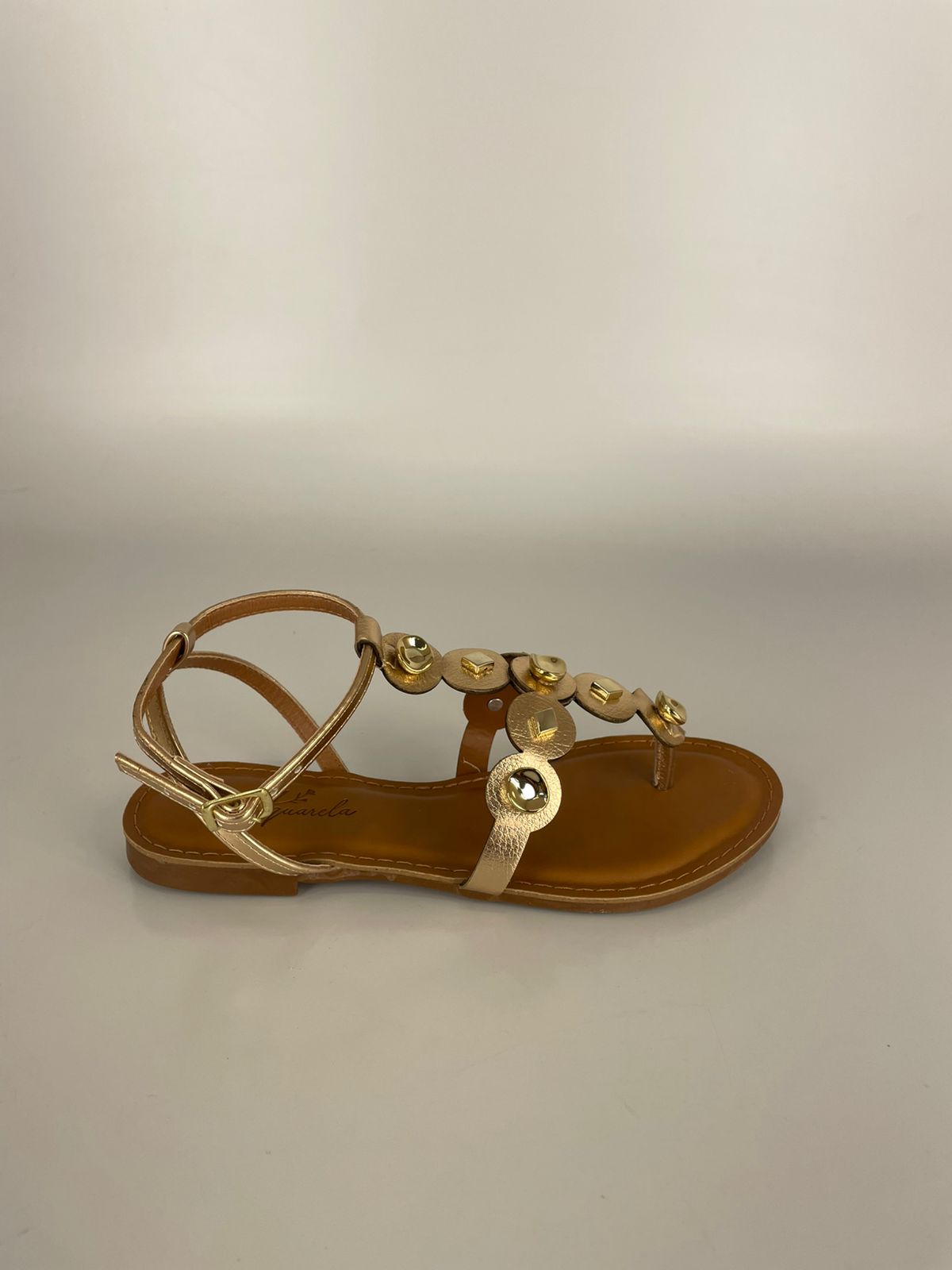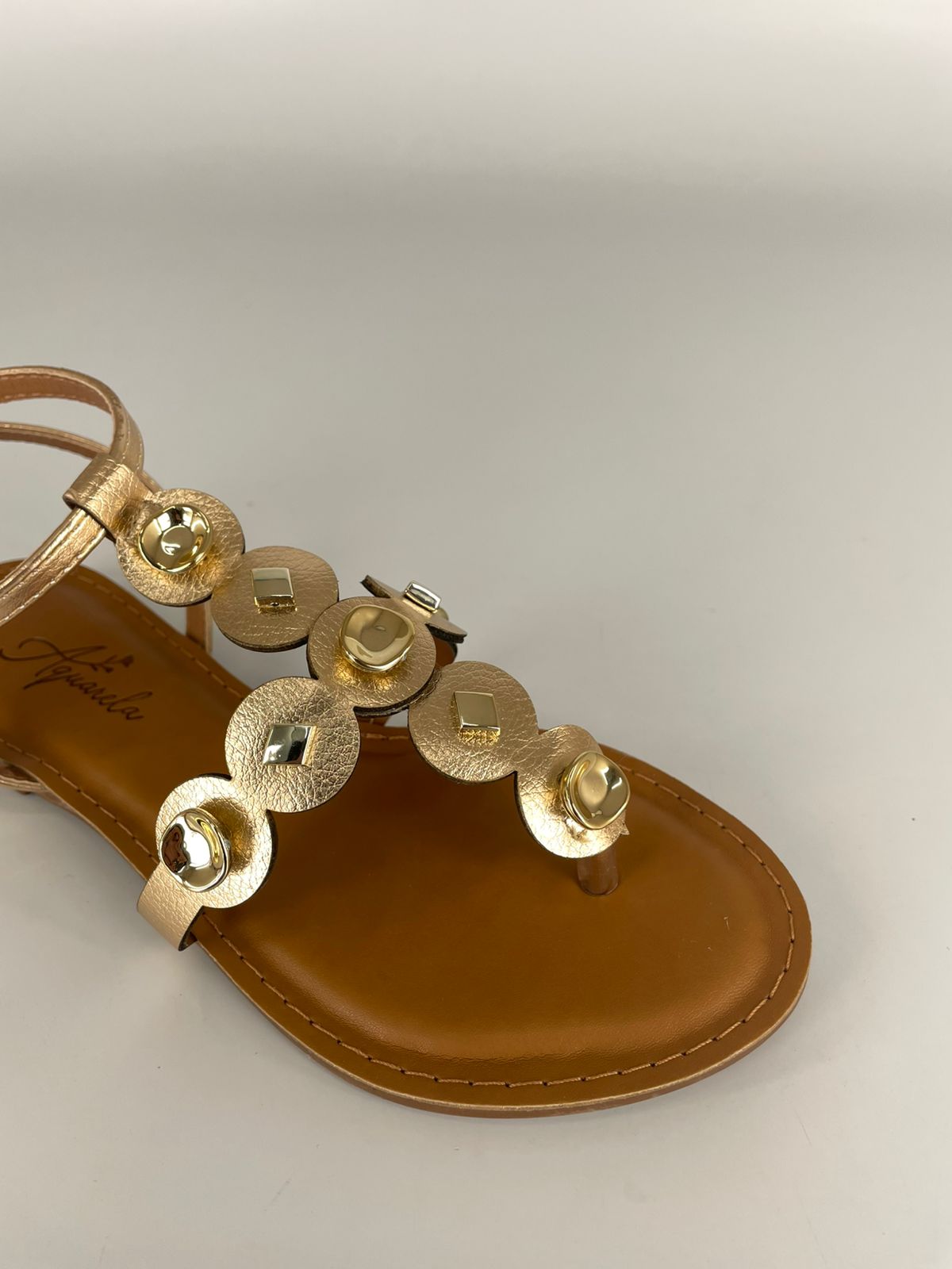 A rasteira Aquarela em tom cobre metalizado é a escolha perfeita para quem ama sofisticação com um toque moderno. Seu design com aplicações vazadas e esferas metálicas valoriza o pé e reflete a luz de forma delicada e charmosa.
