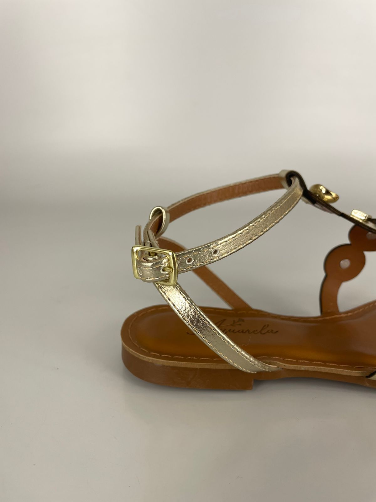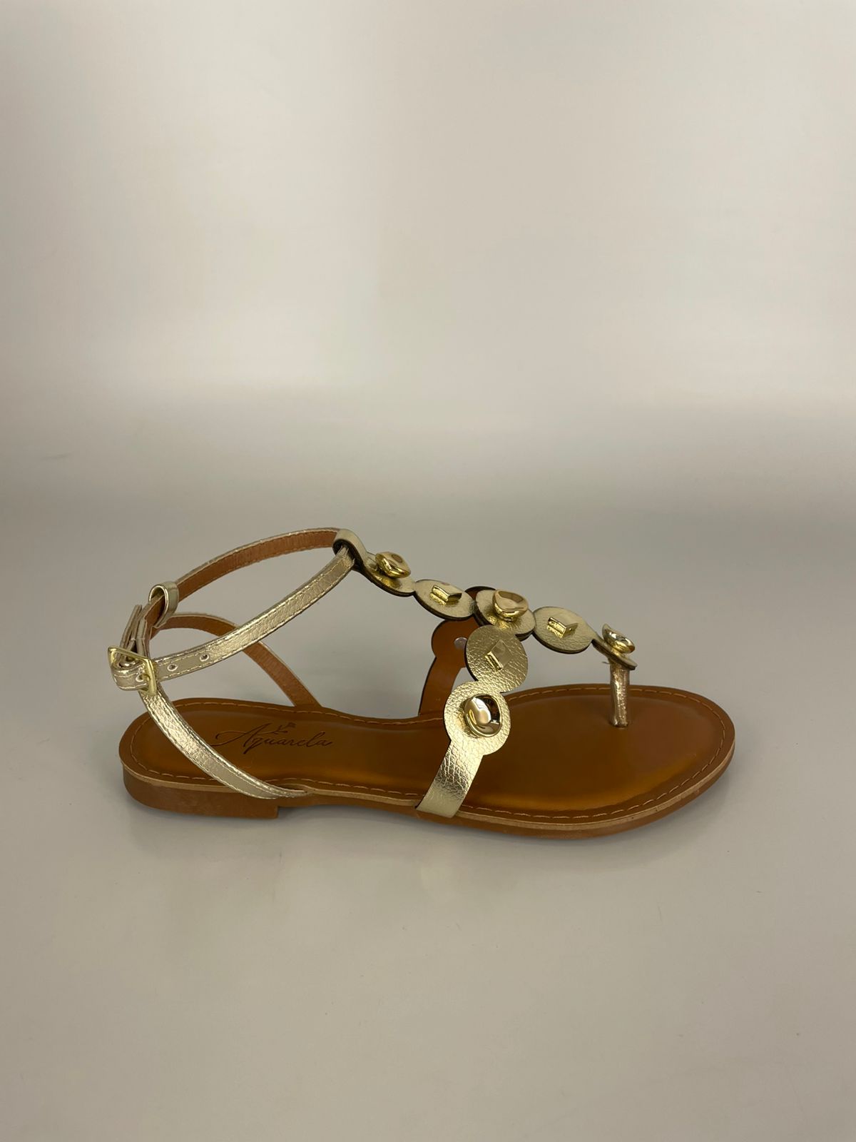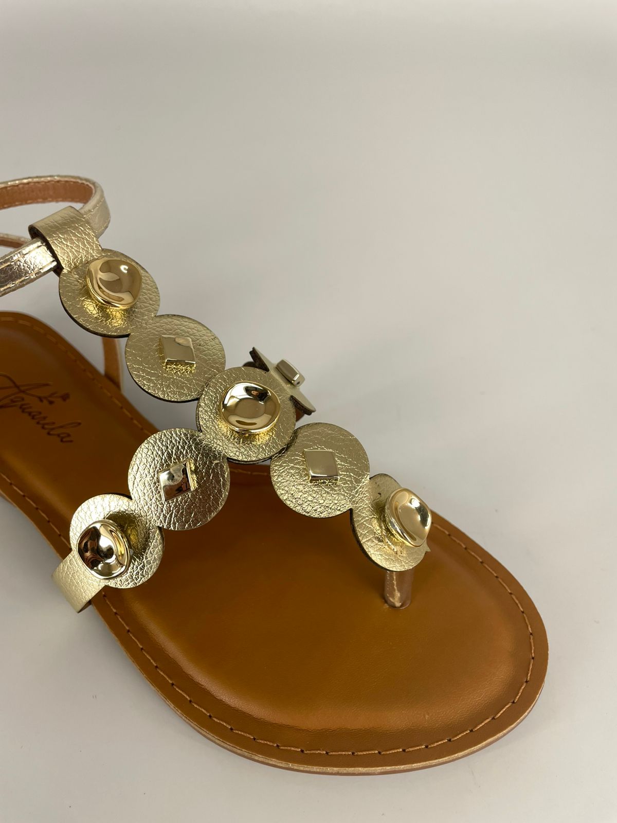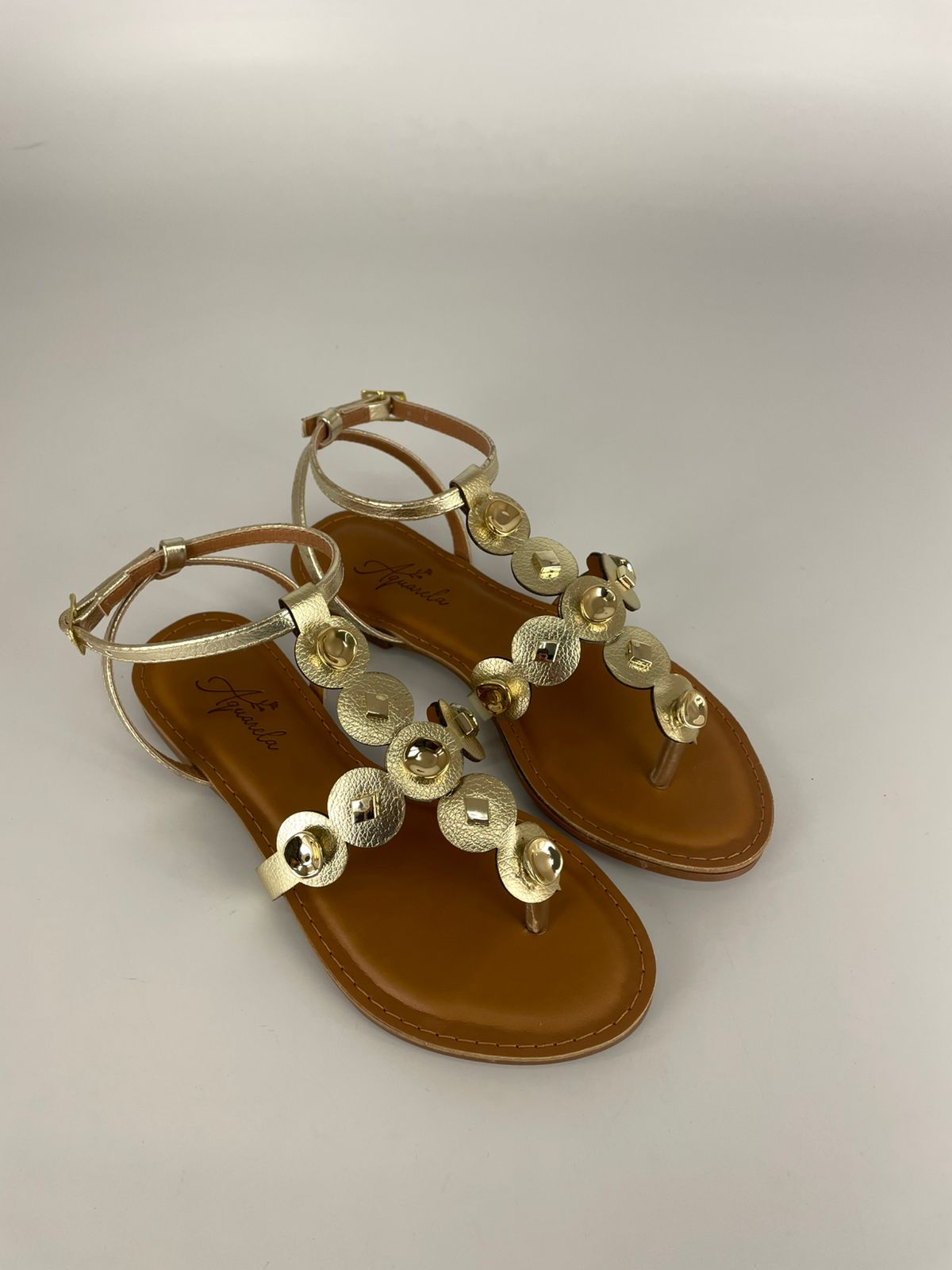 A rasteira Aquarela traz um design elegante com detalhes vazados e esferas metálicas douradas, compondo um visual moderno e sofisticado.