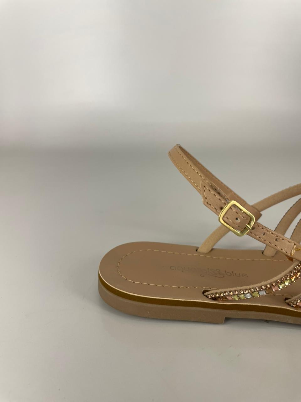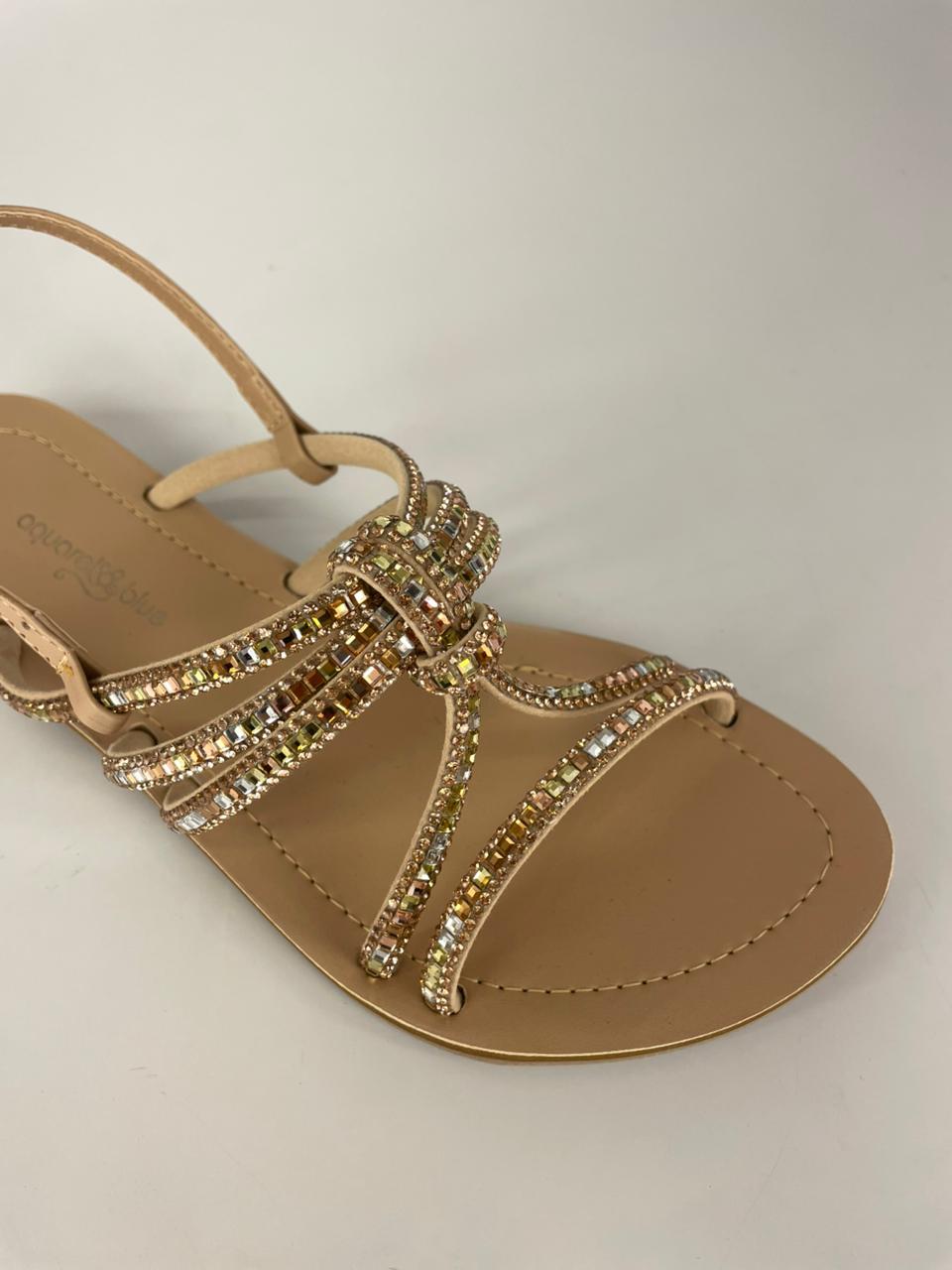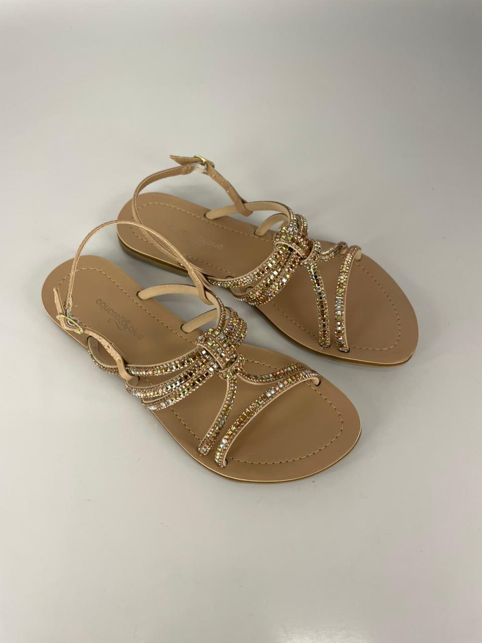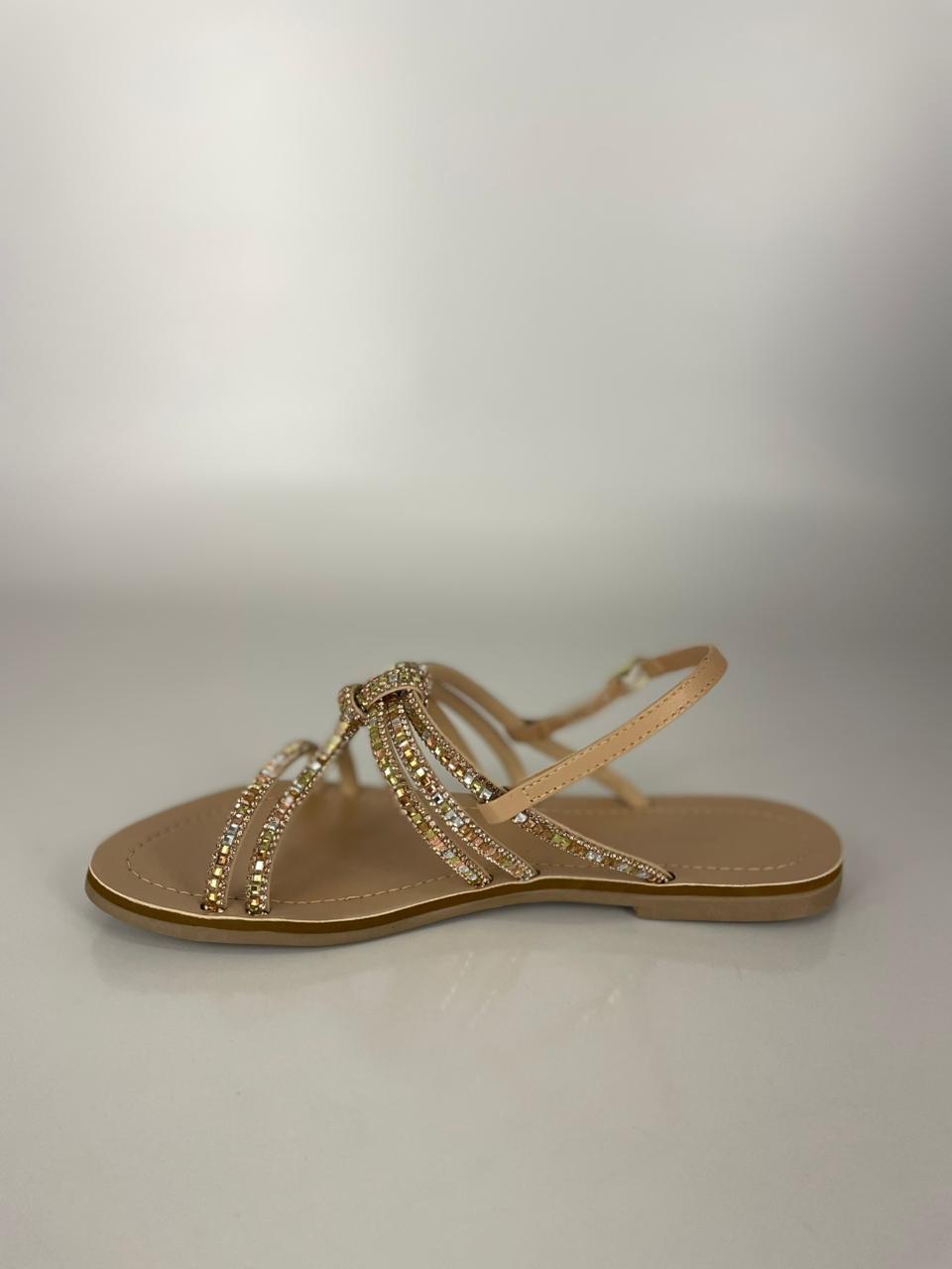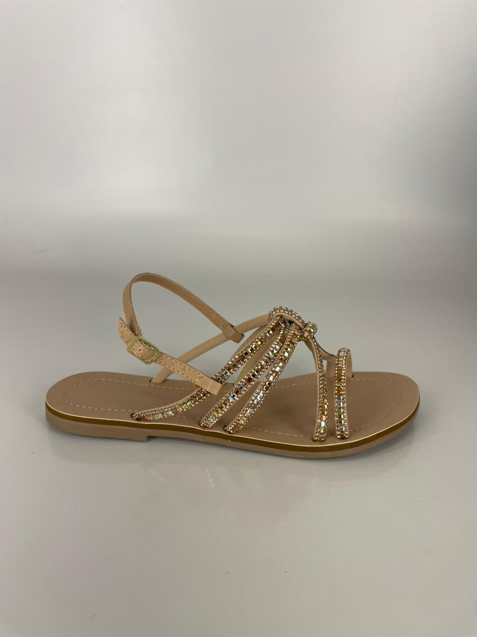 Seu design com tiras finas adornadas por pedrarias cintilantes valoriza os pés com um toque de glamour, enquanto o tom nude garante versatilidade para combinar com qualquer look — do dia à noite.