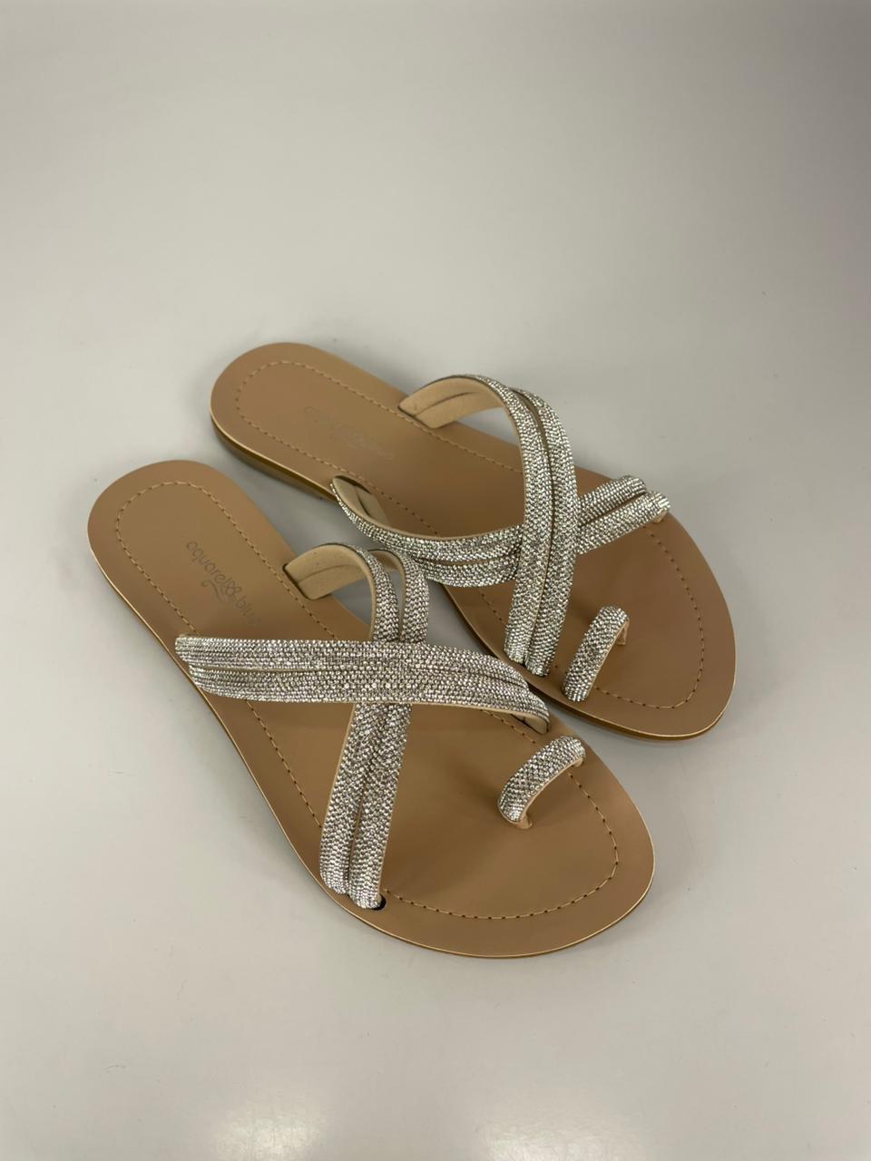 Seu design com tiras cruzadas adornadas por aplicações de pedrarias finas oferece um toque de sofisticação ideal para o dia e a noite.