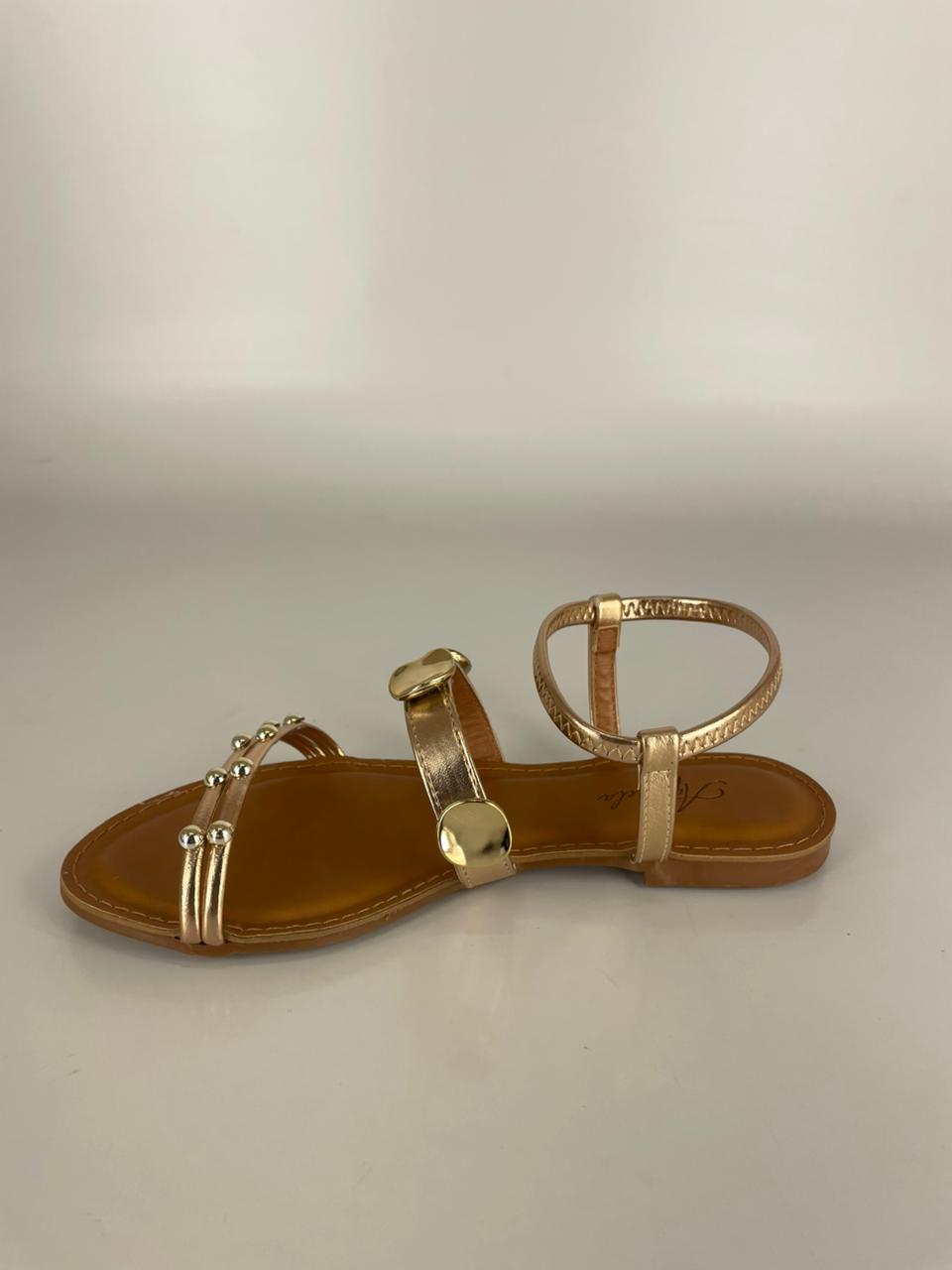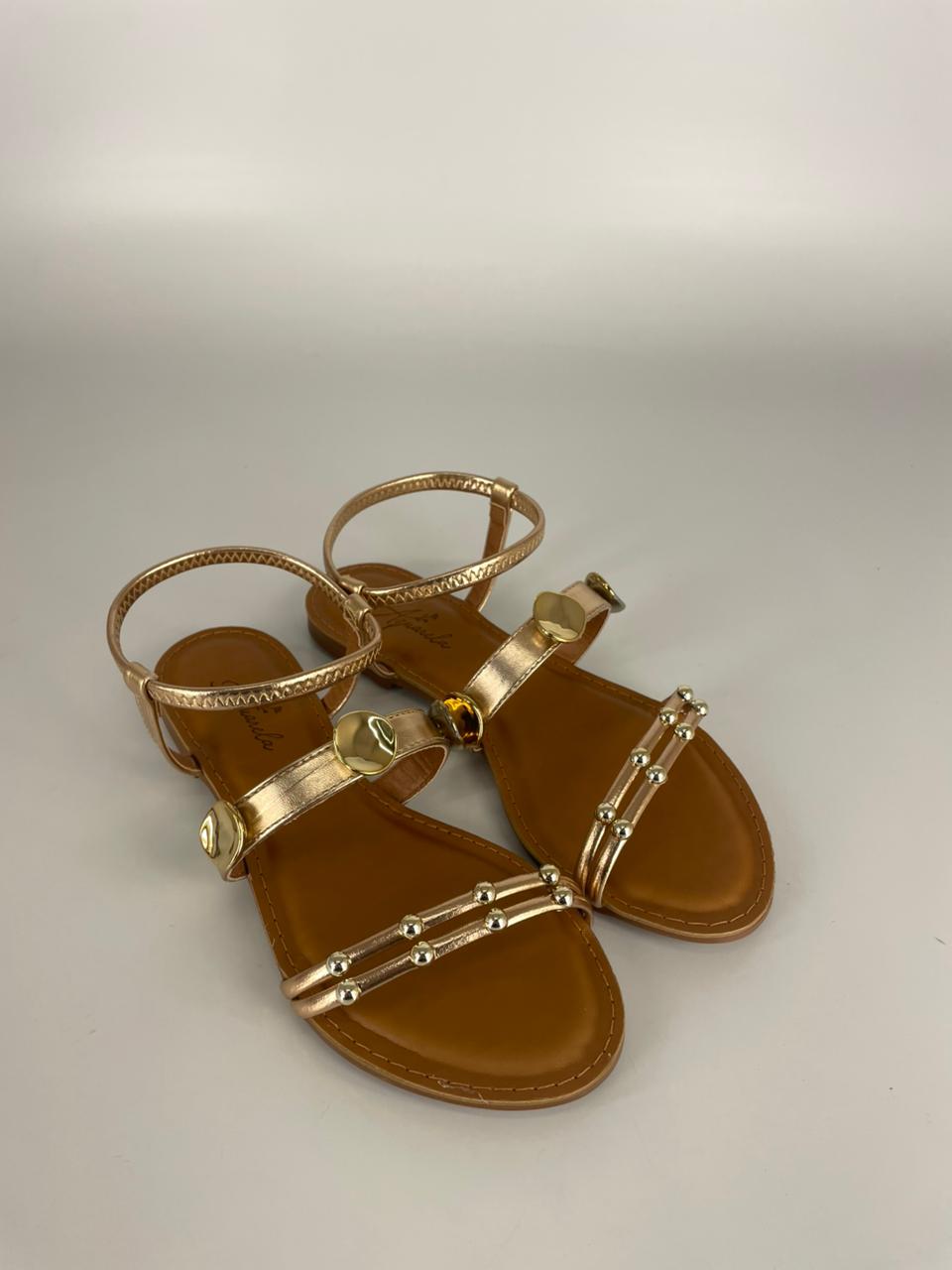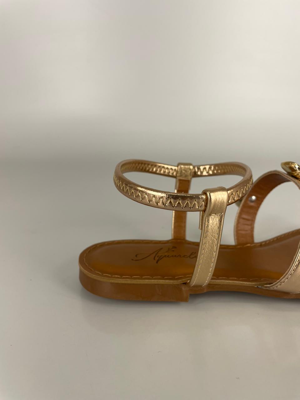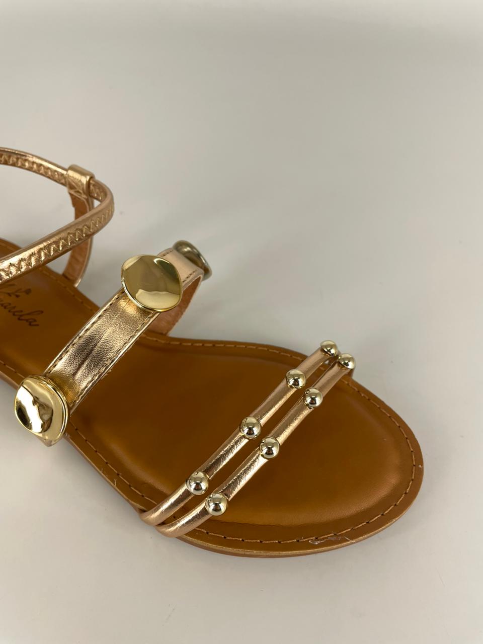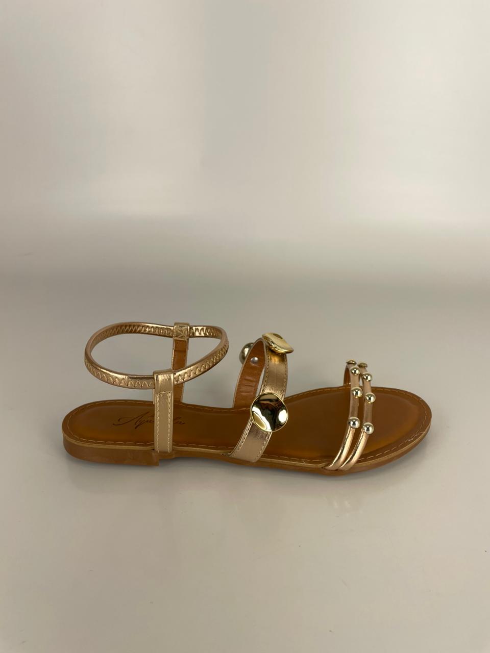 A rasteira Aquarela traz tiras finas metalizadas com aplicações de esferas douradas, unindo brilho e leveza na medida certa.