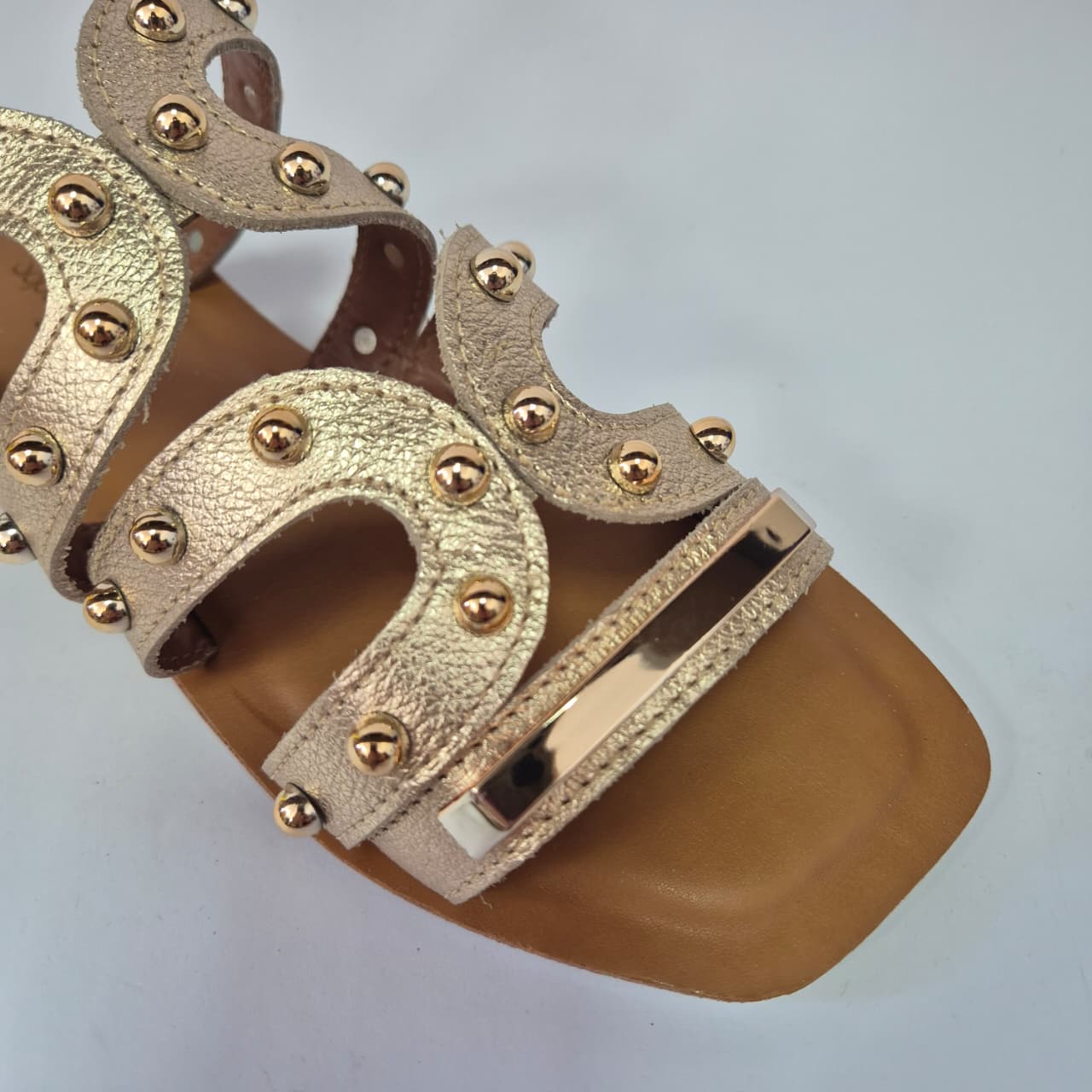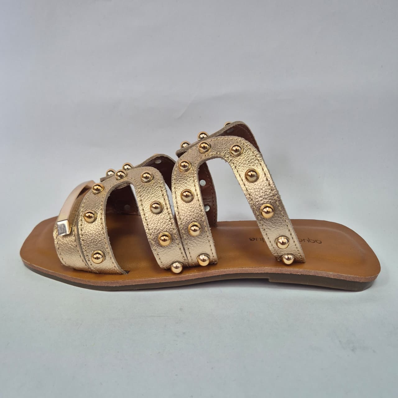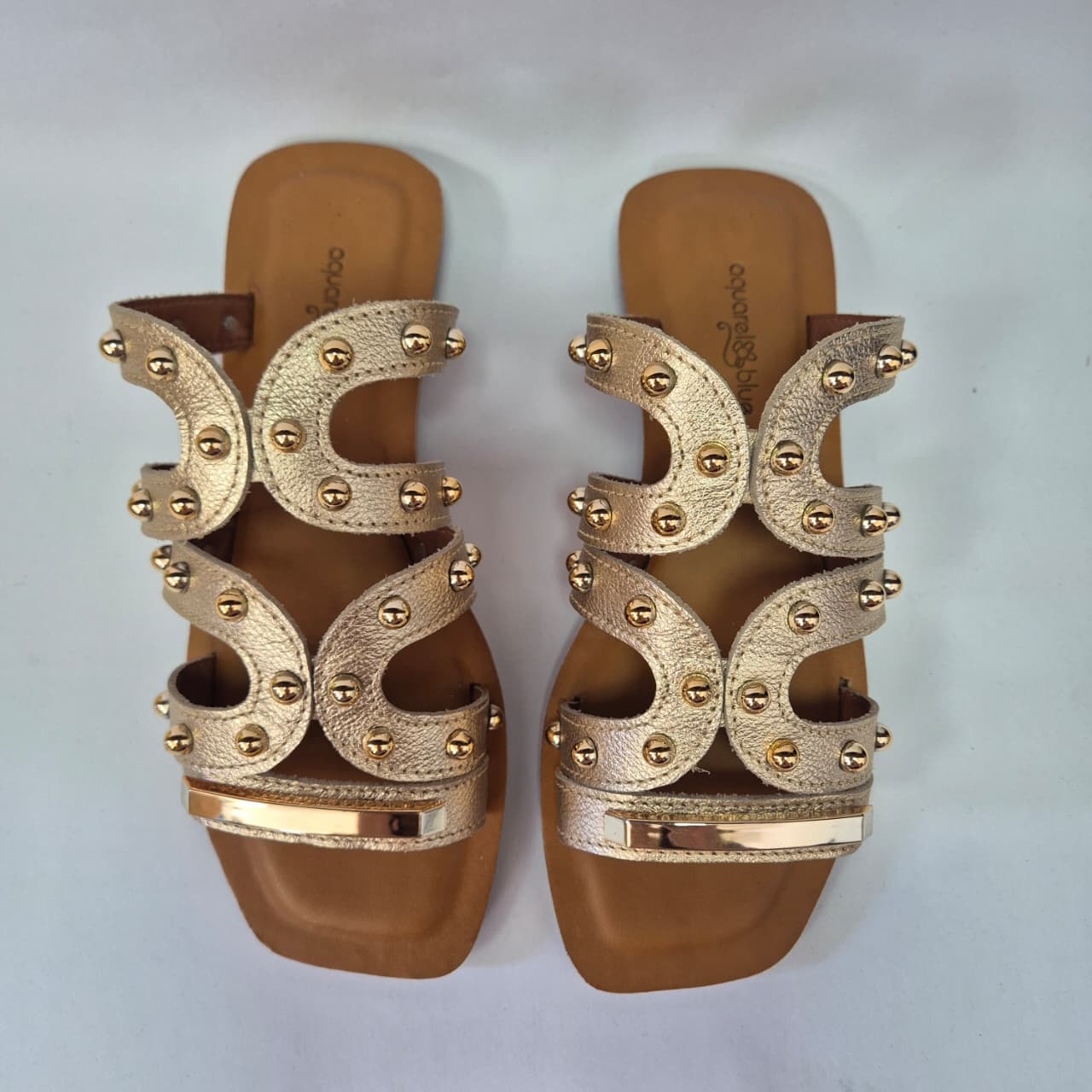 Rasteira Aquarela Blue em couro caramelo, com design moderno e aplicação de tachas metálicas douradas por toda a extensão das tiras. O detalhe frontal com placa metálica adiciona um toque de elegância e personalidade ao modelo. O bico quadrado e o acabamento artesanal garantem conforto e estilo em cada passo.