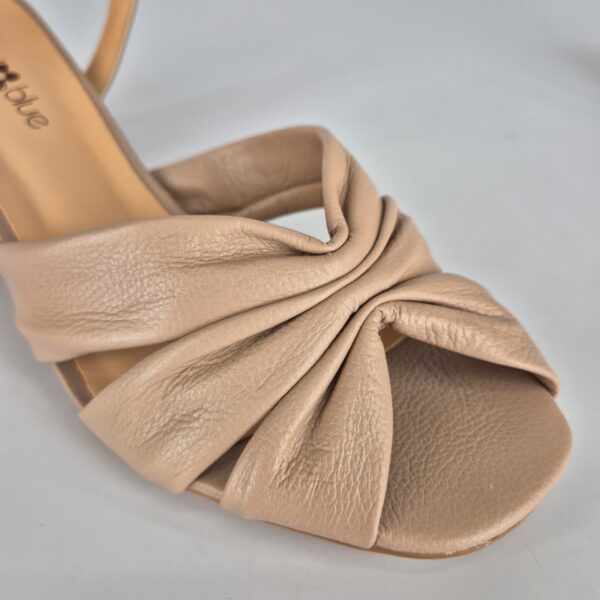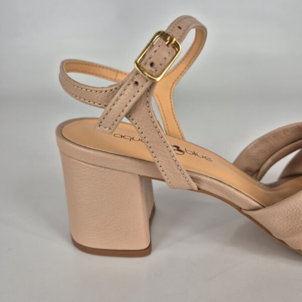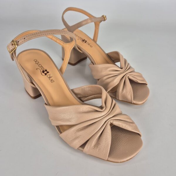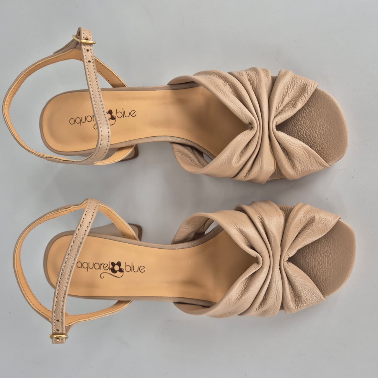 Sandália Aquarela nude, confeccionada em couro macio com design delicado e torção frontal que valoriza o pé com elegância. Possui salto bloco médio, palmilha acolchoada e fechamento em fivela lateral dourada, garantindo conforto e ajuste perfeito.