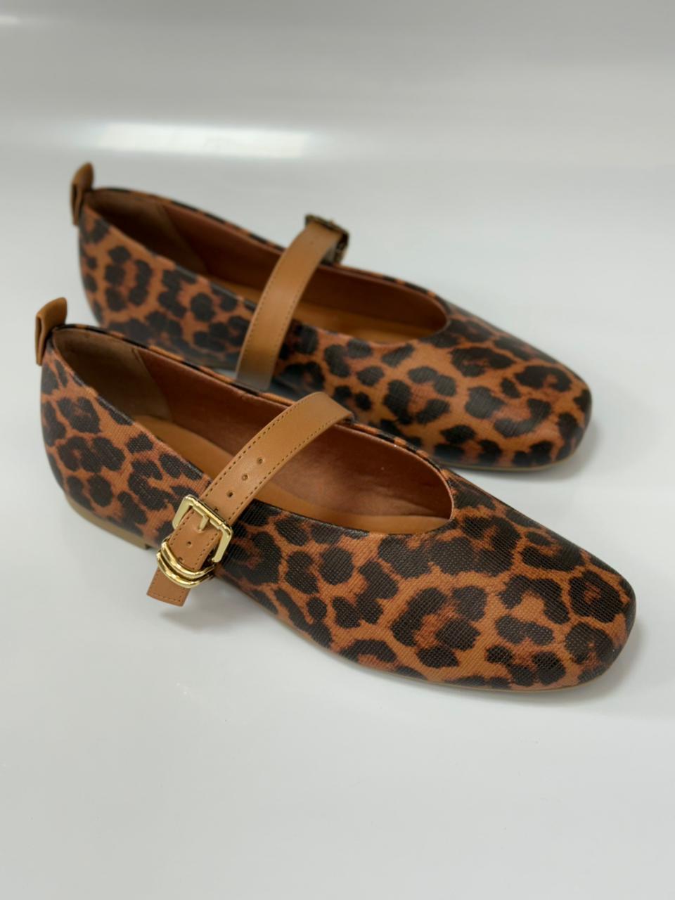 Sapatilha Aquarela em material sintético com estampa animal print, perfeita para trazer personalidade e sofisticação às produções do dia a dia. O modelo estilo mary jane conta com tira sobre o peito do pé e fivela dourada ajustável, que além de garantir melhor ajuste, adiciona um toque elegante ao visual. O bico levemente quadrado e o design flat proporcionam conforto e praticidade, ideal para acompanhar a rotina com muito estilo. Uma peça marcante e versátil para compor looks modernos e cheios de atitude.