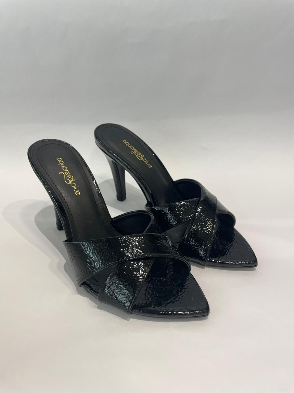 O tamanco Aquarela preto traz o charme do verniz texturizado aliado ao design moderno das tiras cruzadas, que valorizam os pés com sofisticação.