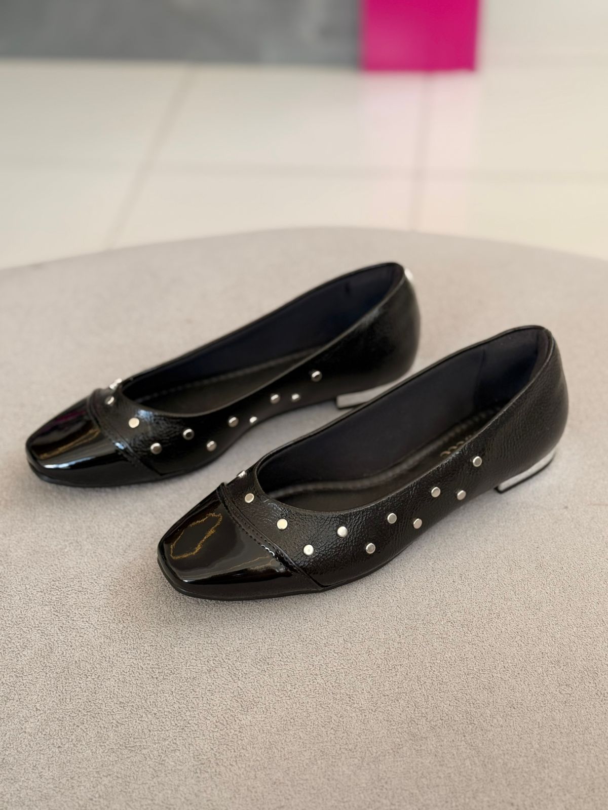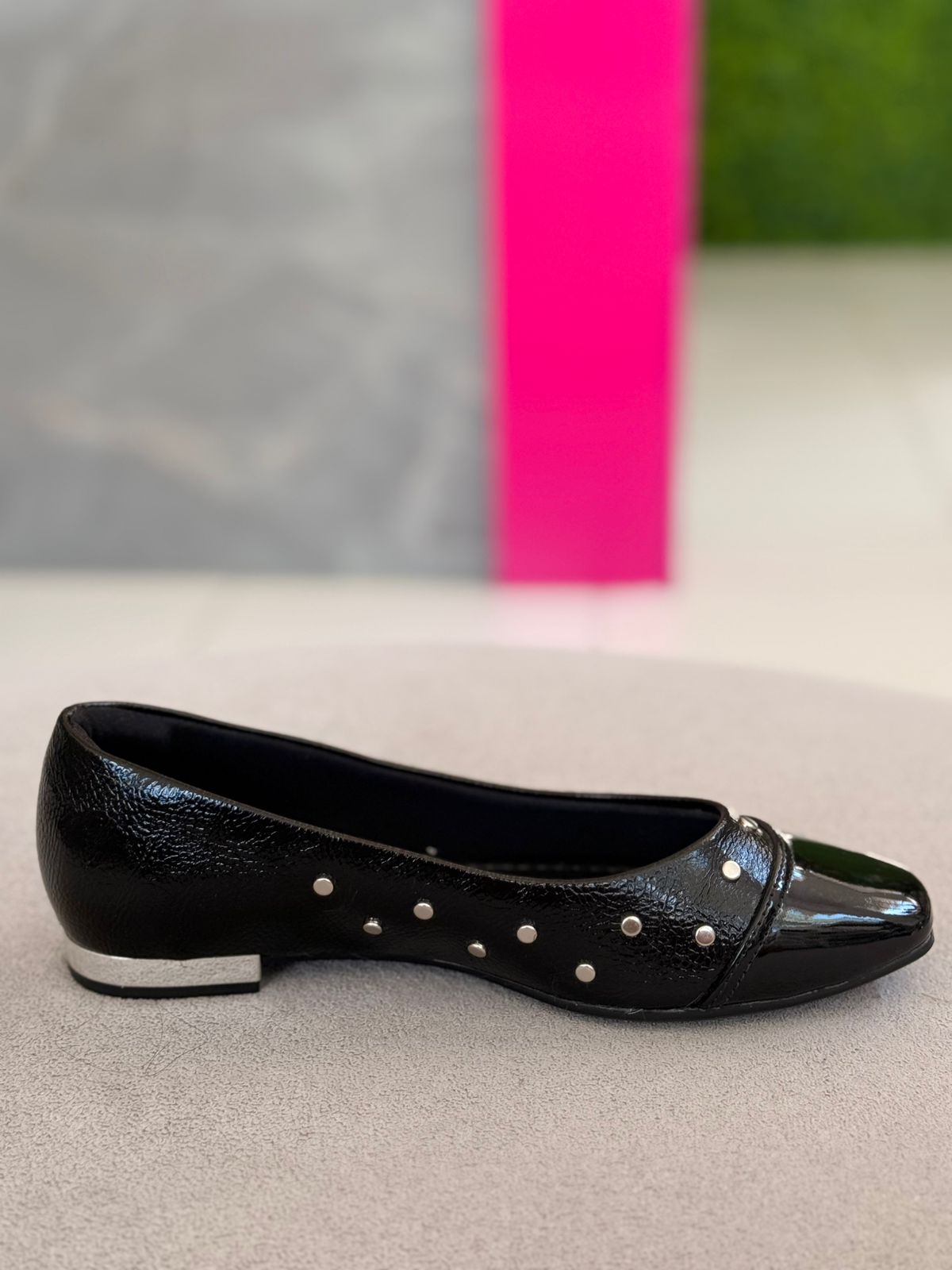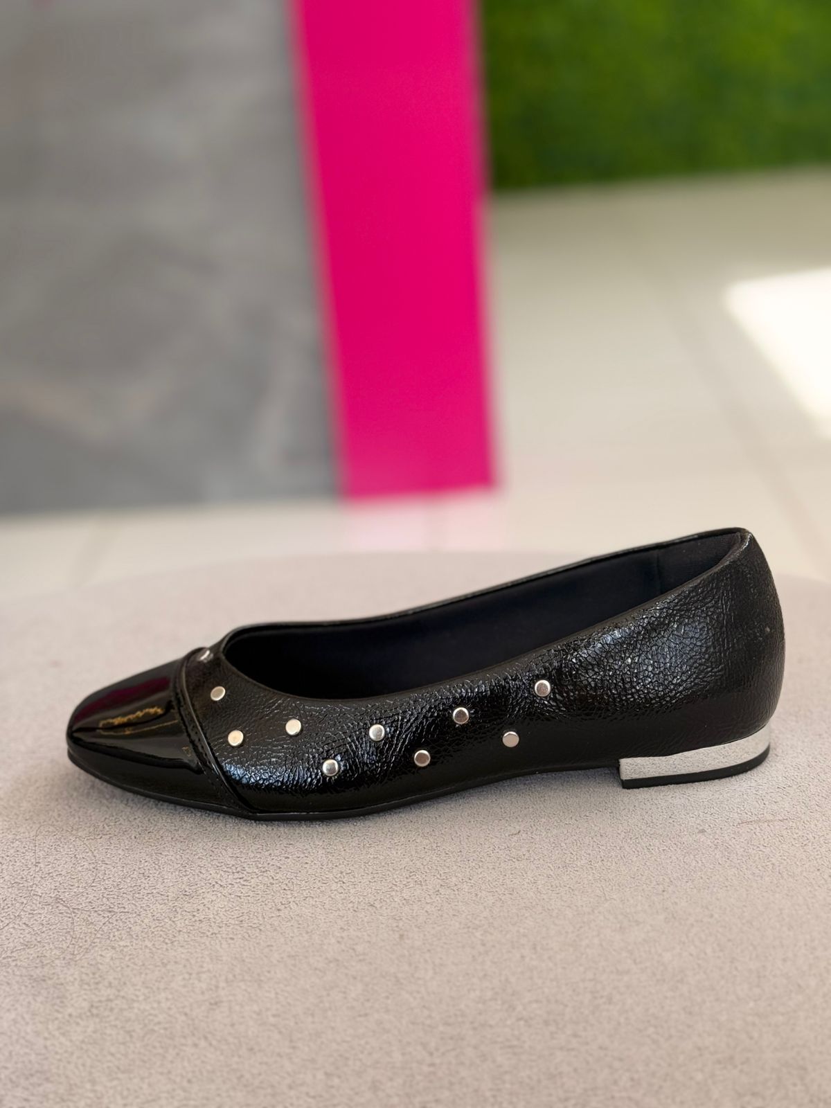 Esta sapatilha Bebecê em verniz traduz a união perfeita entre sofisticação e praticidade para o dia a dia. Com design clássico e bico levemente afinado, ela recebe aplicação de pequenas tachas metálicas que acrescentam personalidade e um toque moderno ao visual, sem perder a elegância. O acabamento em verniz valoriza o calçado e garante um ar refinado, ideal para transitar com facilidade entre produções casuais e mais alinhadas. Confortável e versátil, é aquela peça curinga que eleva o look com delicadeza e estilo, acompanhando a rotina da mulher contemporânea com leveza e segurança.
