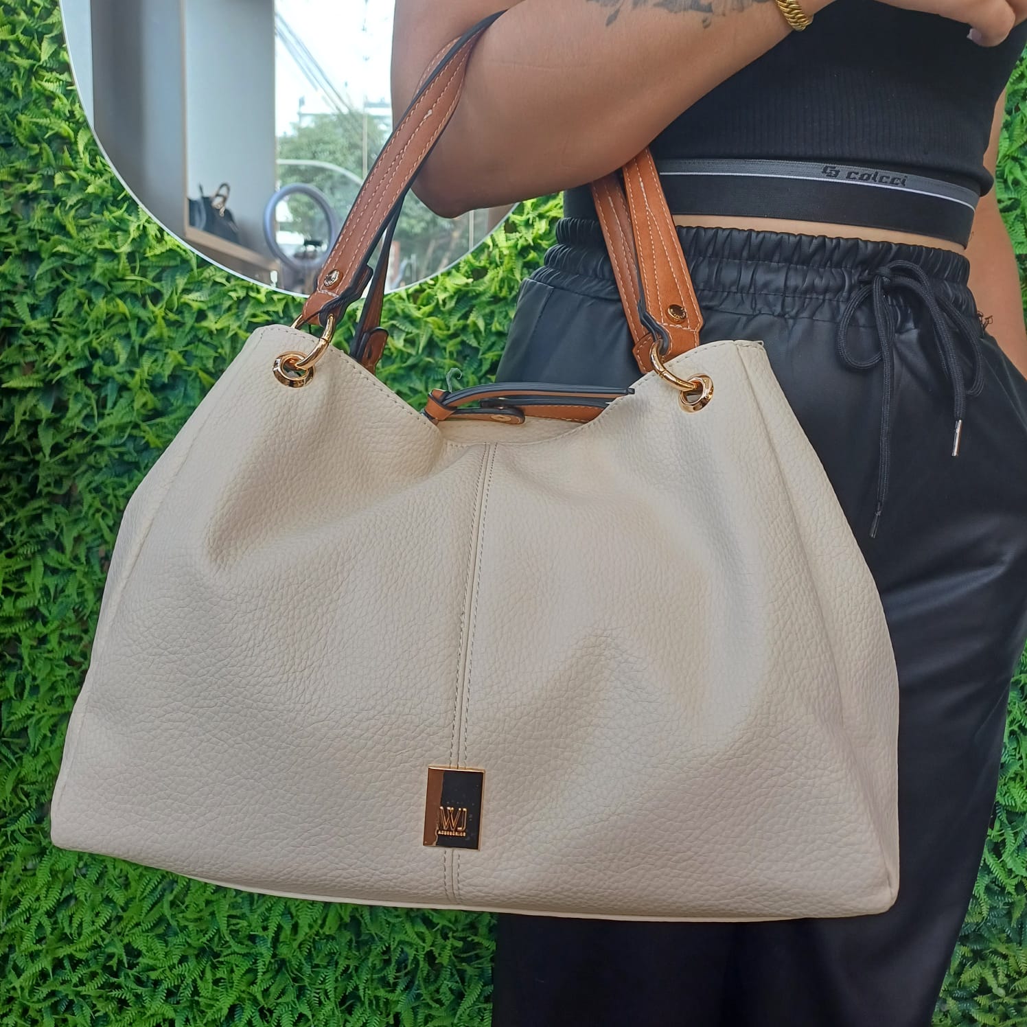 A Bolsa Satchel Grande WJ é perfeita para quem busca elegância, espaço e praticidade no dia a dia. Seu design clássico com toque moderno combina o bege neutro com detalhes em caramelo, criando uma harmonia sofisticada que vai bem com tudo.