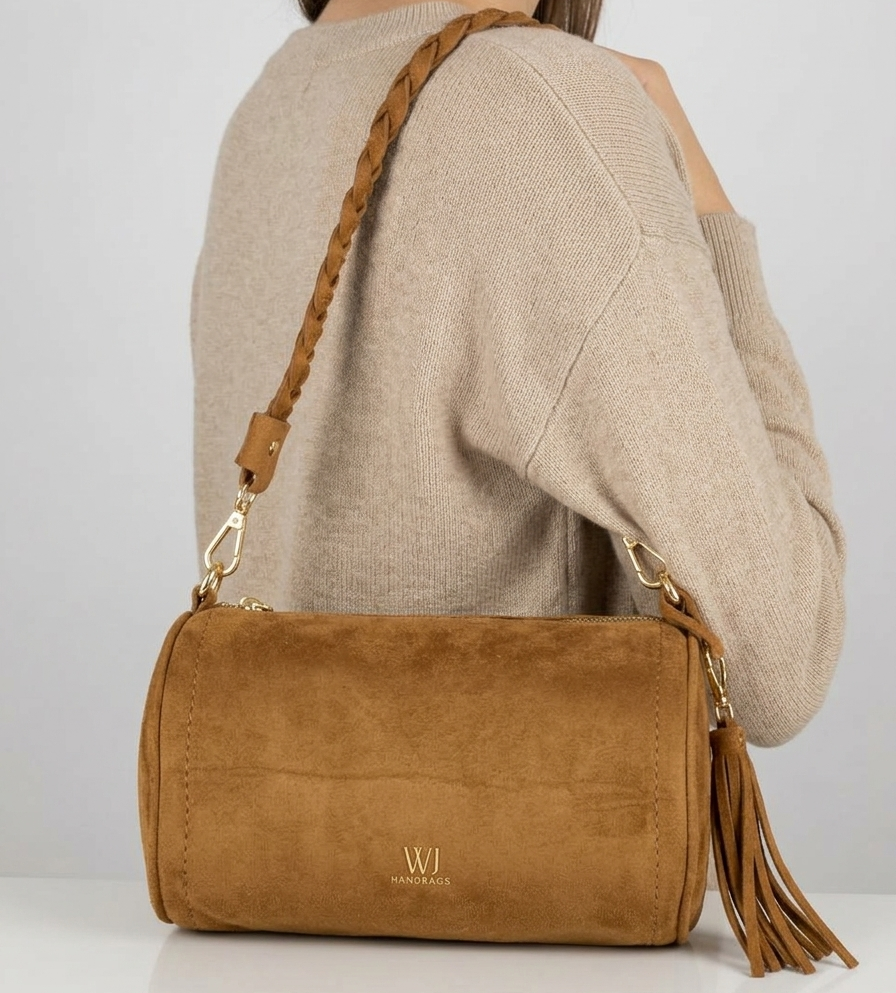 Esta bolsa baguete é a definição de charme rústico com um toque de elegância urbana. Confeccionada em material de alta qualidade com acabamento em camurça na cor camel (caramelo), ela apresenta um formato cilíndrico moderno que foge do óbvio. O grande destaque fica para a sua alça de ombro robusta com design trançado artesanal, que confere personalidade imediata ao look. Finalizada com ferragens douradas de alto brilho, um barbicacho (tassel) lateral dinâmico e a assinatura metálica da WJ, esta peça é ideal para quem busca um acessório que equilibre textura e sofisticação.