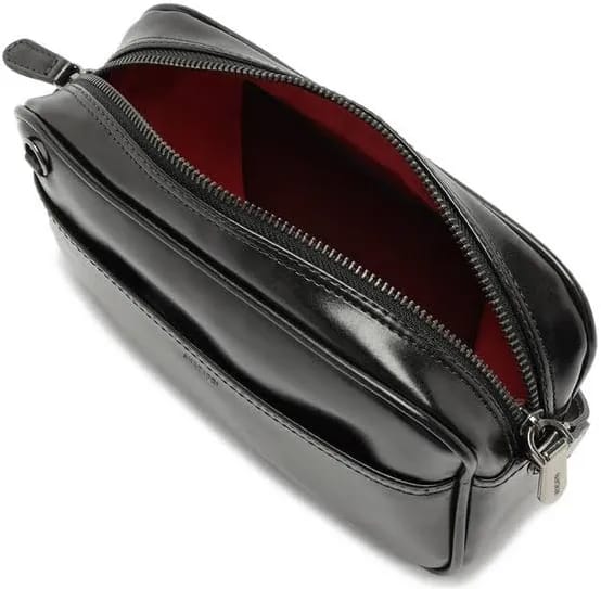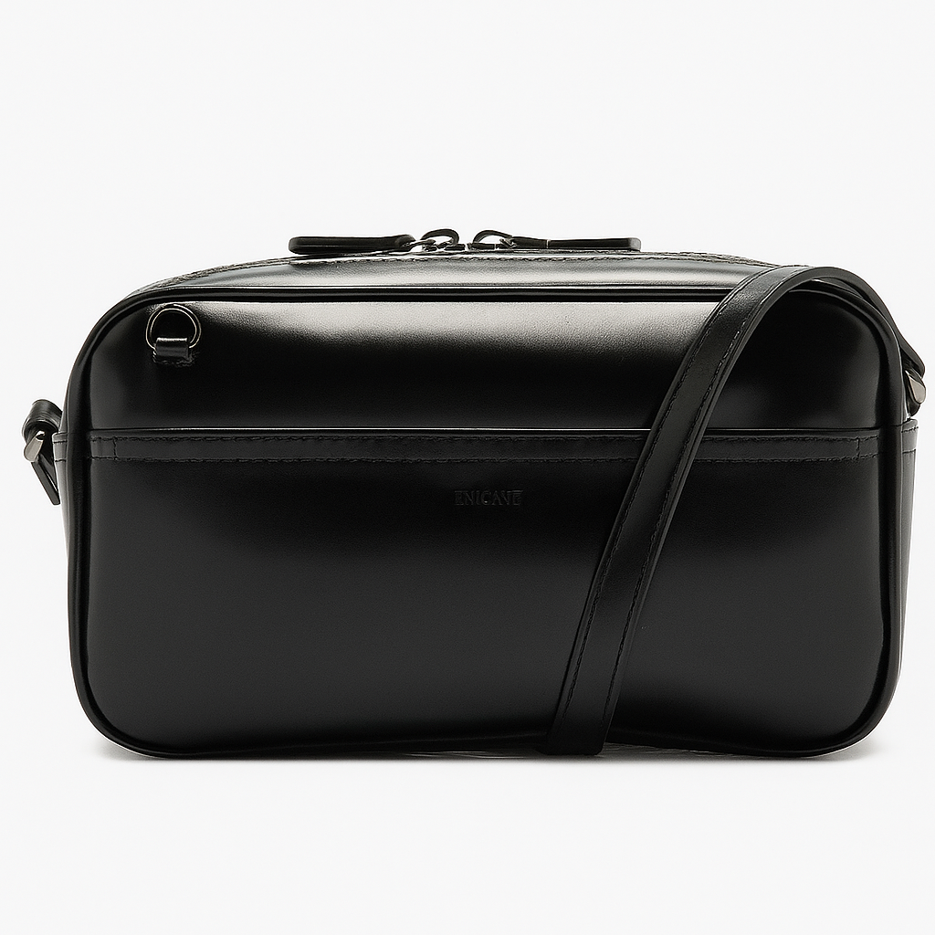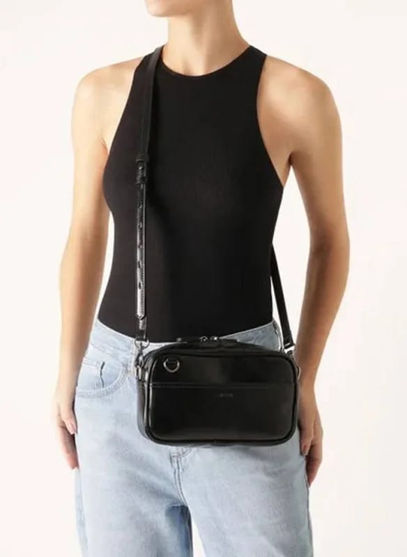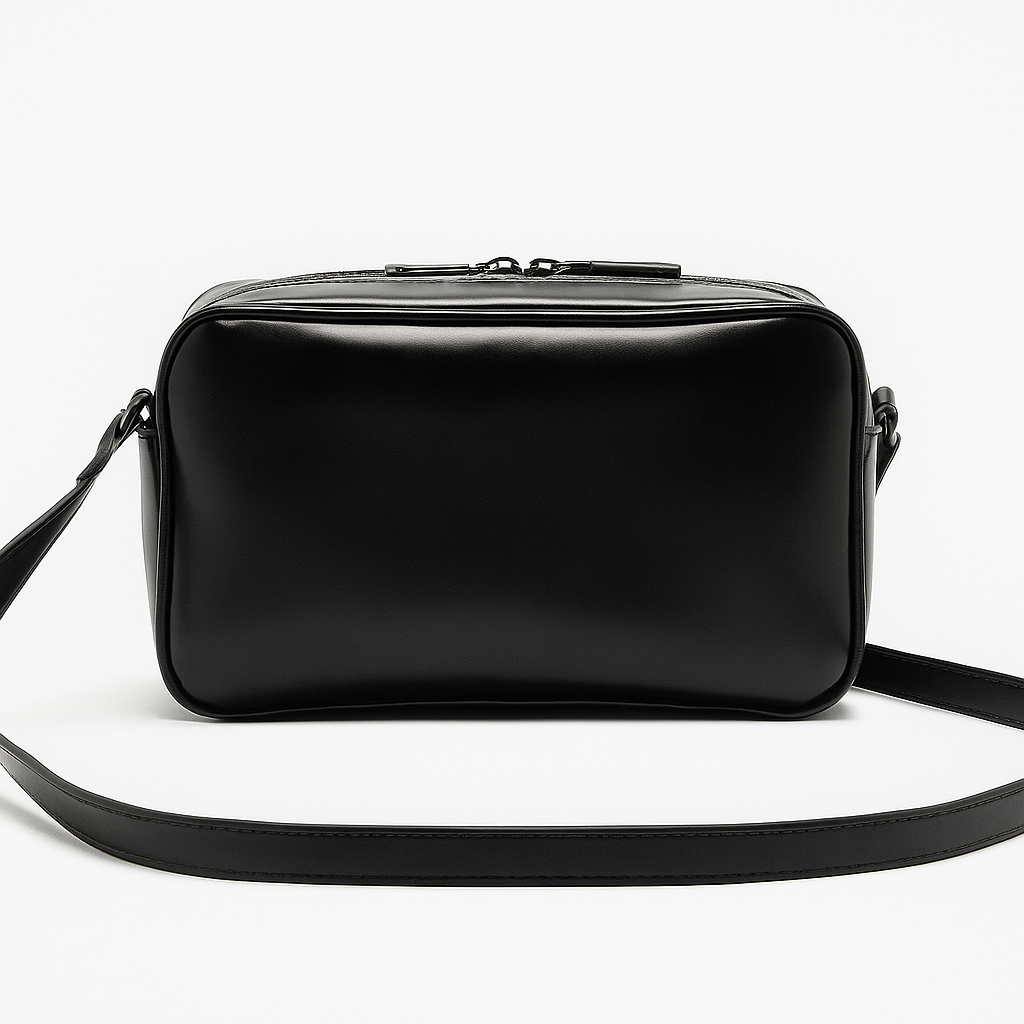 Bolsa tiracolo média, na cor preta. De material similar ao couro com efeito envernizado, o modelo tem shape retangular com visual alongado, acabamento arredondado nos cantos e contorno por tira bombada. Traz alça longa fixa com regulagem, com fecho superior em duplo cursor no zÃper metálico – moderno e exclusivo – com puxador em tira. Com forro em tom vermelho na parte interna, traz aplicação de maxi etiqueta emborrachada Anacapri, com design exclusivo em ondas. Apresenta bolso externo aberto, contornado em costura pespontada dupla, com assinatura Anacapri em relevo, centralizada na parte superior do bolsinho.