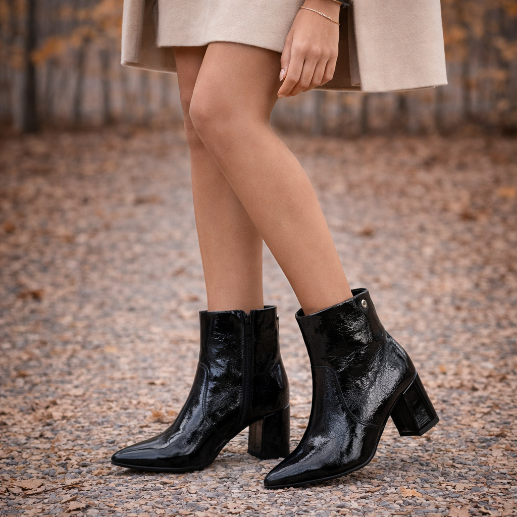 Elegante e atemporal, a bota Bottero em couro verniz flash é a escolha ideal para quem busca sofisticação com presença marcante. O acabamento em verniz confere brilho sutil e moderno, enquanto o design de linhas limpas alonga a silhueta e valoriza o visual. O salto bloco médio garante estabilidade e conforto ao caminhar, tornando o modelo perfeito tanto para produções urbanas quanto para ocasiões mais elegantes nos dias de outono e inverno. Um clássico contemporâneo que eleva qualquer look com personalidade e estilo.