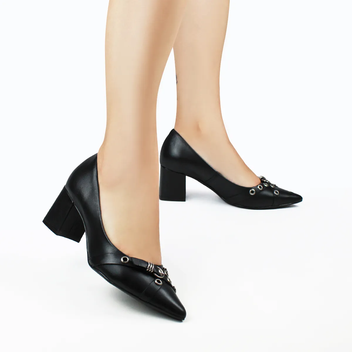 ✔ Detalhe metálico sofisticado no cabedal