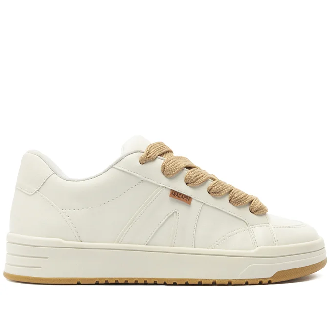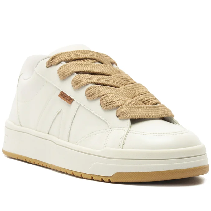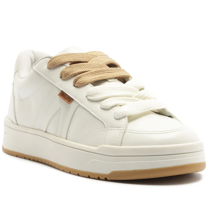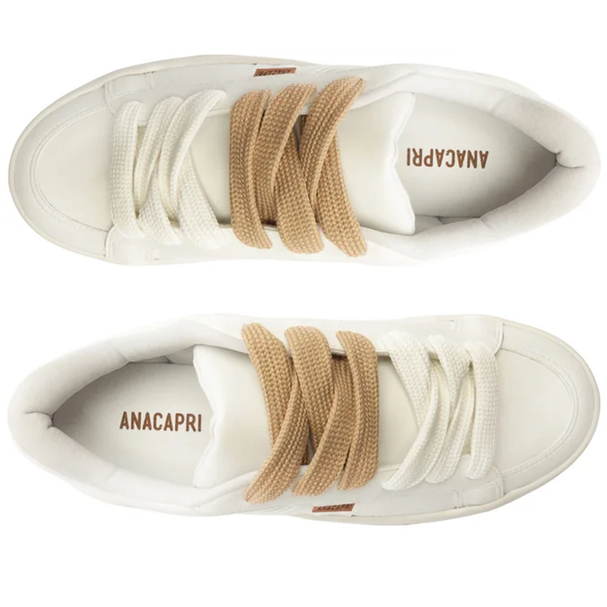 Tênis A’26 acamurçado, com dois atacadores, na cor branca. Com construção de novo solado: bicolor emborrachado branco e tratorado marrom, o modelo apresenta design de costura pesponto nas laterais e contornos, com recorte em peça em napa branca aplicada na parte traseira e peças em suede aplicadas na lingueta, biqueira e parte traseira. De amarrar por atacadores duplos – o modelo acompanha atacador bege e um atacador colorido exclusivo, no mesmo tom do tênis, permitindo personalização. Possui parte interna forrada e detalhe para aplicação de peça recortada com design em “A” em suede e napa branco, com tag lateral marrom Anacapri.