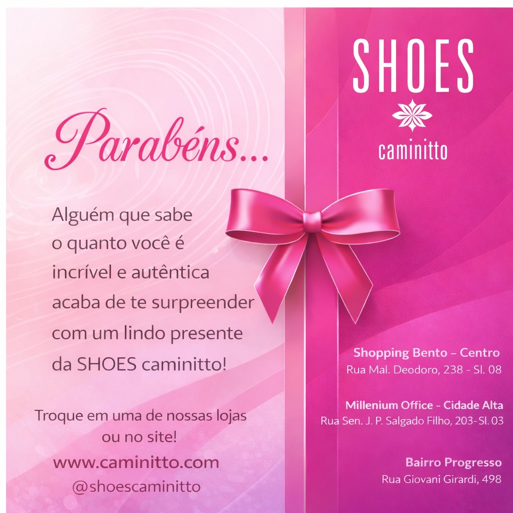 InÃcio / Sem categoria / Cartão Presente Cartão PresenteR$50,00 ou R$47,50 no pix Carteira para pagamentos Quem vai usar esta carteira? Comprar para Mim Comprar para Outro Nome Celular E-mail Mensagem Valor: * MÃn: R$50,00, Máx: R$2.500,00 Adicionar ao Carrinho Categoria: Sem categoria Descrição Descrição Compre uma nova carteira Produtos relacionados Lialine Scarpin Salto Alto Bloco Couro Nude R$199,90 35363738Comprar Anacapri Rasteira Eco Marinho R$179,90 35363739Comprar Lialine Bota Corrente Ouro Couro Preto R$539,90 39Comprar