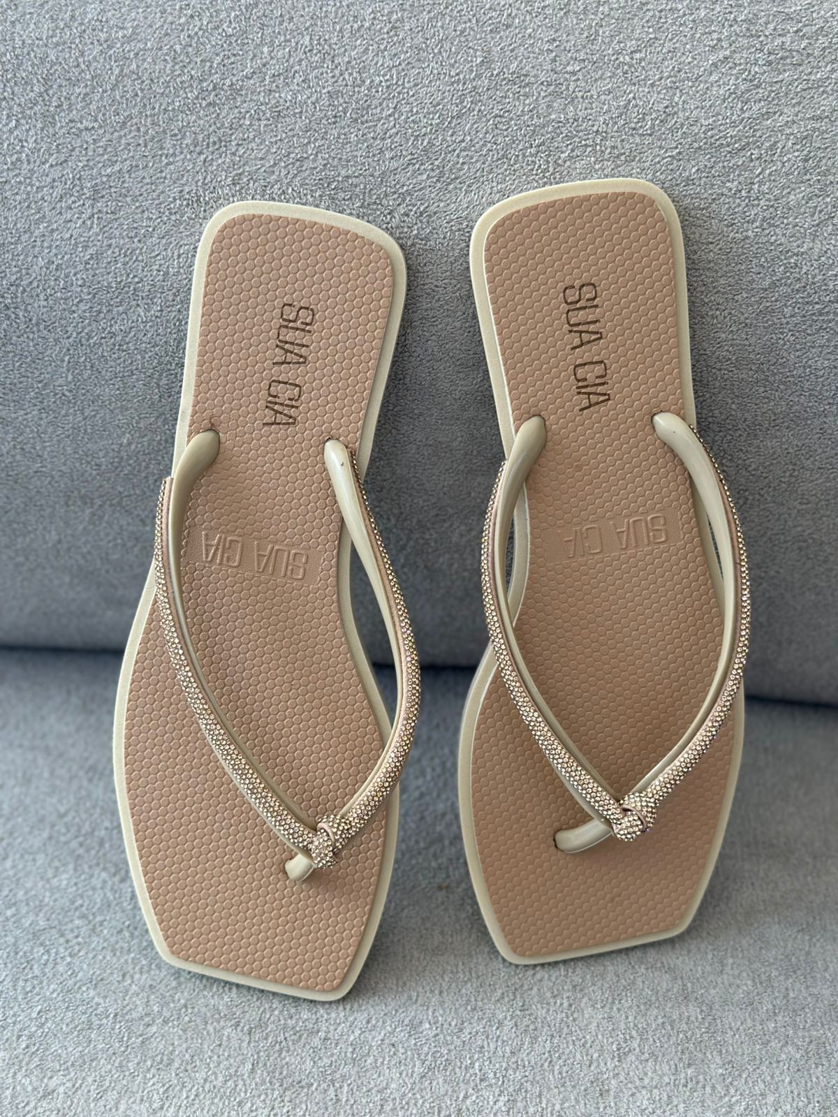 O Chinelo Sua Cia vai se tornar o seu queridinho, pois sua modelagem é elegante e fica super delicado nos pés, além de ser confortável. O bico quadrado é uma forte tendência da estação e promove um visual moderno e cheio de estilo. Um casual elegante para você arrasar em todos os lugares! Confeccionado em material sintético com acabamentos reforçados. Palmilha em PU macio levemente texturizado promove conforto e bem estar durante todo o uso, enquanto o solado em borracha flexível oferece passos leves e aderentes.