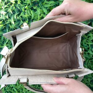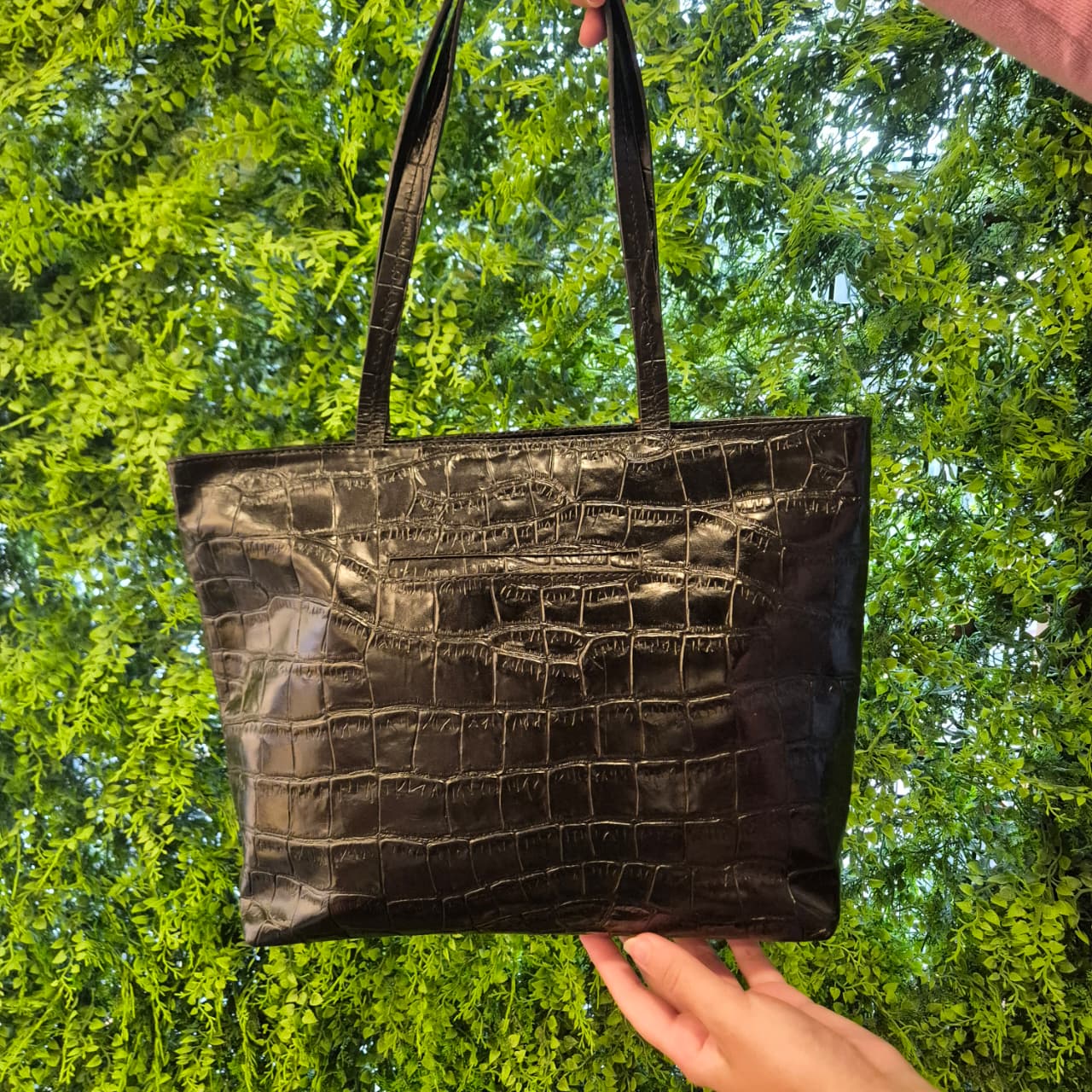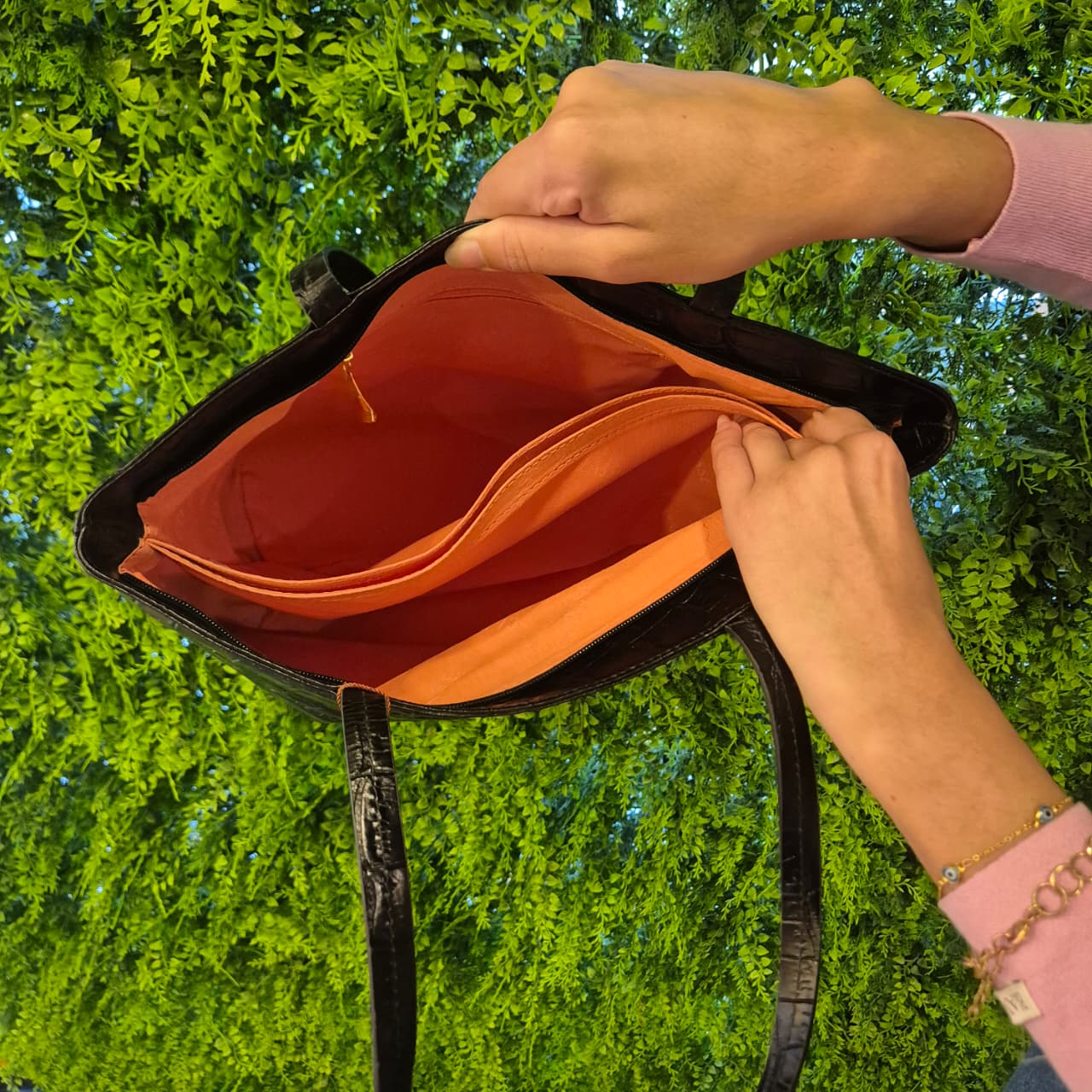 A Shopping Bag Bárbara, possui forro interno personalizado, bolso auxiliar, fechamento por zíper e assinatura em metal CLASSE.