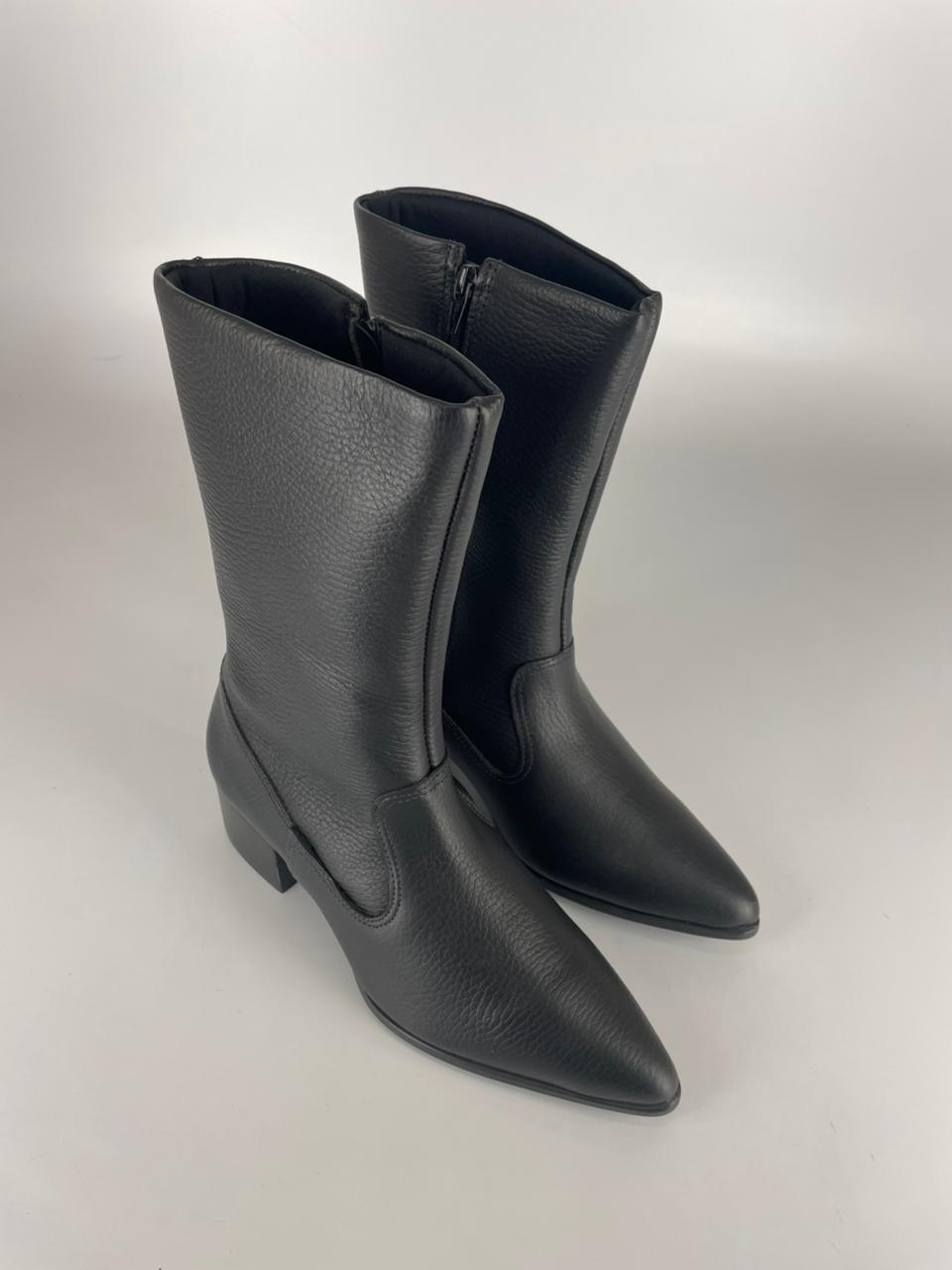 Essa bota é o equilíbrio perfeito entre a estética western contemporânea e o minimalismo urbano. Com um cano médio estruturado e bico fino, ela traz a sofisticação do couro texturizado para elevar qualquer look, do jeans básico à alfaiataria.