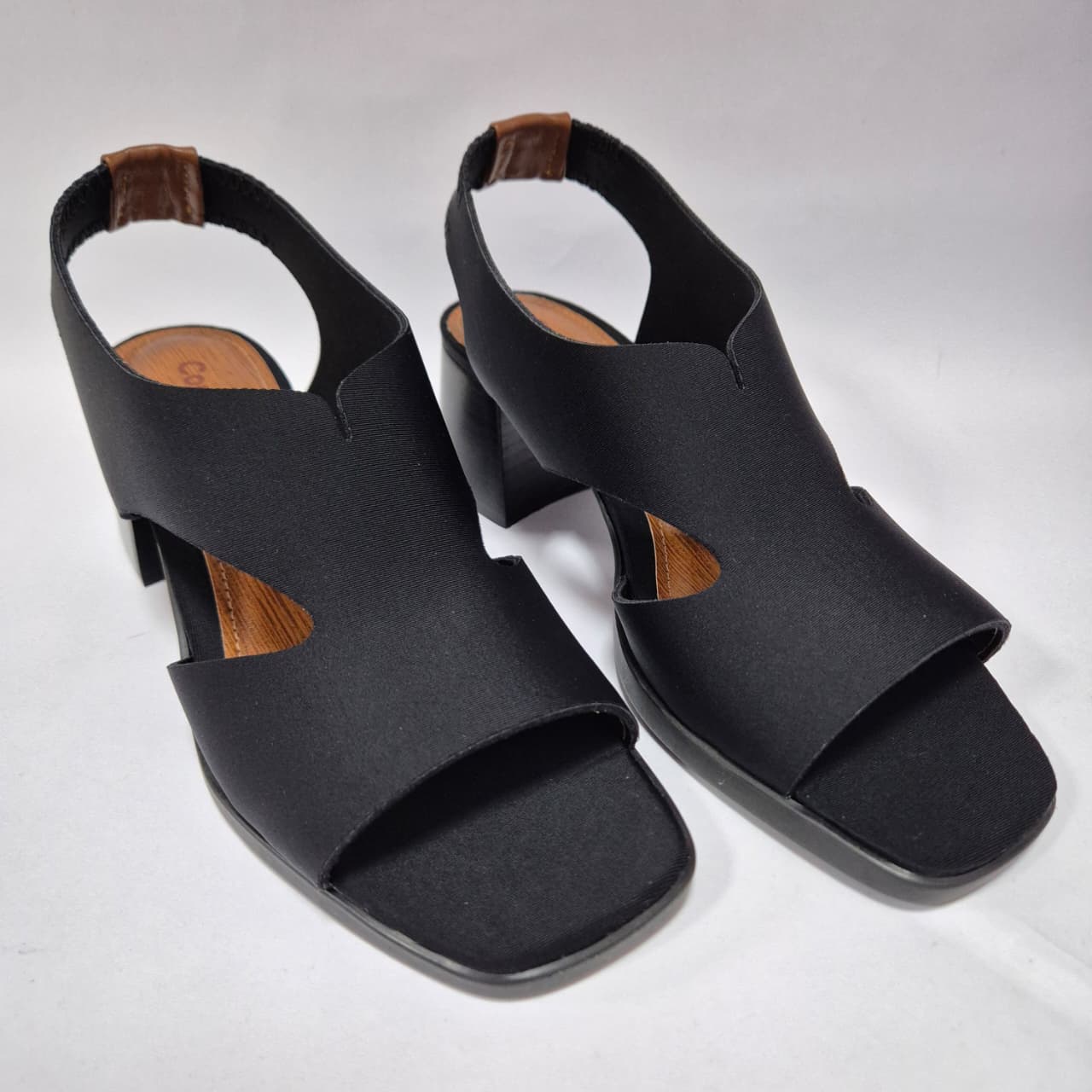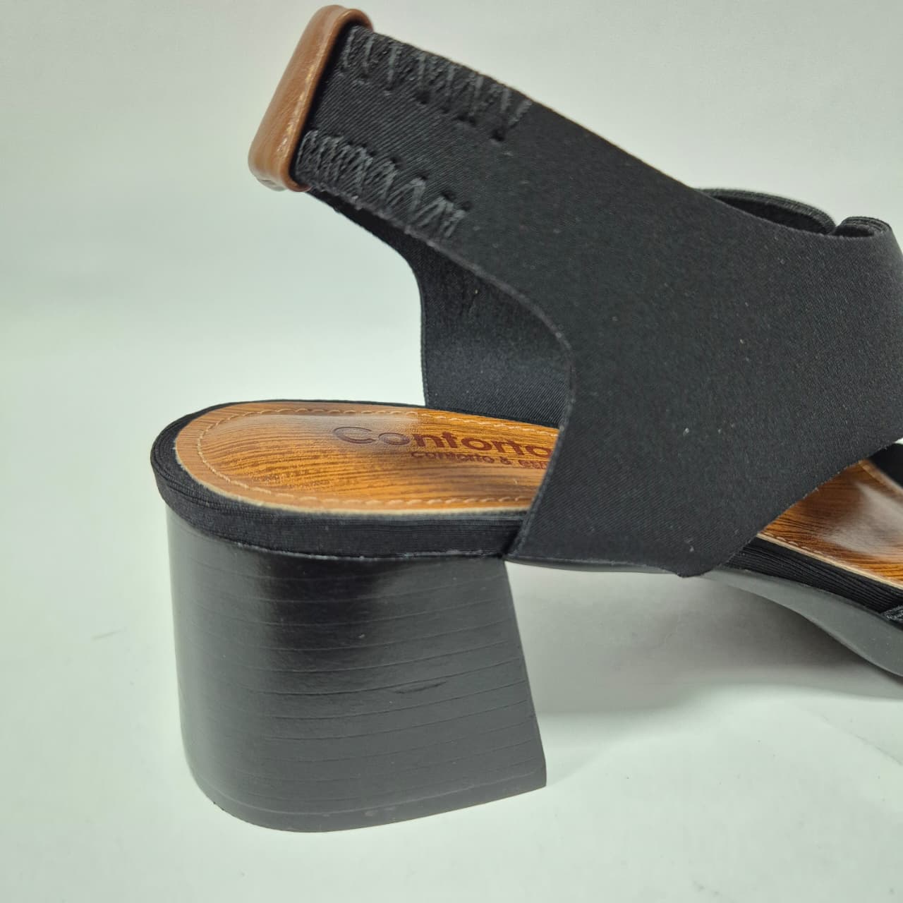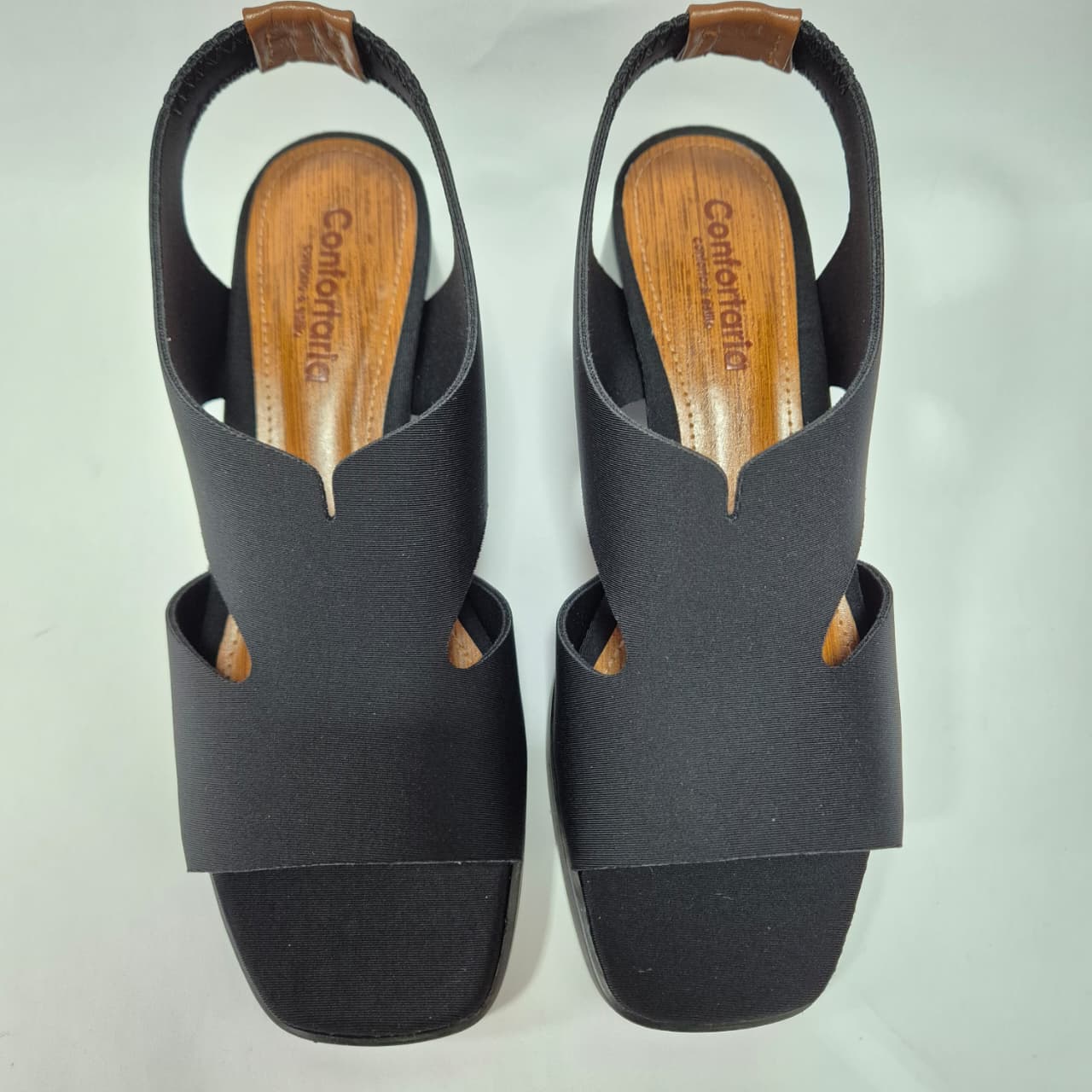 A sandália preta Confortaria combina o toque macio do neoprene com a elegância do couro, criando um modelo moderno e versátil para o dia a dia. O salto bloco anatômico garante estabilidade e leveza, enquanto o cabedal elástico abraça o pé com conforto absoluto.