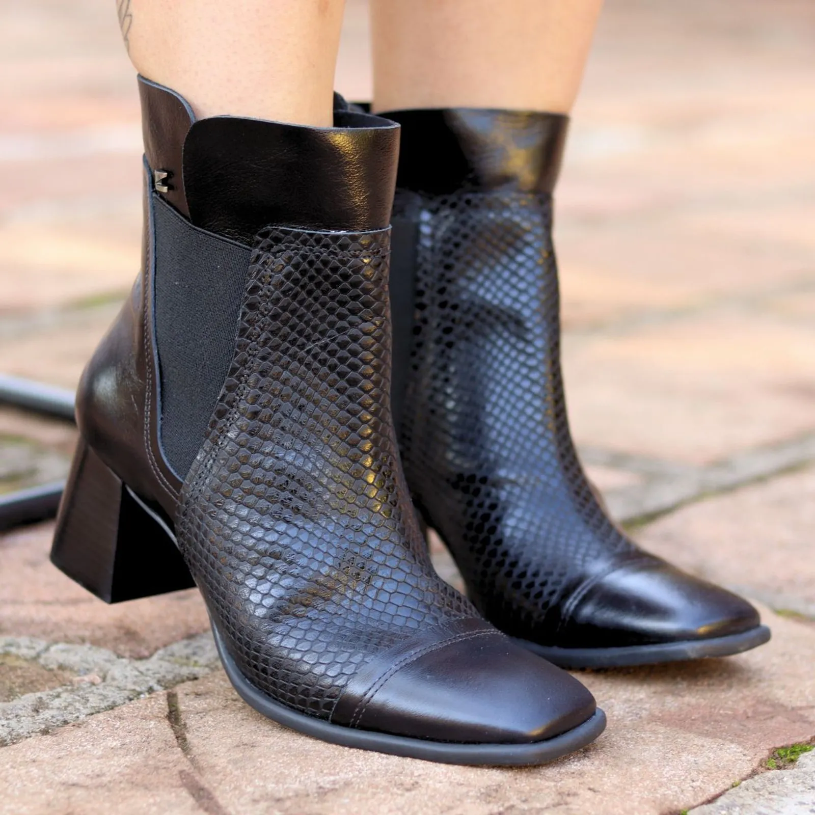 Seu bico quadrado adiciona um toque de estilo retrô, além de proporcionar maior conforto aos dedos. O cano médio, aliado ao ajuste lateral em elástico, garante praticidade no calce e um ajuste perfeito aos pés. O acabamento texturizado no couro dá um charme extra ao modelo, conferindo um visual refinado e sofisticado.
