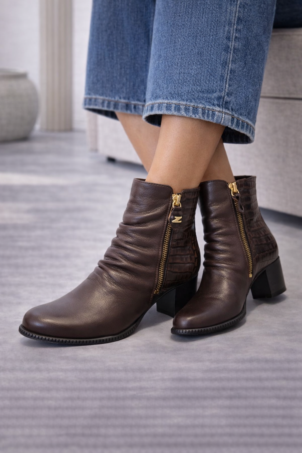 Bota Dinamirtz – Café em couro de cabra com detalhe croco e salto bloco