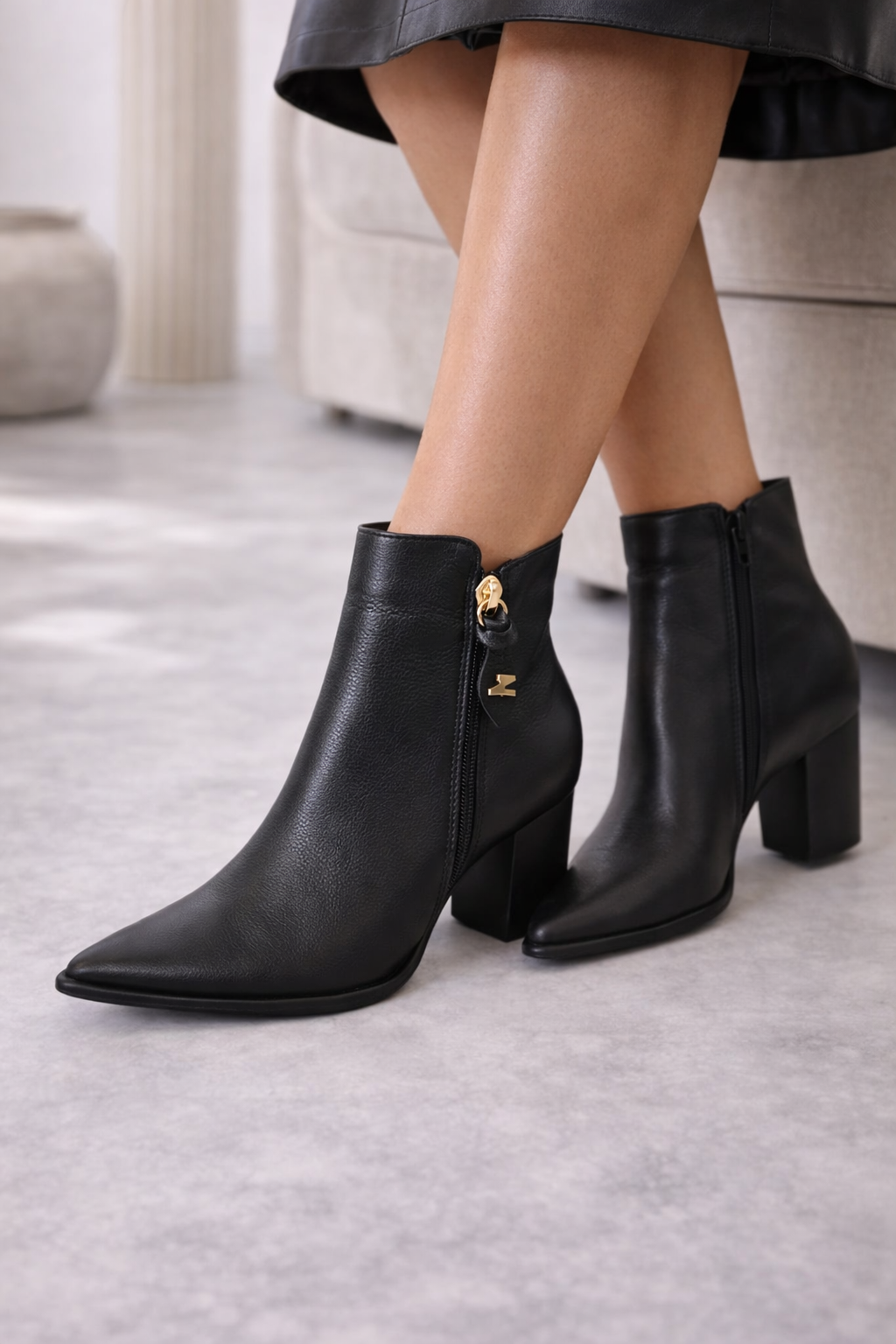 O salto bloco médio oferece estabilidade e conforto ao caminhar, ideal para o uso prolongado no dia a dia. O zíper lateral facilita o calce e traz praticidade, enquanto o detalhe metálico discreto adiciona um toque refinado e elegante ao design.