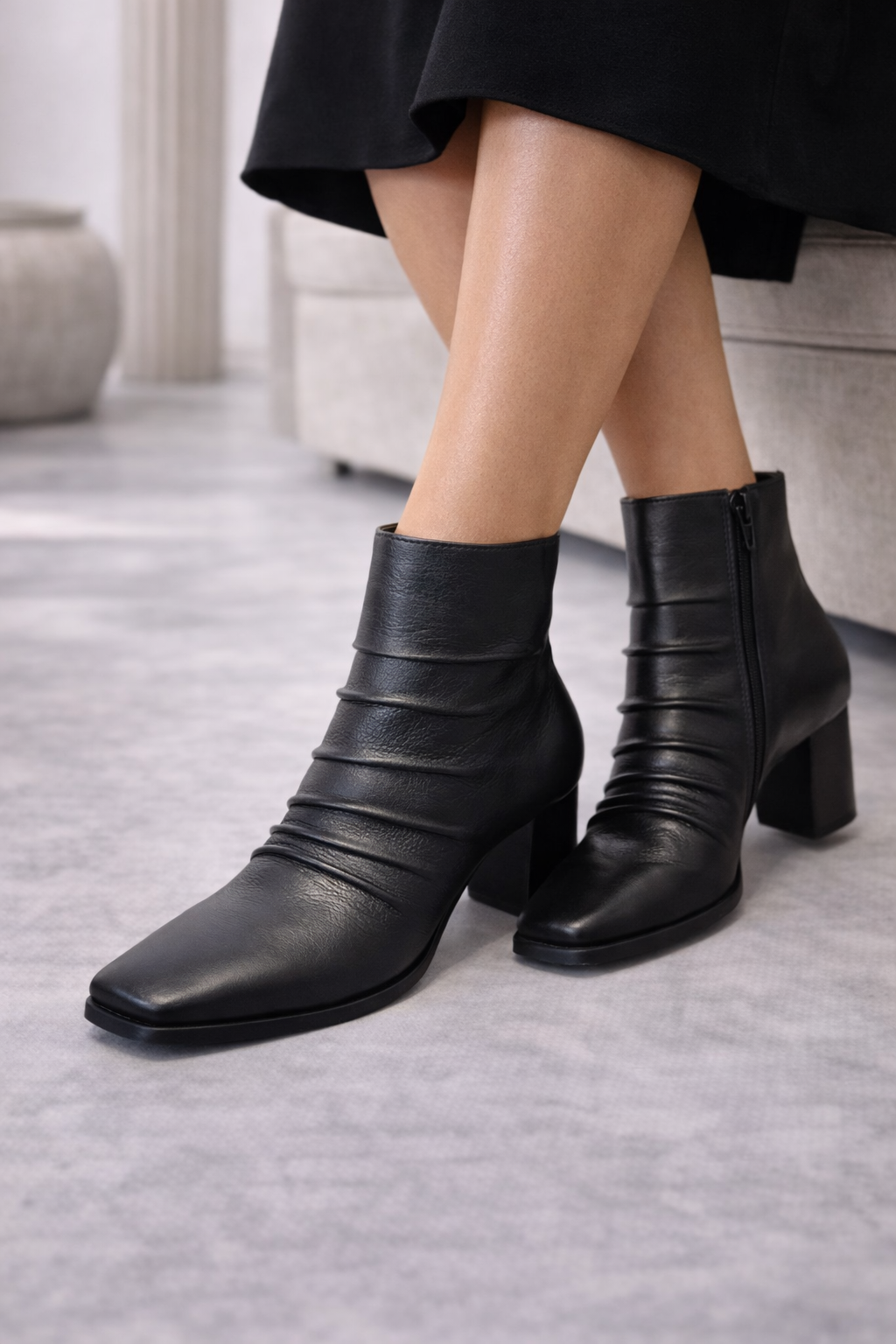 O design traz recortes drapeados no cabedal, que adicionam textura e movimento ao visual, criando um efeito moderno e refinado. O salto bloco médio oferece estabilidade e conforto, enquanto o zíper lateral facilita o calce e garante praticidade no dia a dia.