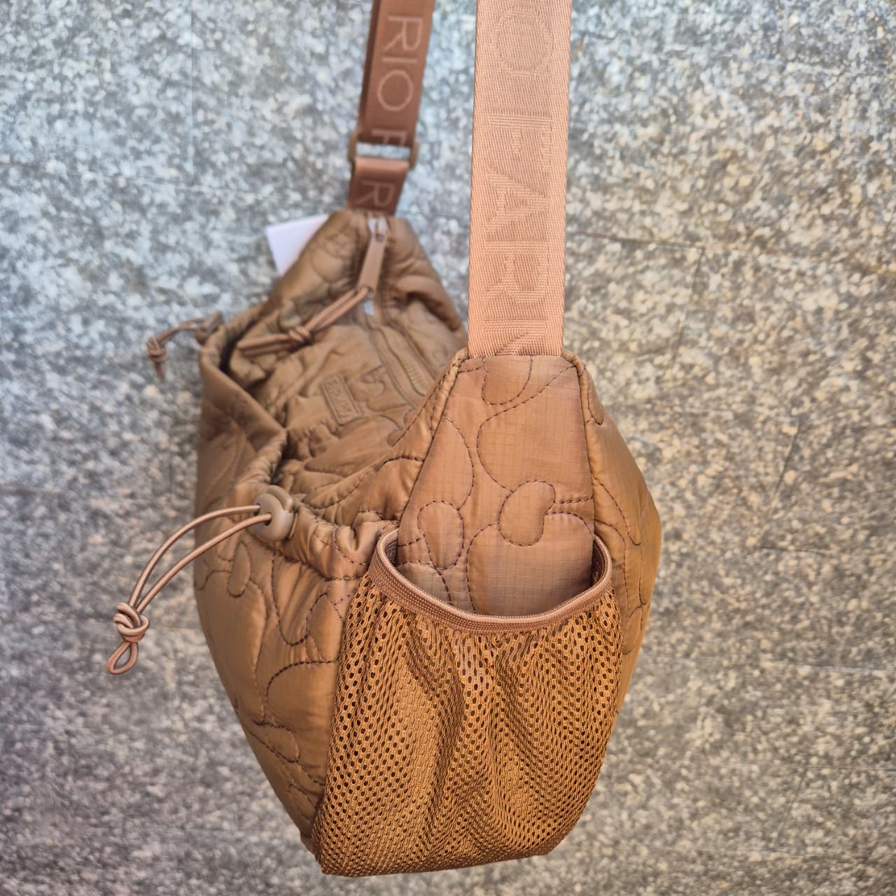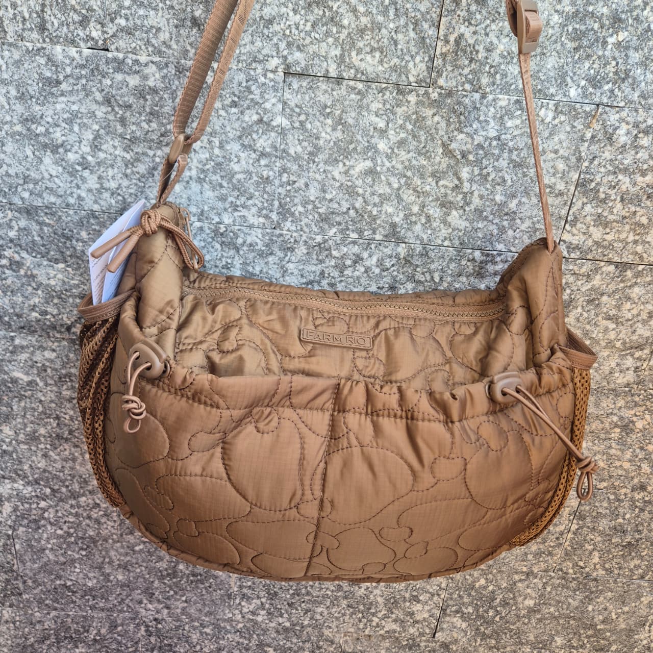 Bolsa produzida em nylon. A peça possui tamanho grande, compartimento interno, efeito puffer, estampa figurativa de caju em relevo, bolsos frontais embutidos com cordão ajustável, bolsos laterais em tela de mesh, tag da marca aplicada na parte frontal, alça longa ajustável com nome da marca em relevo e fechamento por zíper.