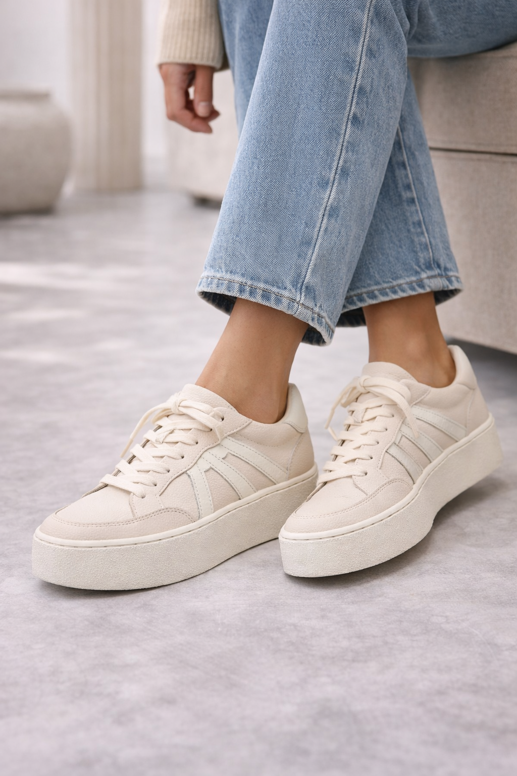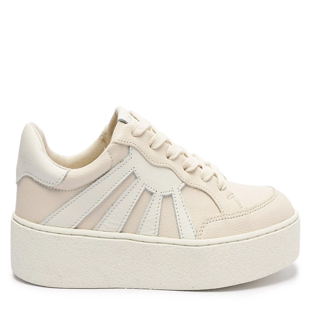 O modelo conta com solado plataforma, que garante um visual atual e proporciona mais conforto e estabilidade ao caminhar. O cabedal apresenta recortes e pespontos que valorizam o design, enquanto o fechamento por cadarço assegura ajuste ideal aos pés.