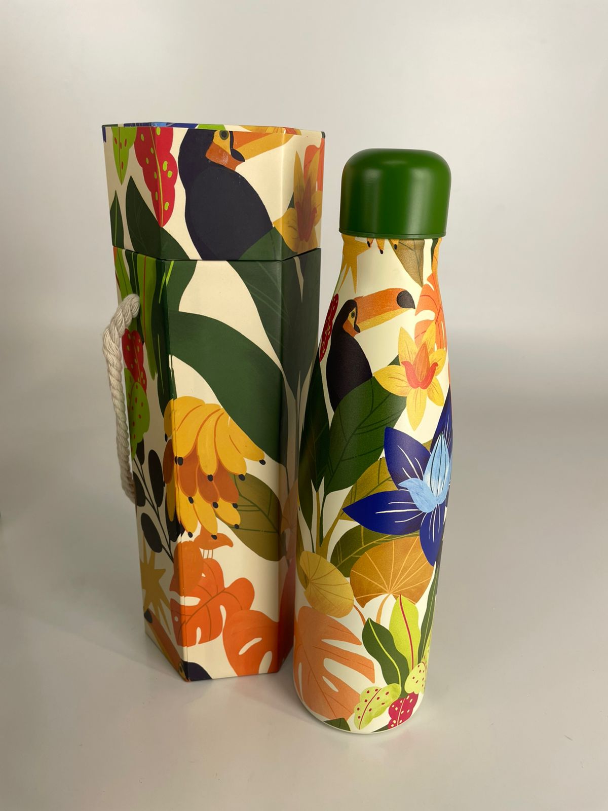 Esta é a Garrafa Térmica Farm Sunset 500ml, a combinação perfeita de funcionalidade e o design vibrante que você já ama na nossa linha de bolsas. Com uma estampa solar que destaca o tucano e elementos da nossa flora, ela traz a energia do verão brasileiro para a sua rotina de hidratação. Seu formato clássico e elegante, aliado à grande capacidade, faz dela a escolha ideal para quem precisa de refresco o dia todo com muito charme.
