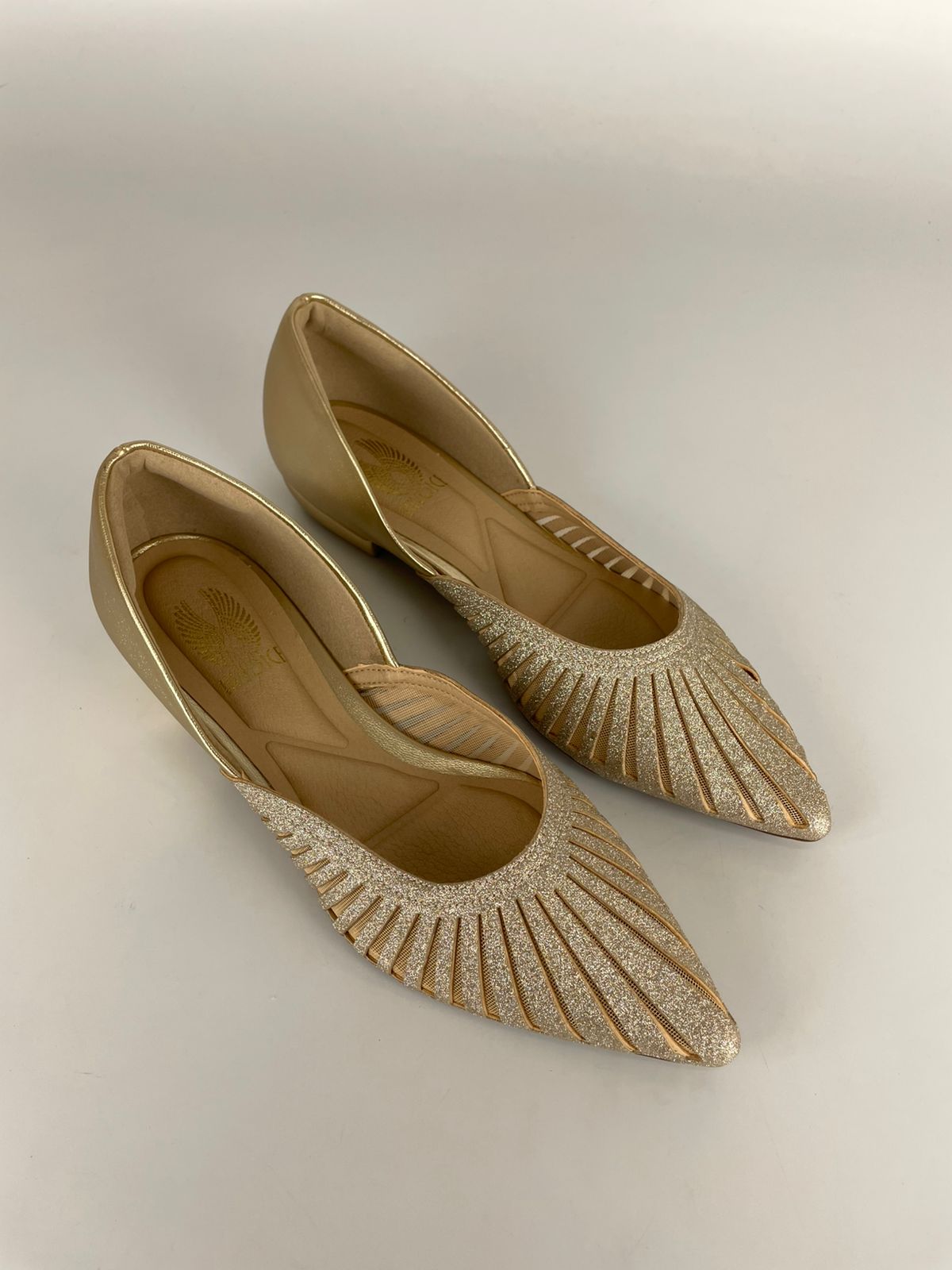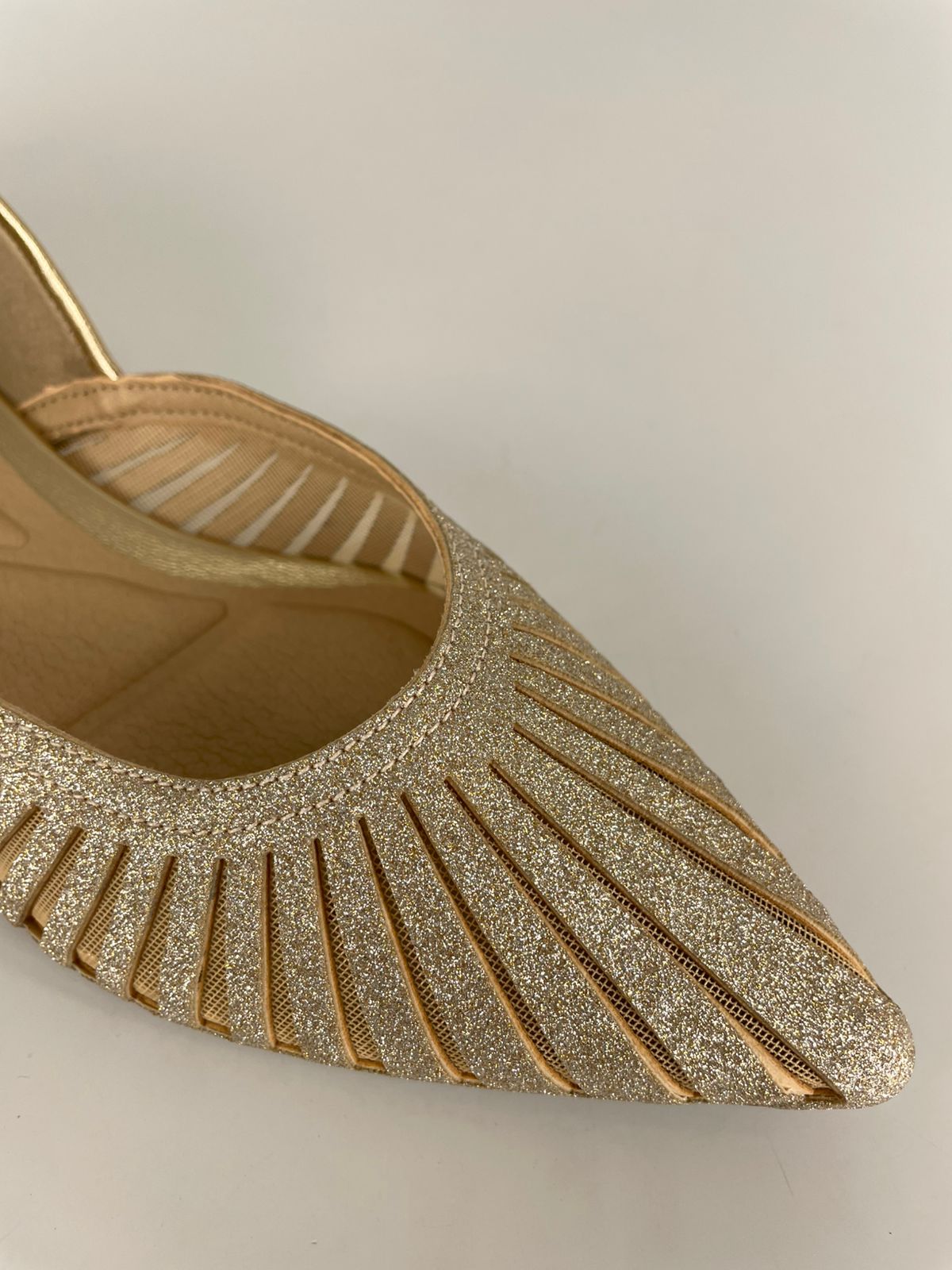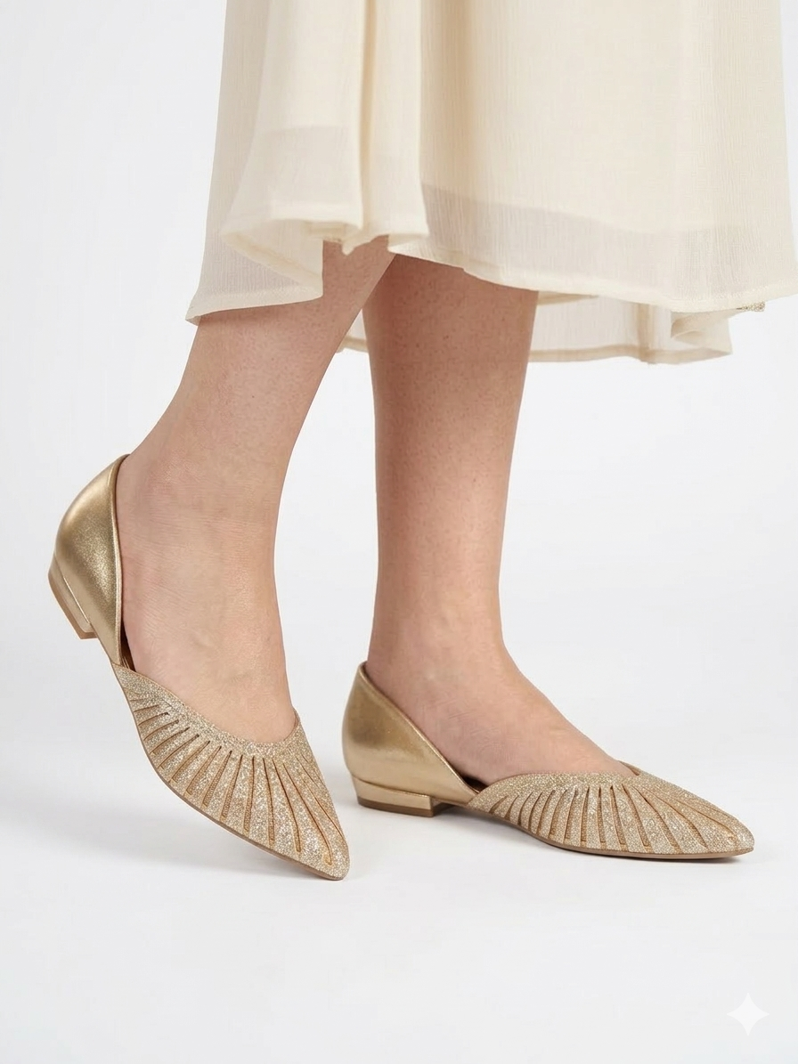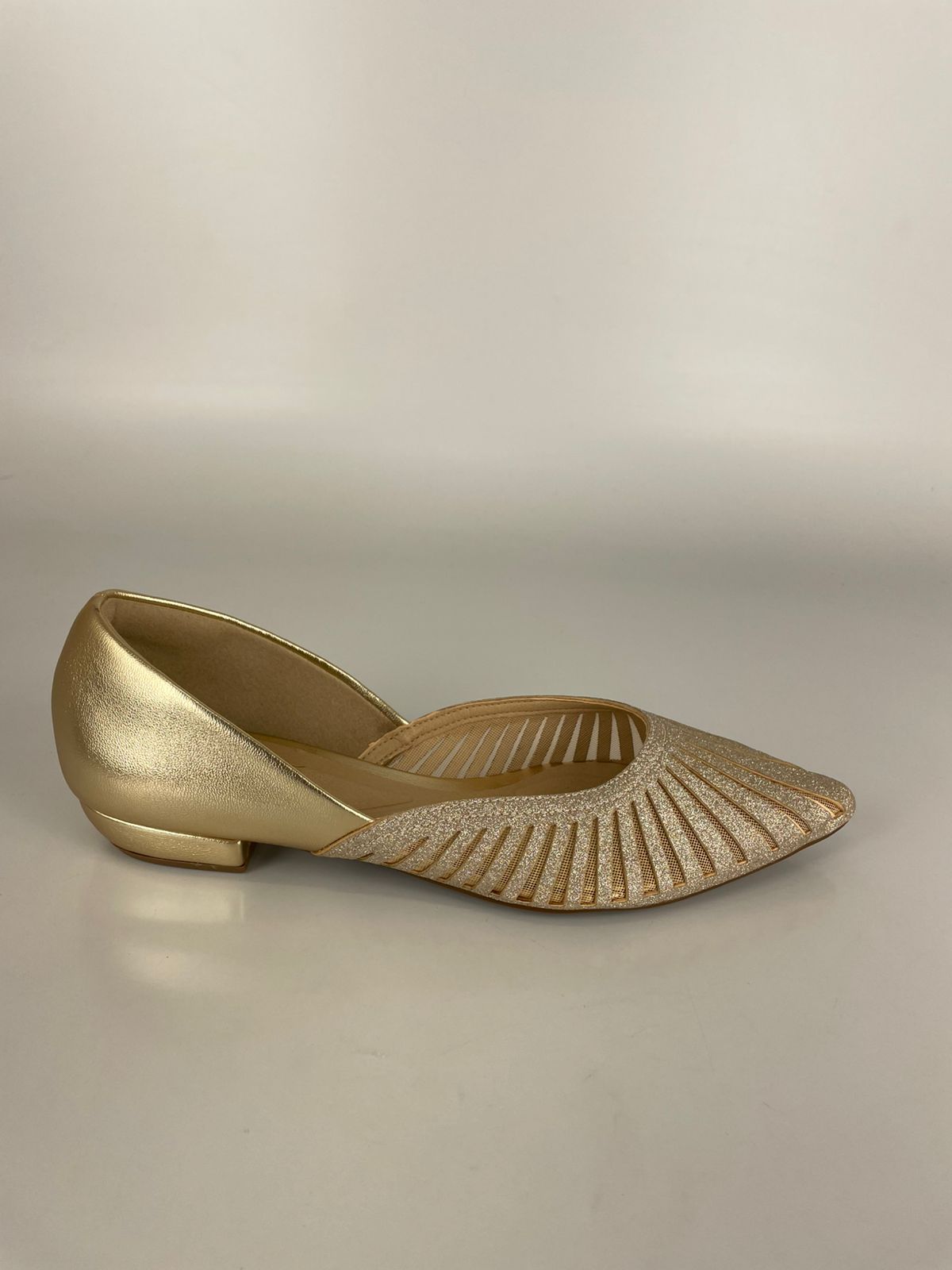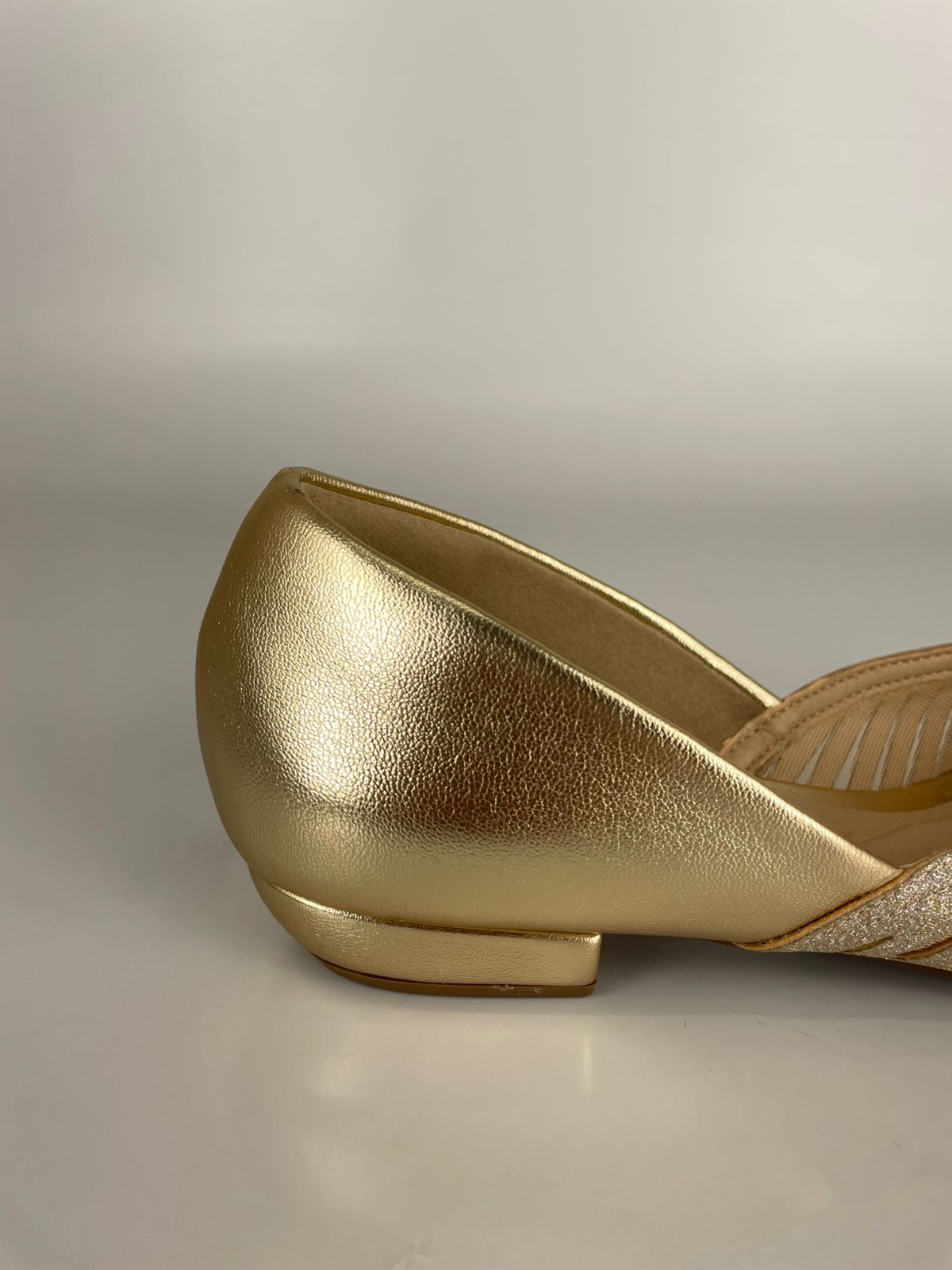 Dê um passo em direção ao luxo e à sofisticação com a nossa Sapatilha D’Orsay Shine Gold. Este modelo rasteiro redefine a elegância ao unir o design atemporal de bico fino com a textura plissada em glitter dourado, criando um calçado que é, ao mesmo tempo, moderno e refinado.