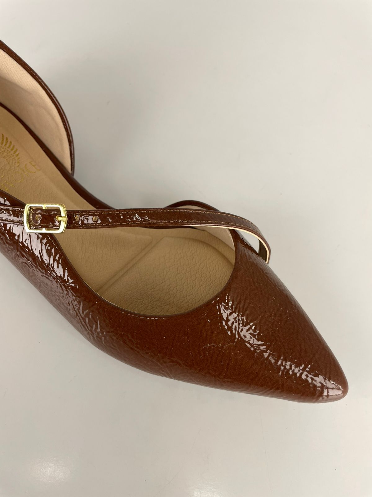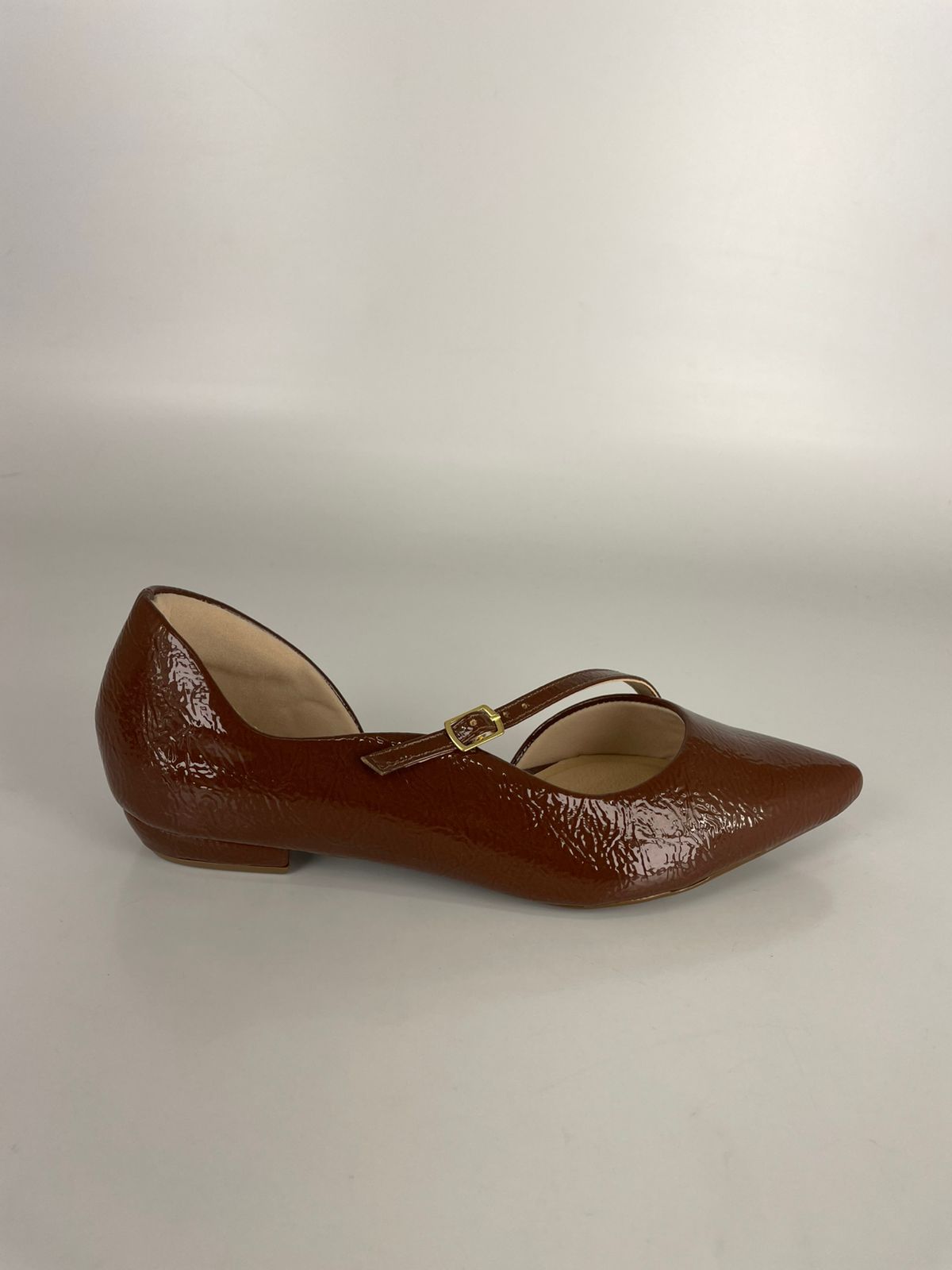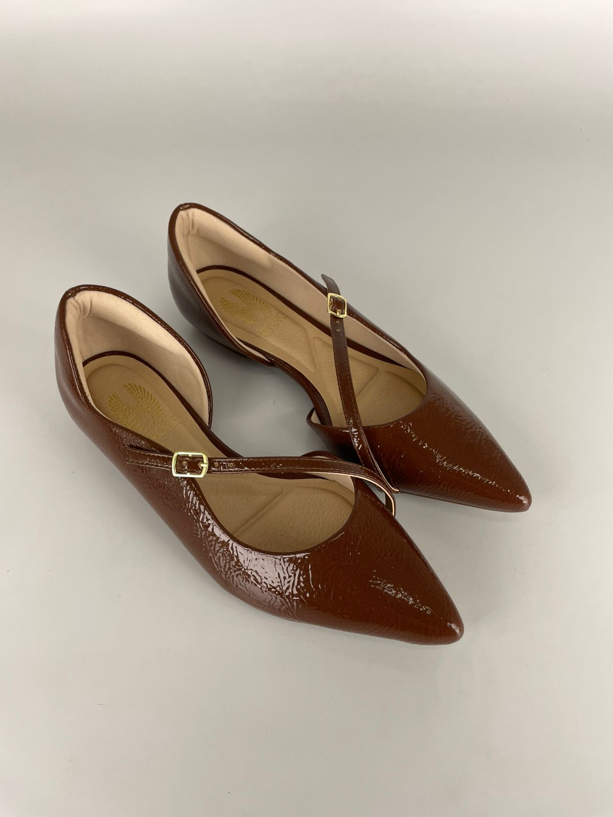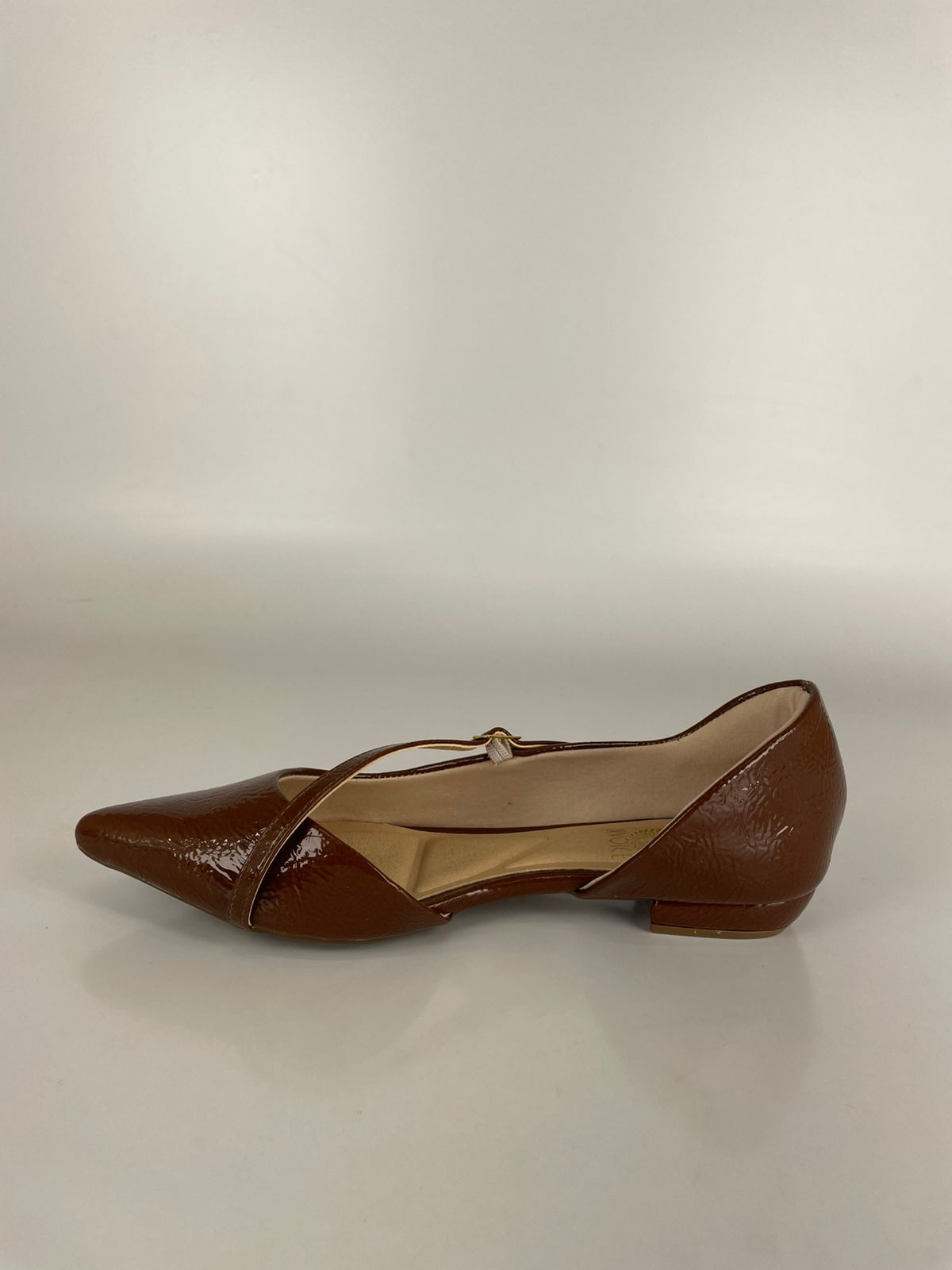 Confeccionada em verniz de alta qualidade, a sapatilha exibe um acabamento de brilho intenso que reflete a luz de forma sofisticada. O design D’Orsay aberto nas laterais alonga a silhueta, enquanto a elegante tira fina em verniz Nogueira cruza o peito do pé com segurança, finalizada por uma delicada fivela dourada que adiciona um toque de luxo minimalista.