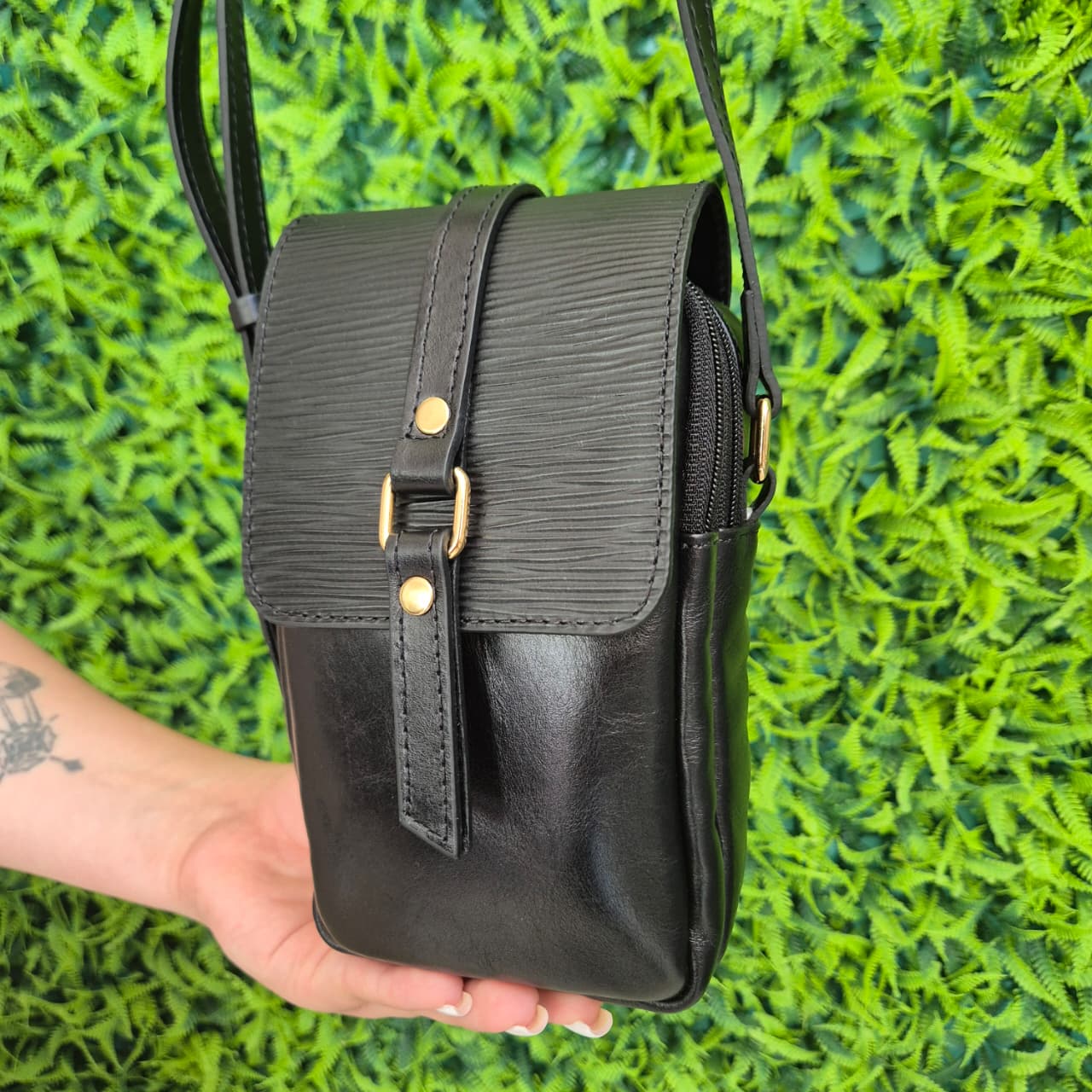 Produzida em couro, com acabamento artesanal de excelência: forro bege, ferragens em tom ouro e bordas pintadas à mão. Uma peça feita no Brasil, que combina estilo e funcionalidade.