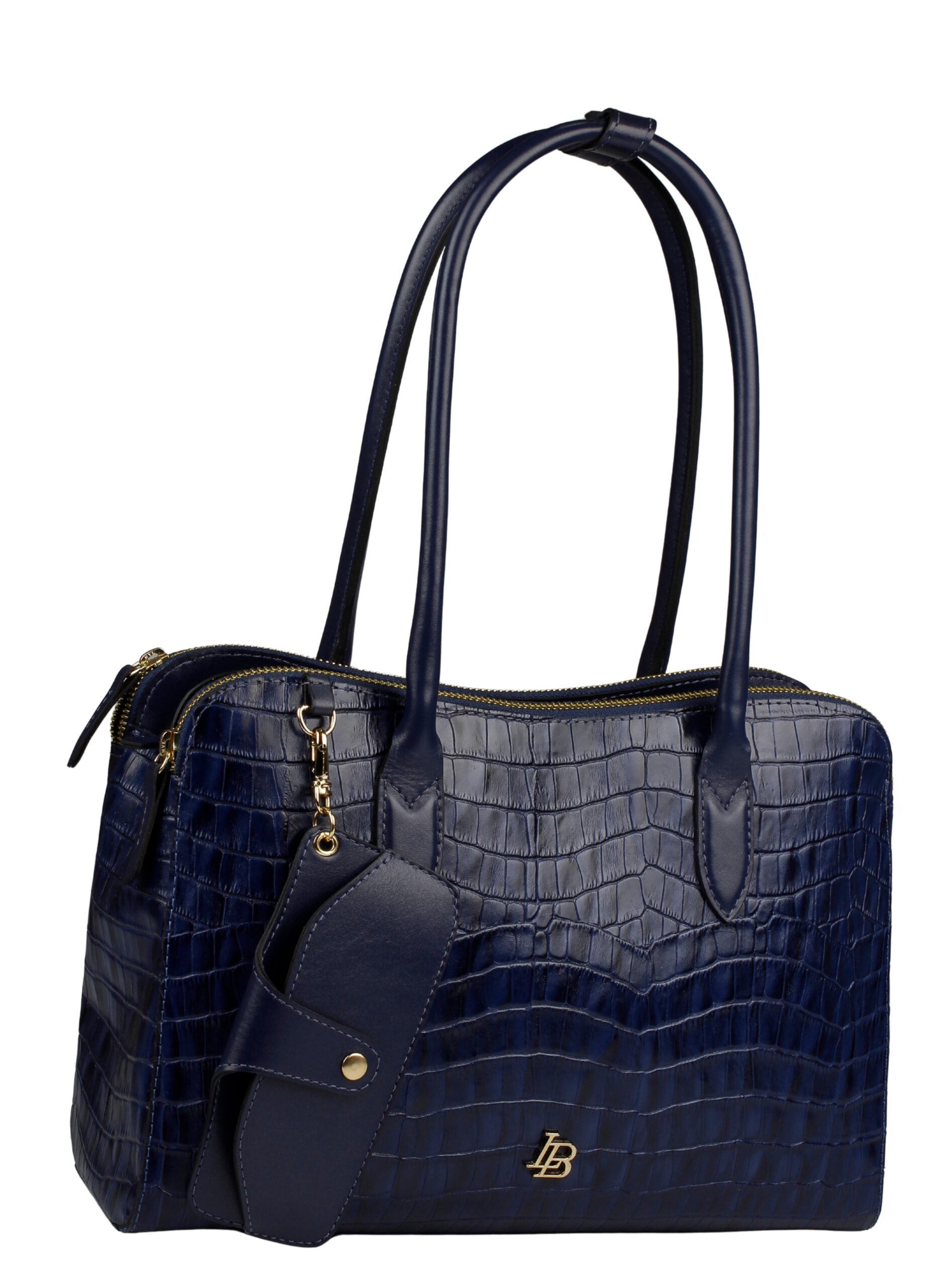 O tom azul marinho profundo (Navy) atua como um neutro poderosíssimo, oferecendo uma alternativa refinada ao preto tradicional. O corpo da bolsa apresenta uma estampa de crocodilo com brilho discreto, complementada por alças de ombro alongadas e finas que garantem um porte elegante. O detalhe funcional do porta-objetos externo removível, preso por uma delicada corrente dourada, une a praticidade ao design de alto padrão.