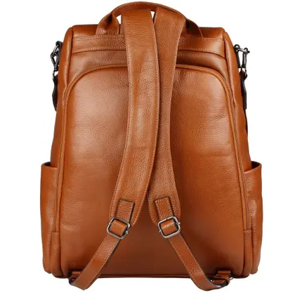Design estrutural e funcional com acabamento refinado. A abertura principal posicionada na parte posterior oferece mais segurança no uso diário. Possui bolso frontal com zíper de nylon, bolsos laterais funcionais e bolsos internos que organizam com discrição. A alça de ombro em fita é removível, e as alças traseiras contam com reguladores.